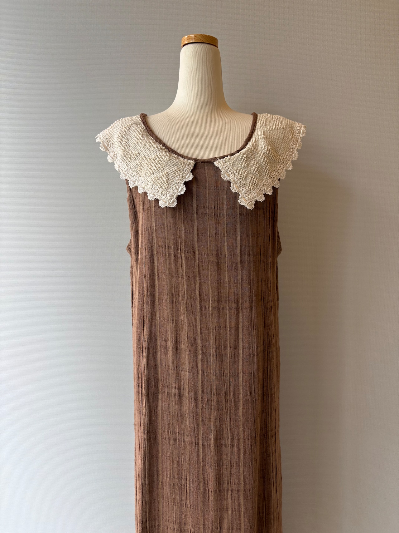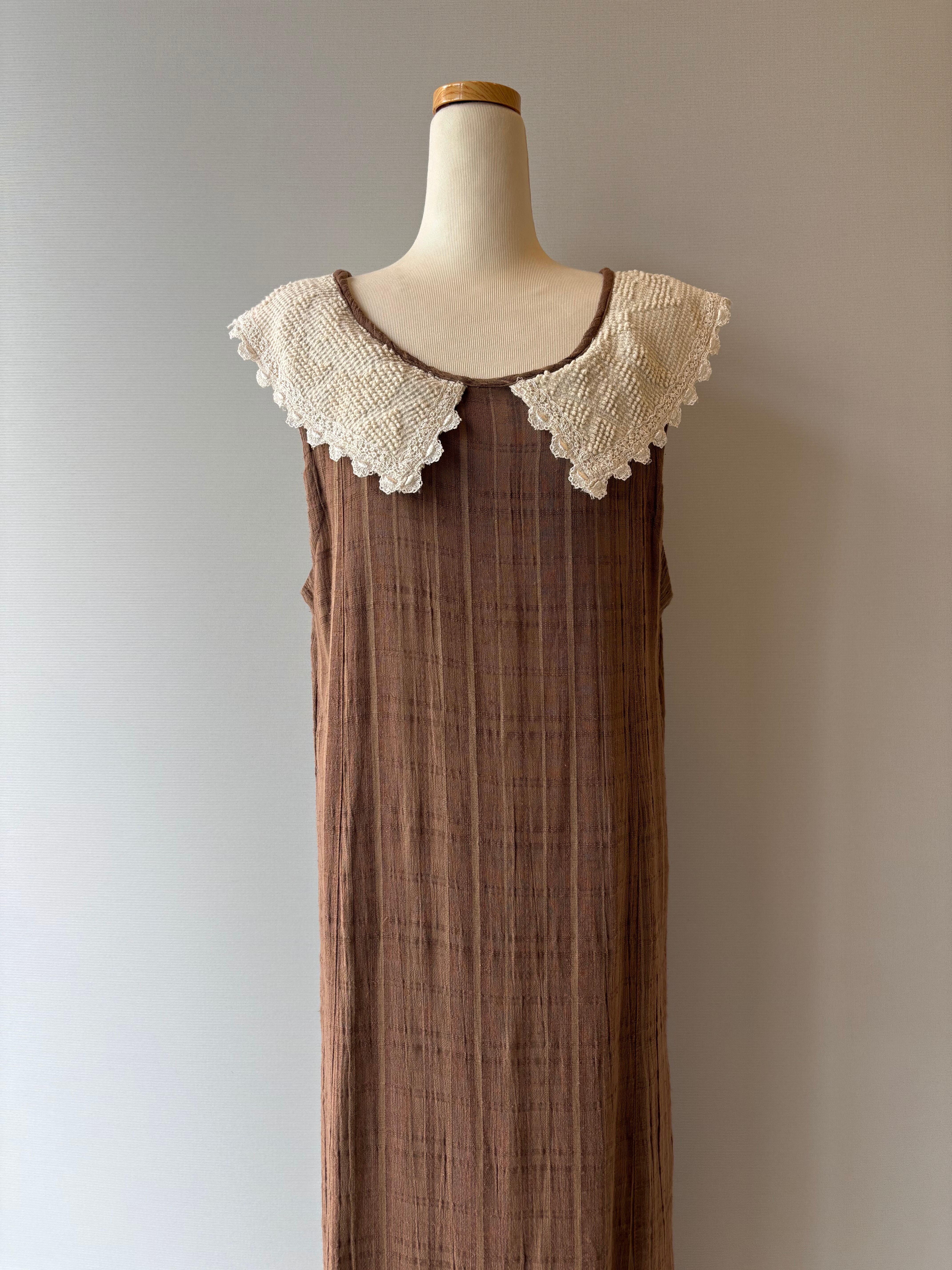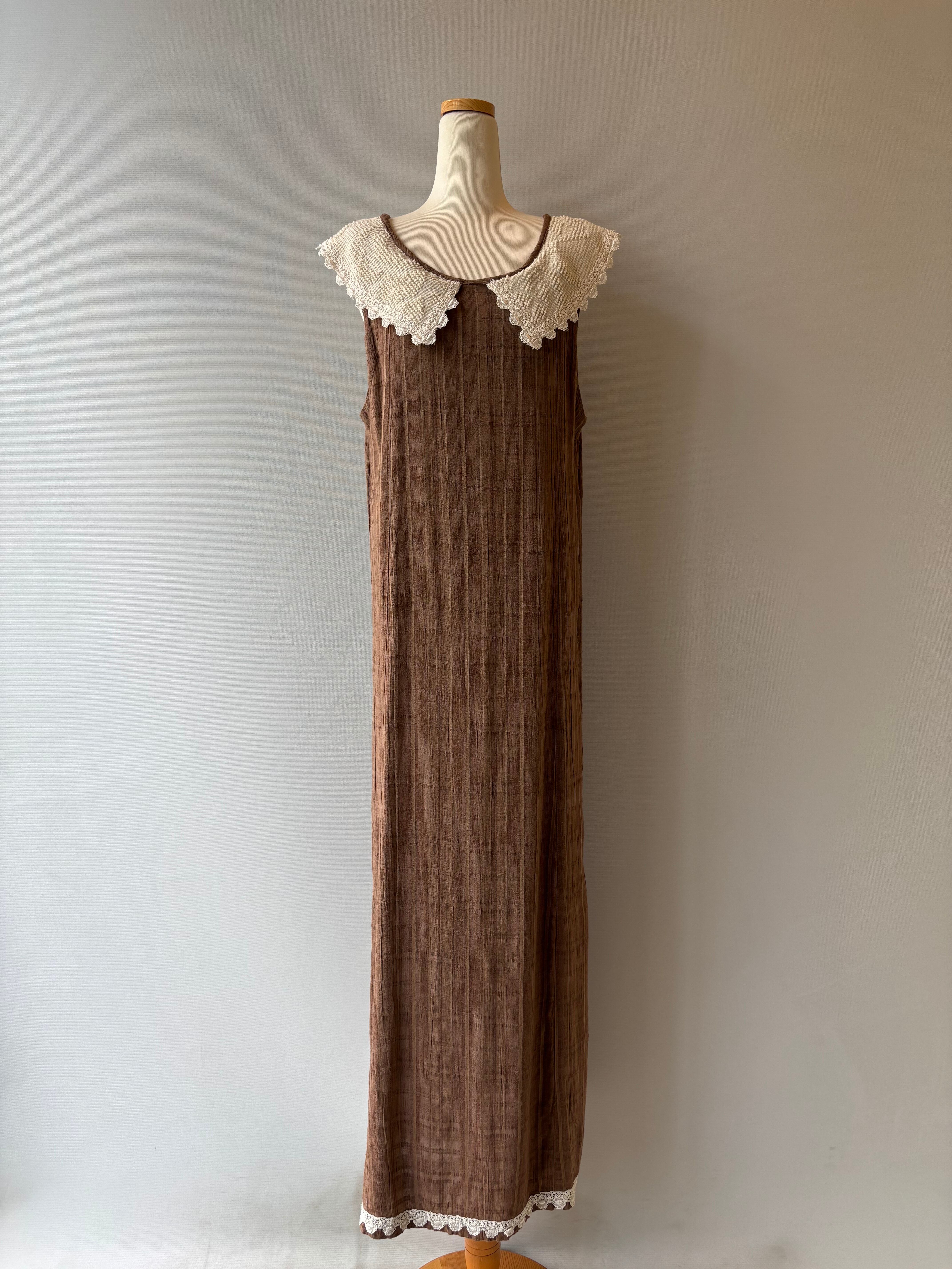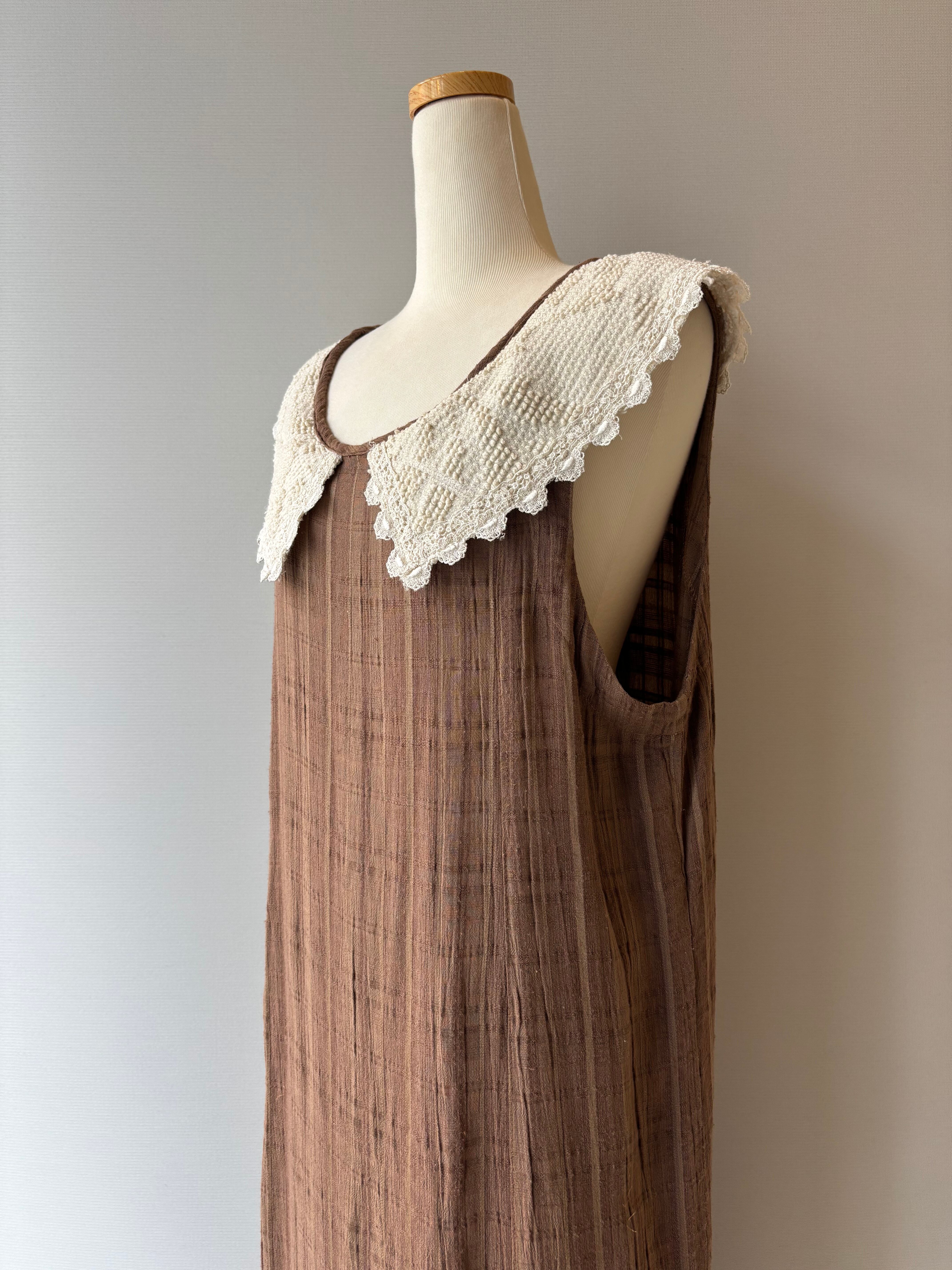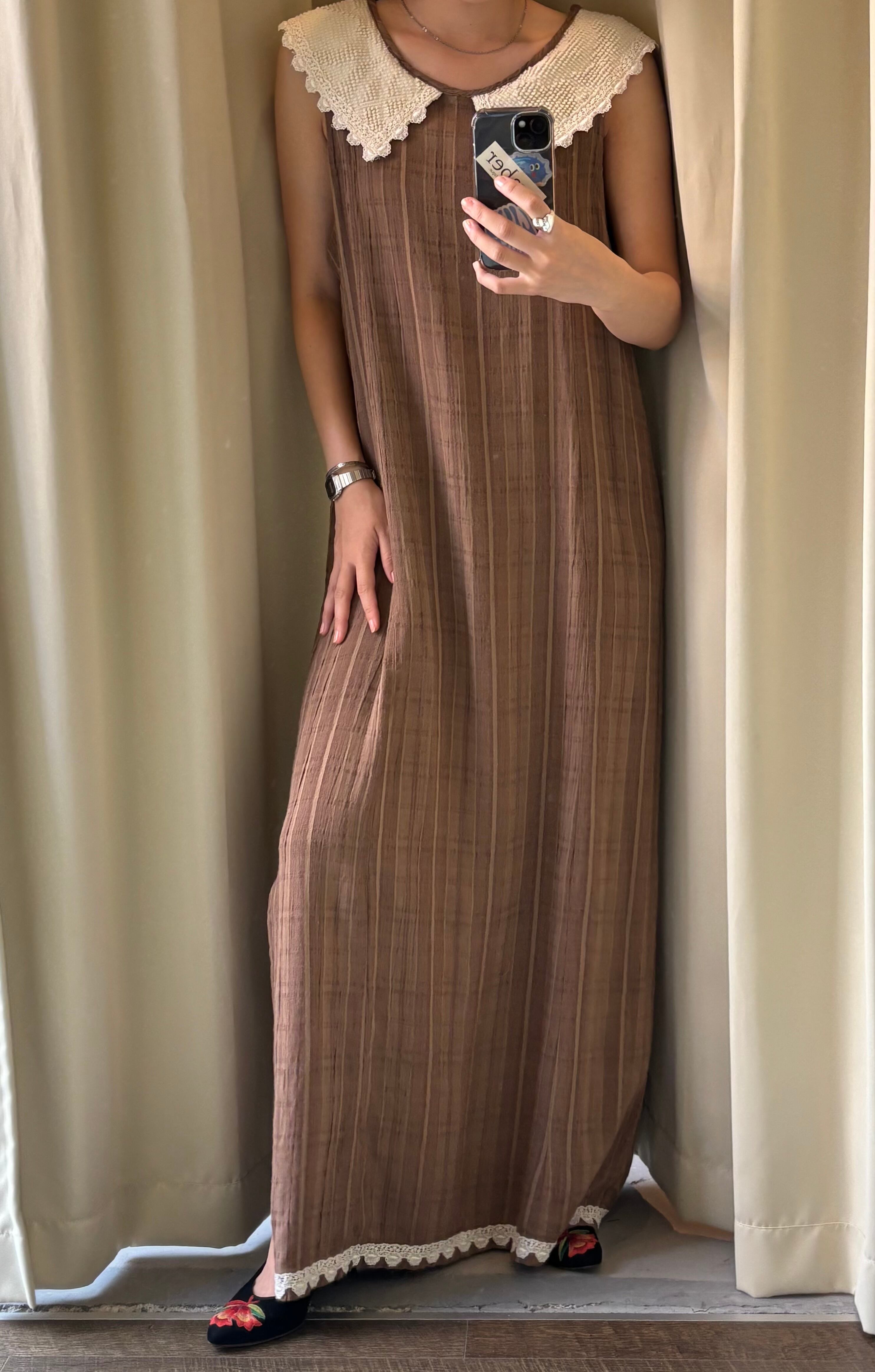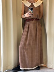 さりげないチェック柄のブラウン生地に、裾のレースとスリットがアクセント。夏に一枚でさらっと着られます◎
