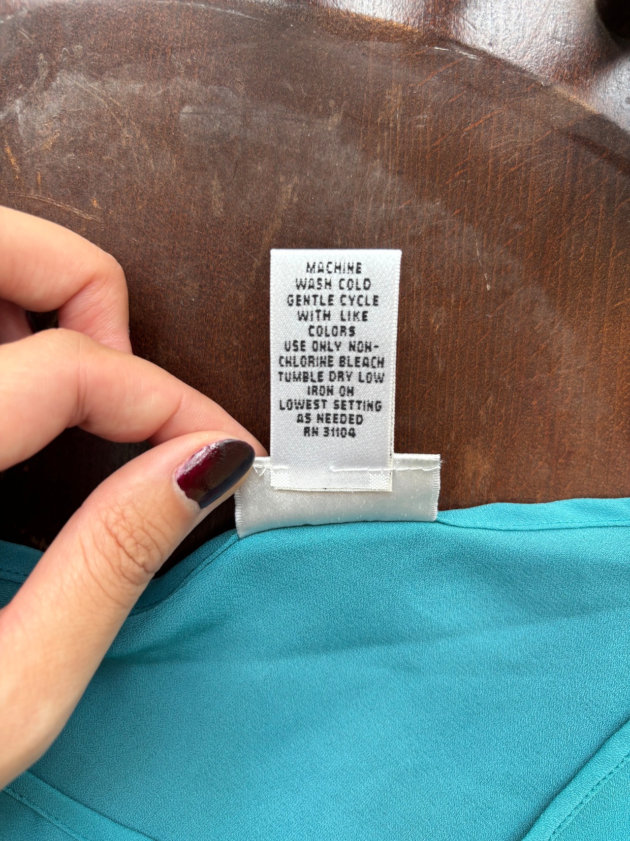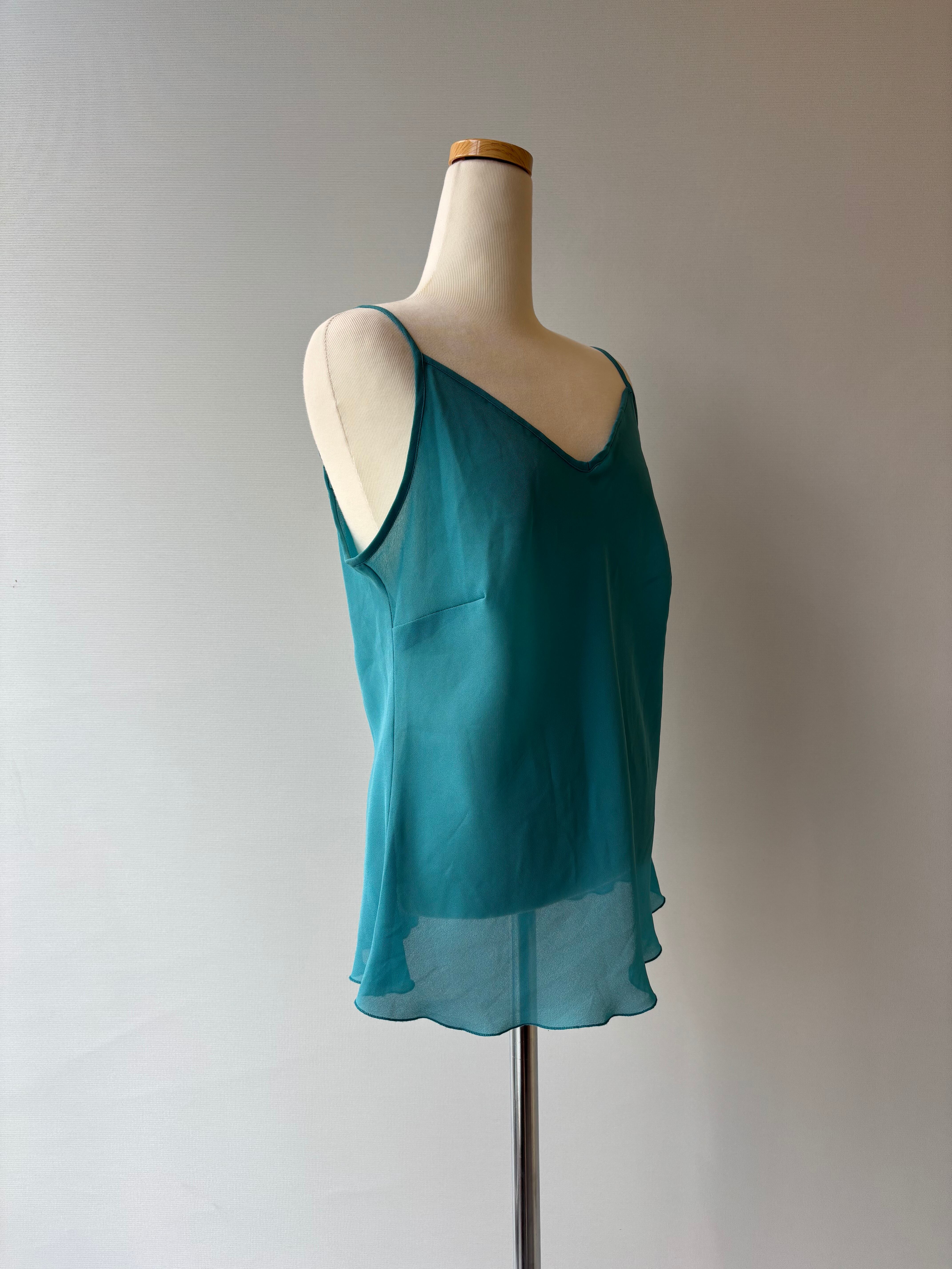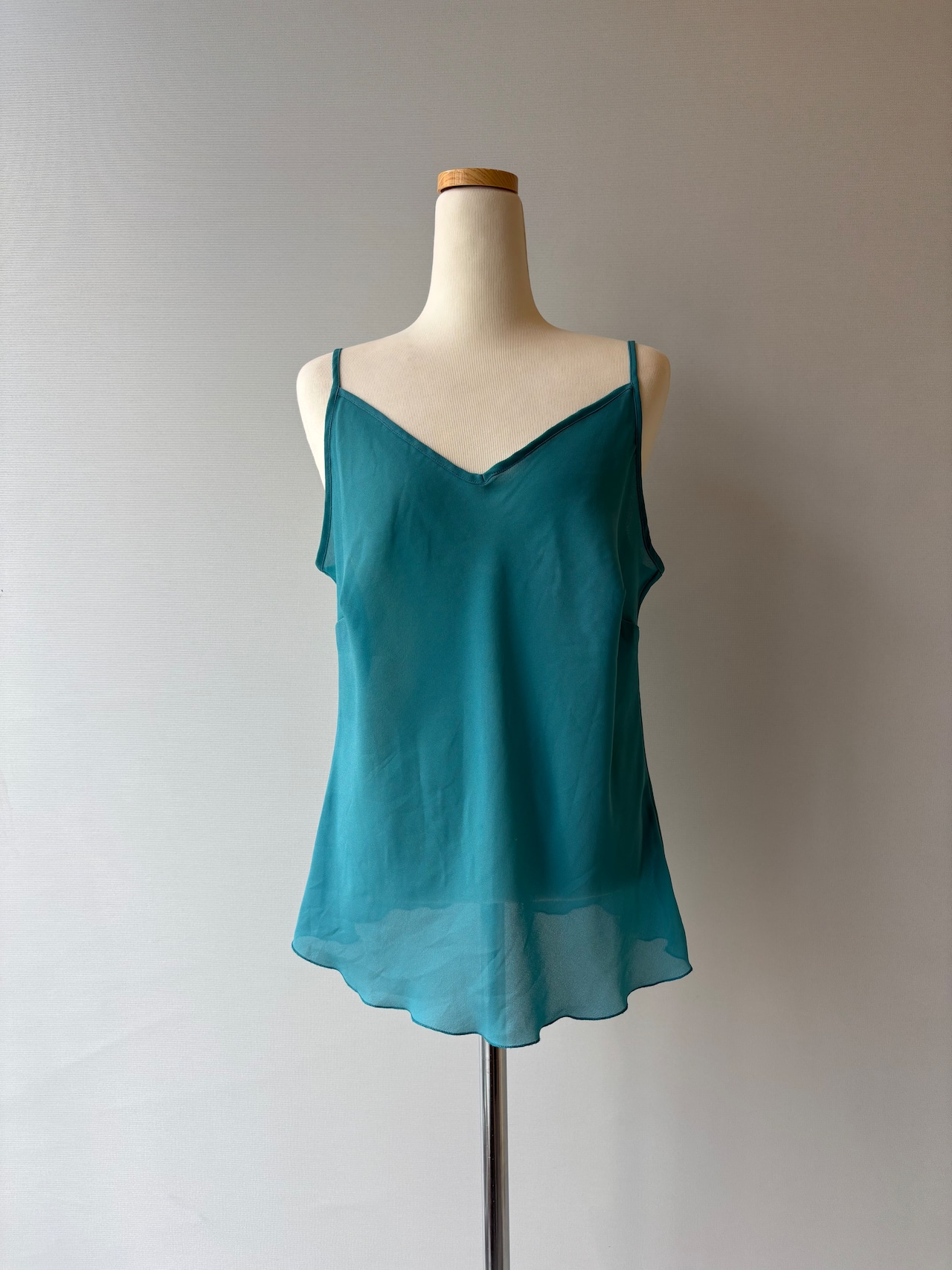 ターコイズブルーをくすませたような、落ち着いたトーンが魅力のキャミソール。