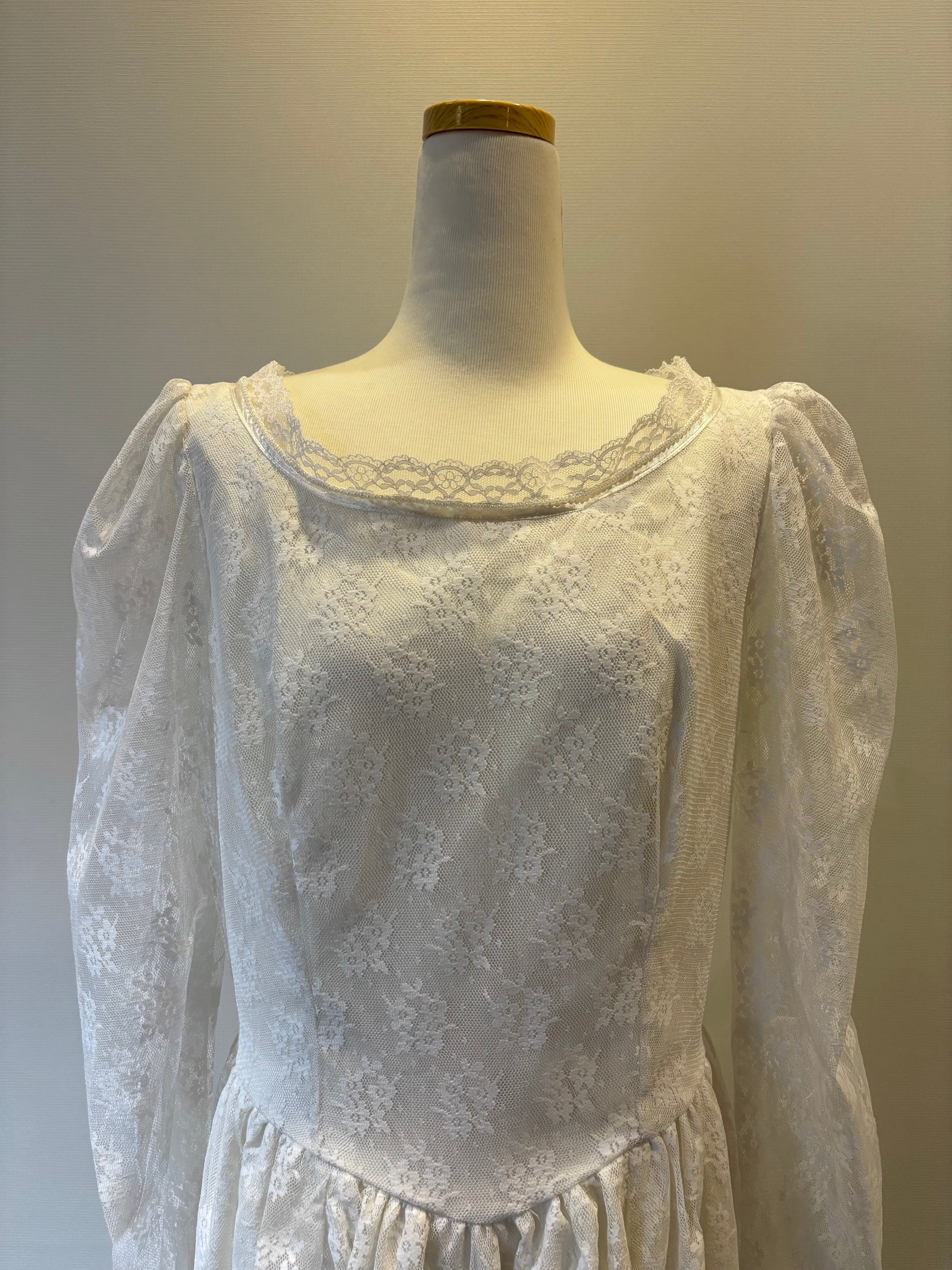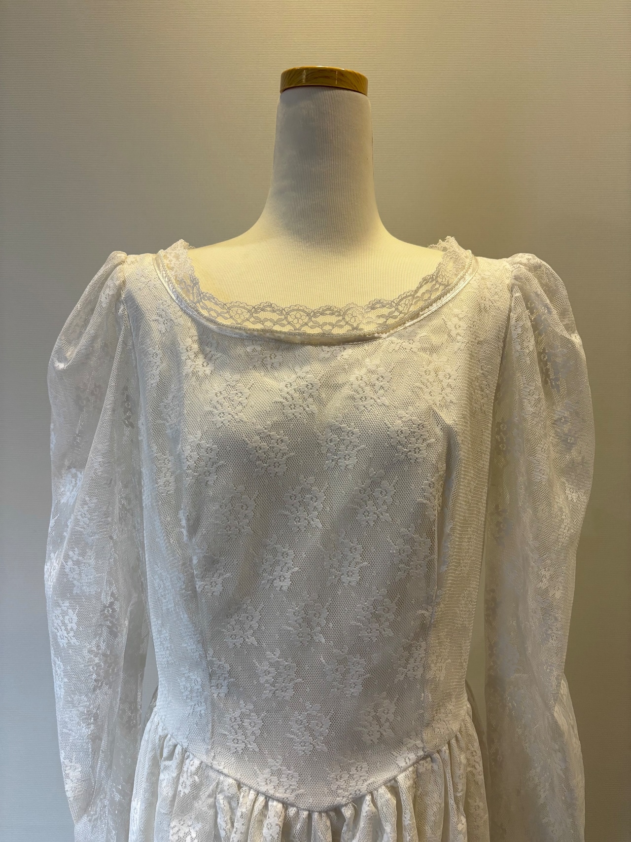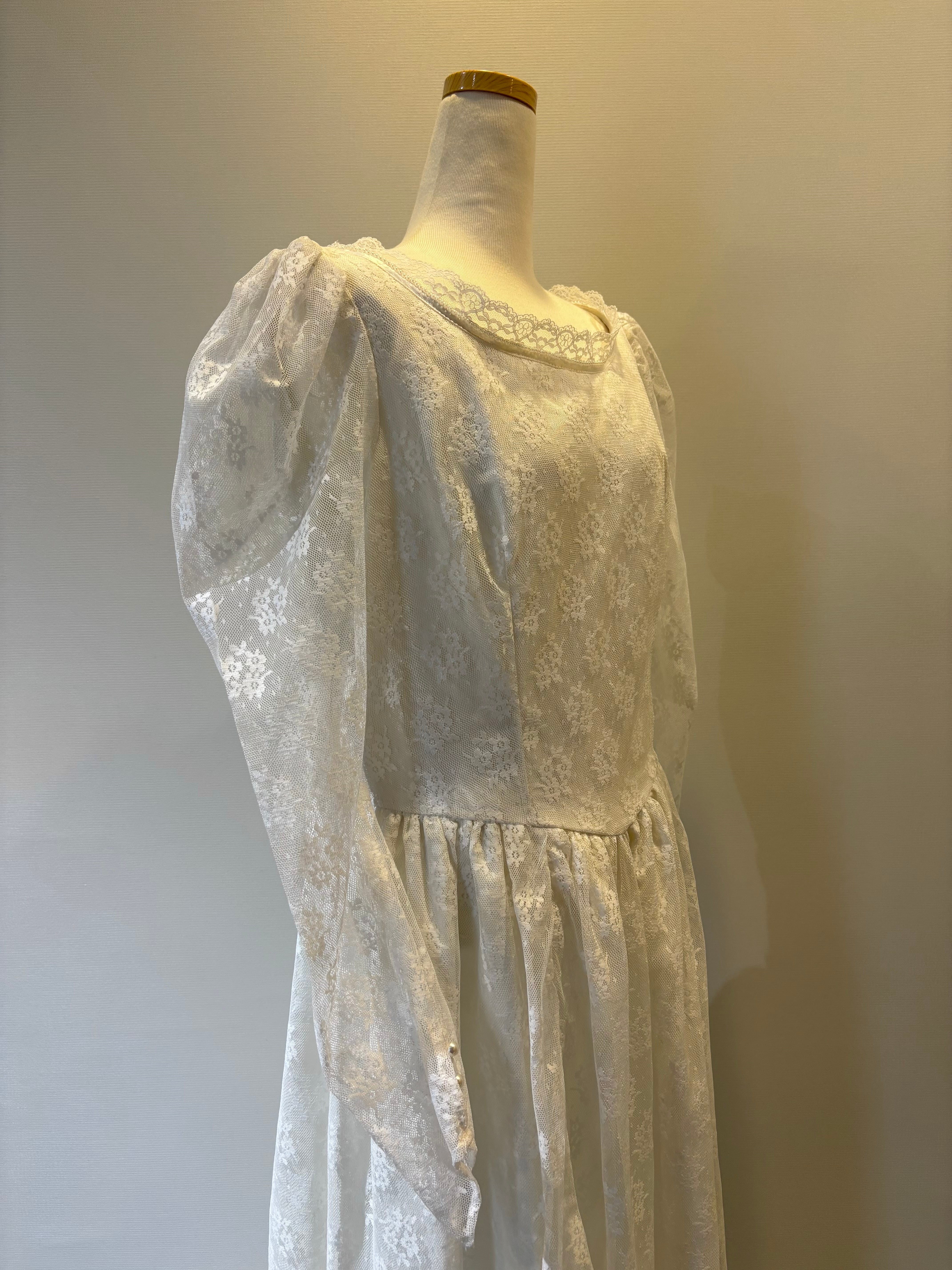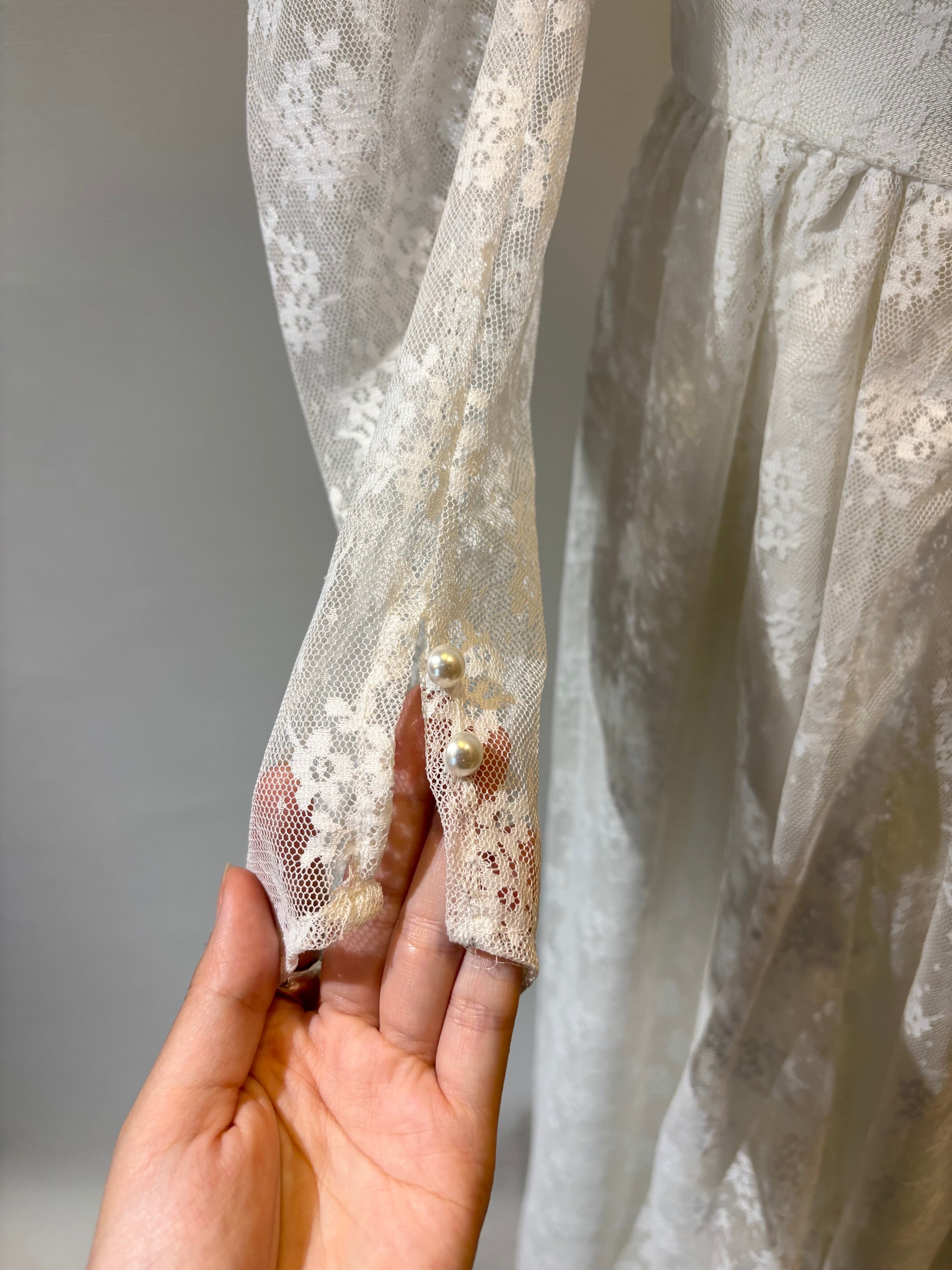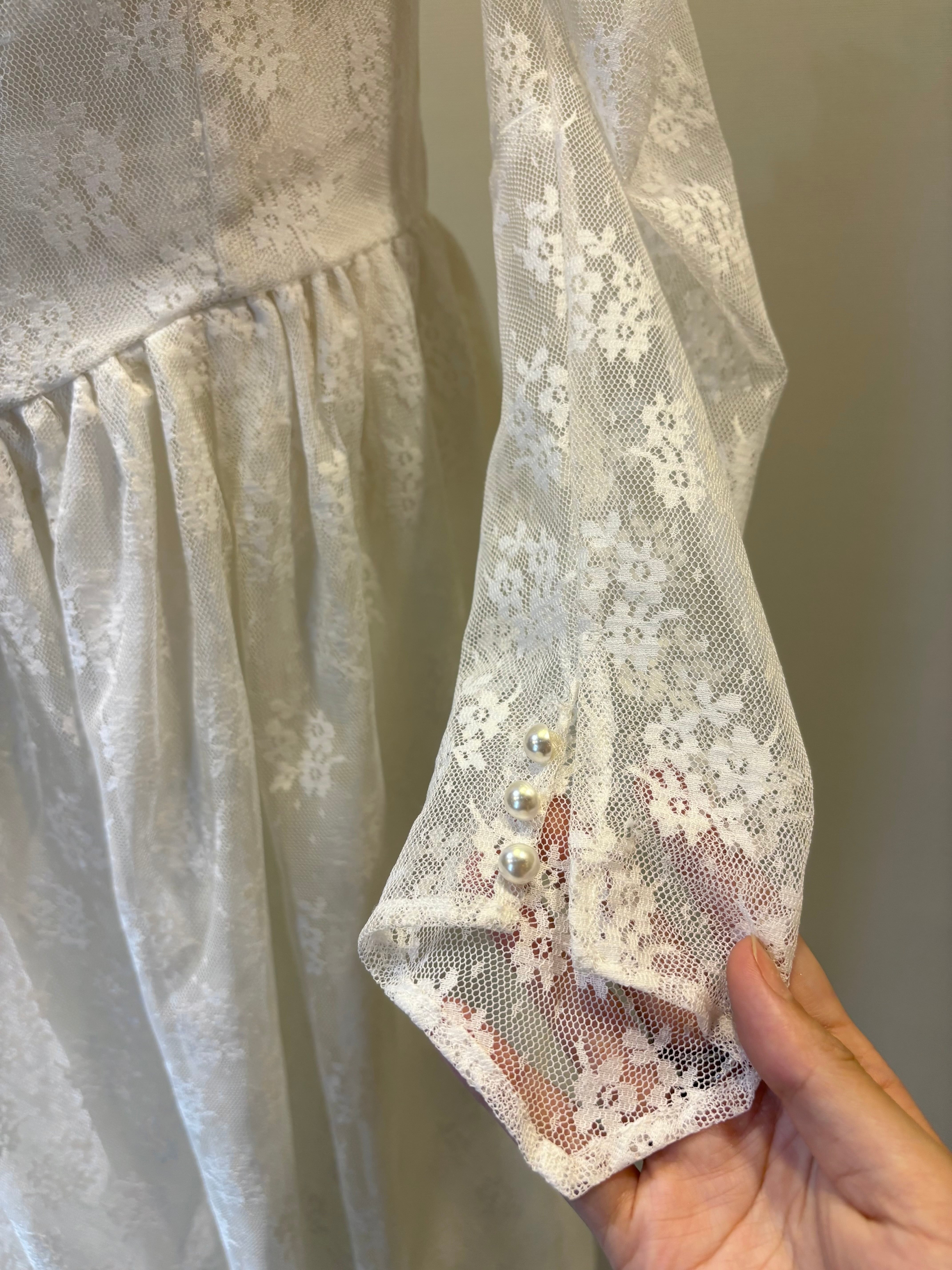 パフスリーブやシースルーの袖、パール装飾が施された特別感のある一着です。