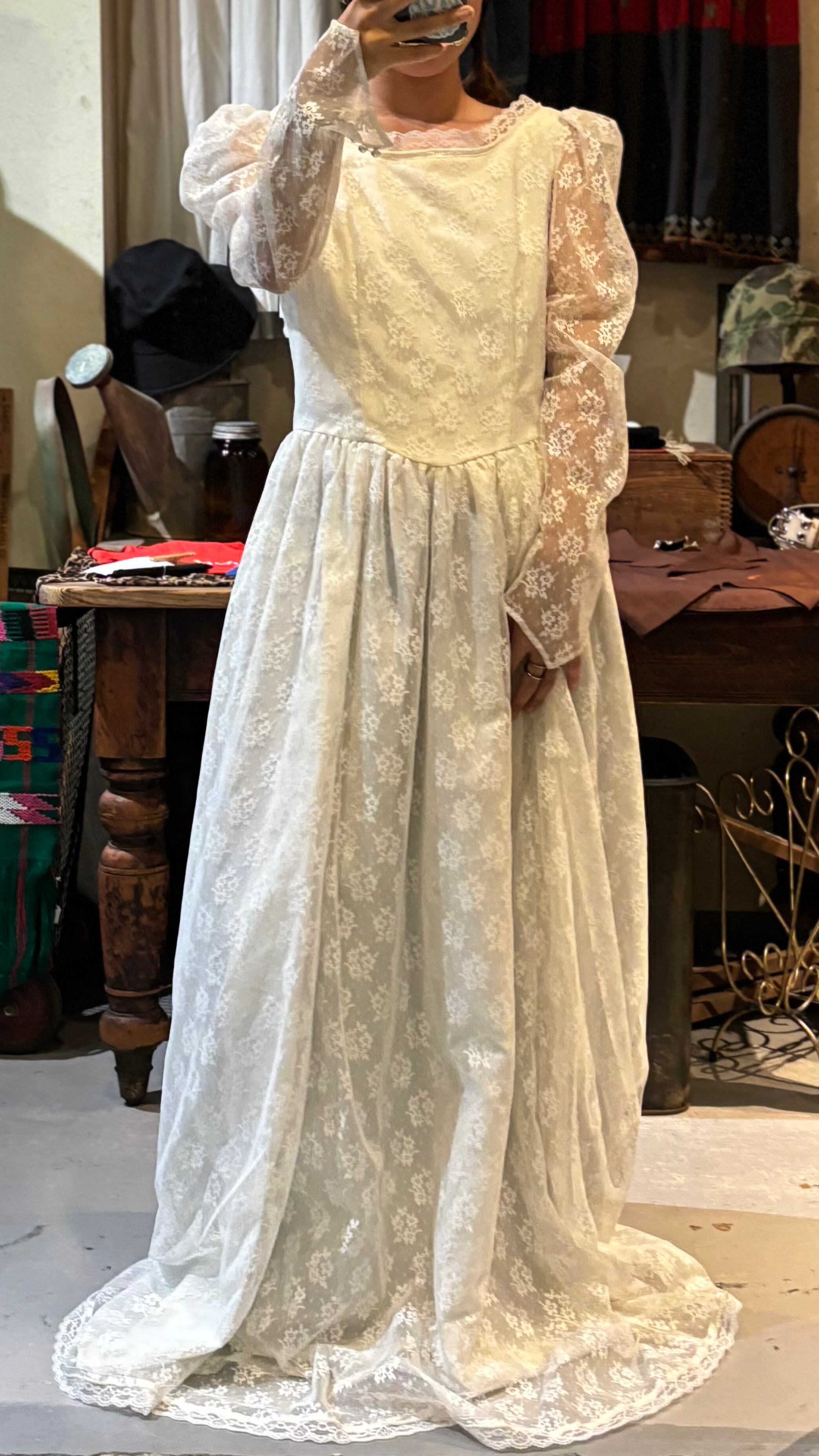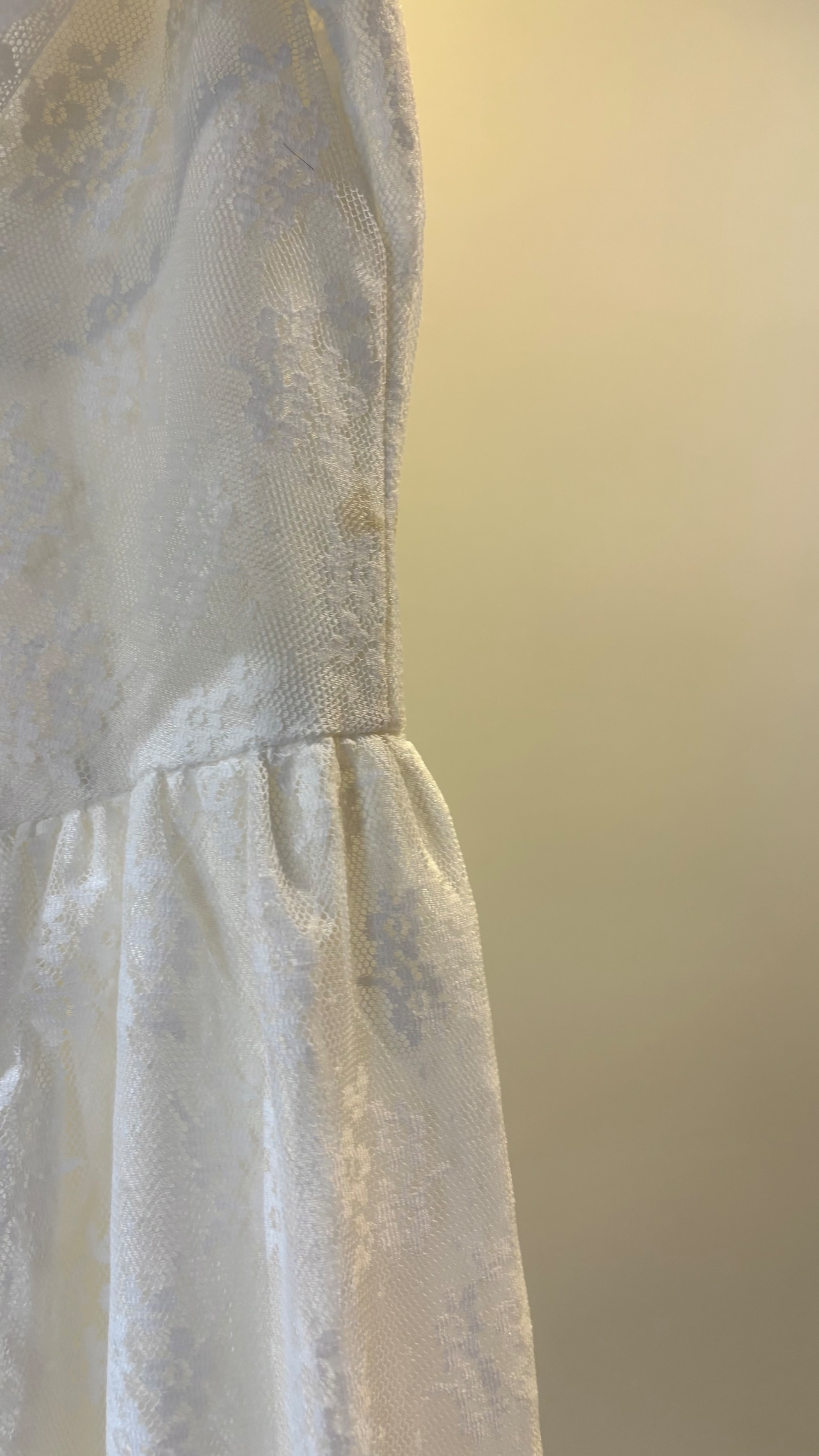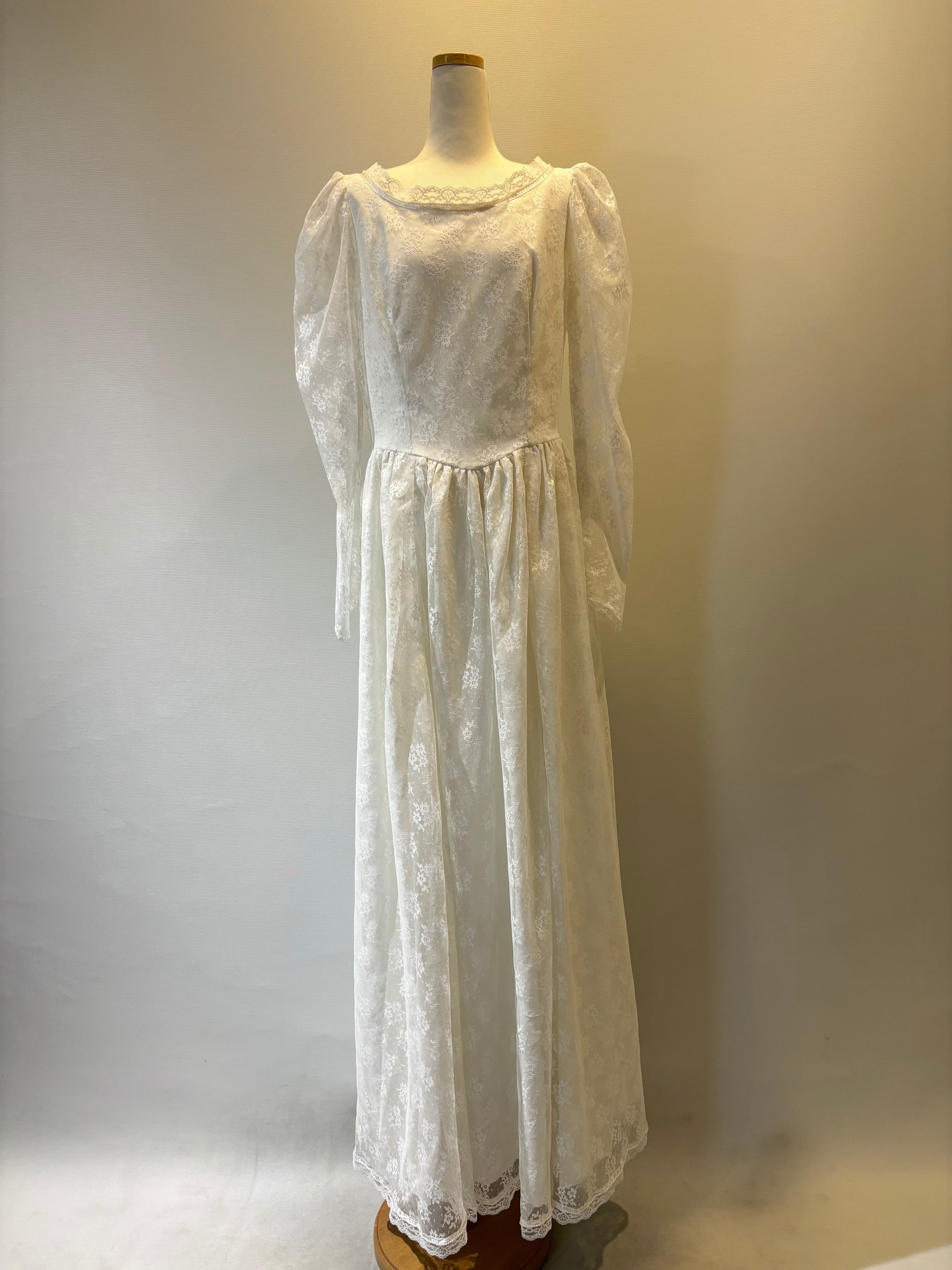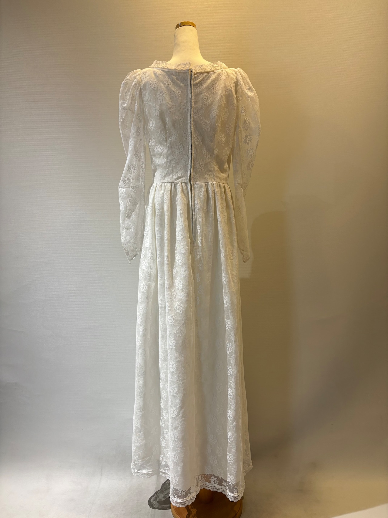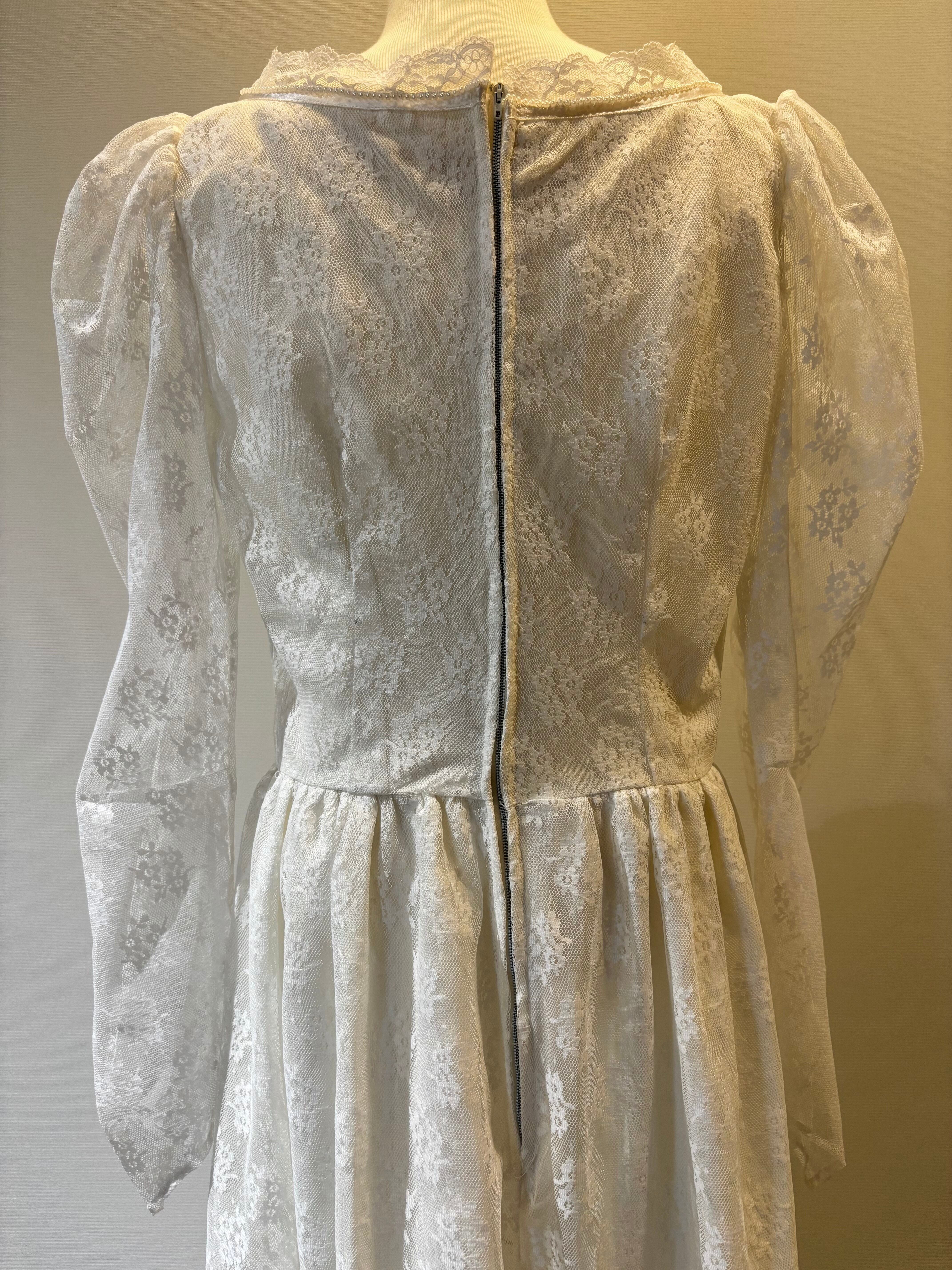 パフスリーブやシースルーの袖、パール装飾が施された特別感のある一着です。
