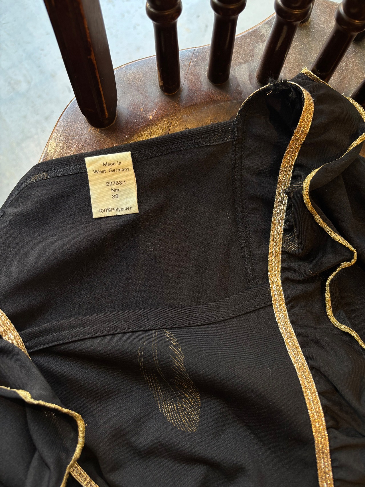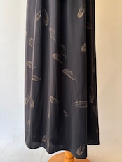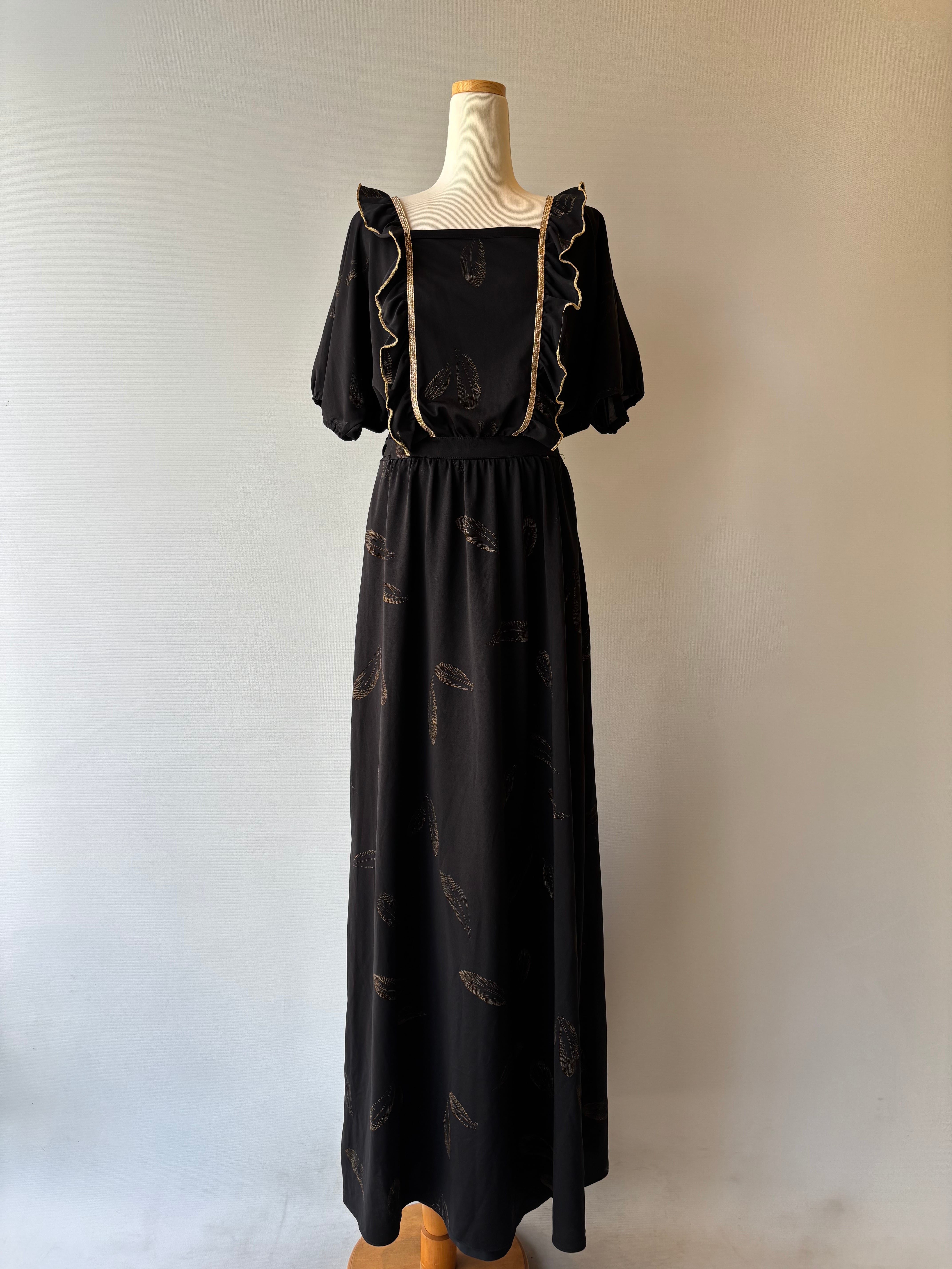 ブラック生地に映えるトップのフリルデザインと、袖はパフスリーブ、全体は羽スタンプで施された映画の主人公のようなロングドレス。