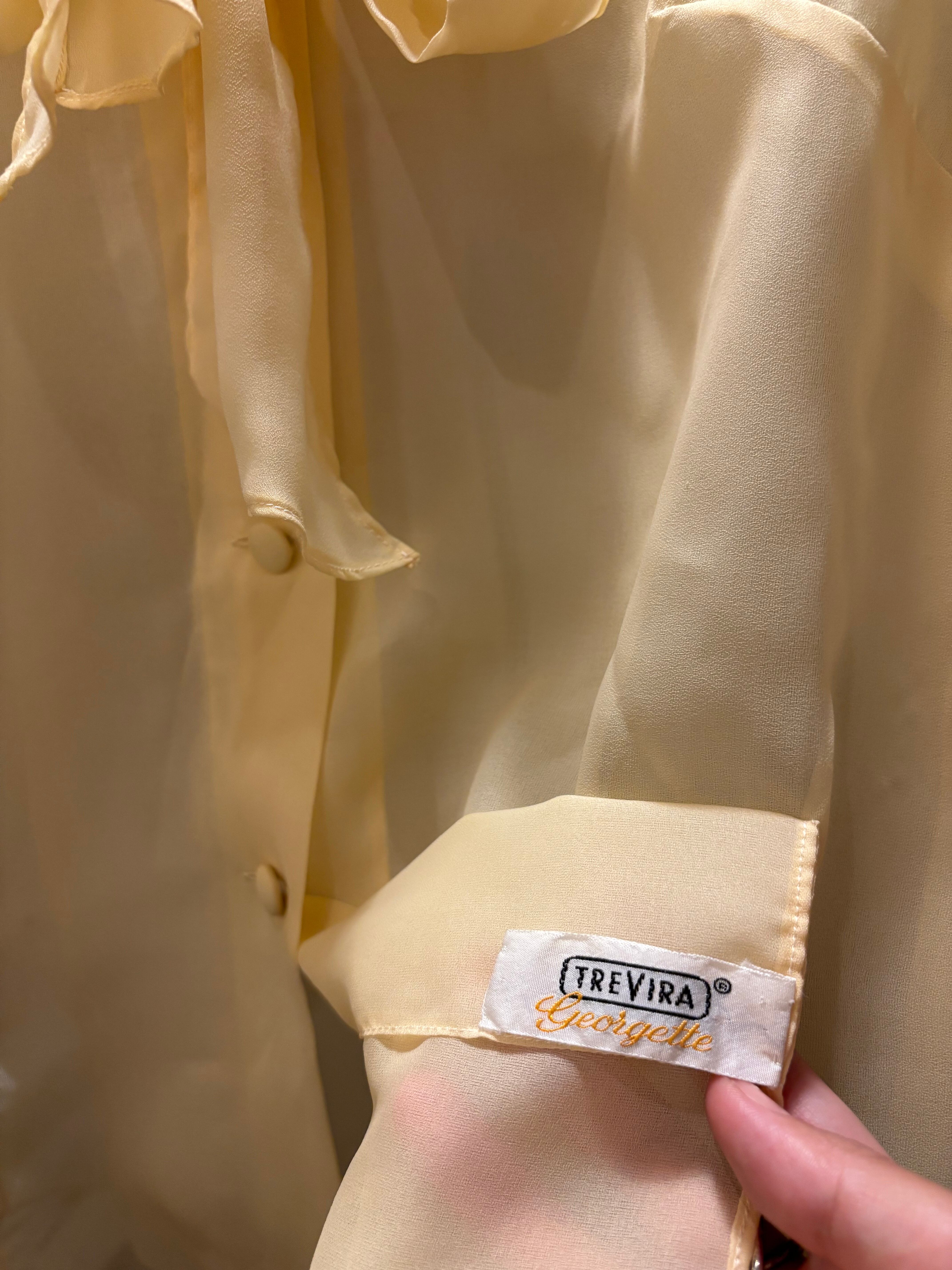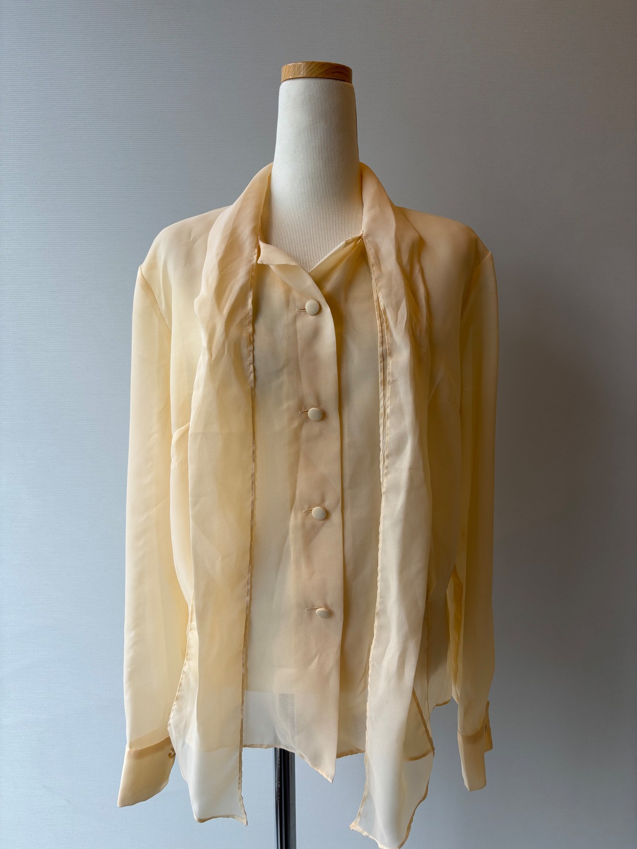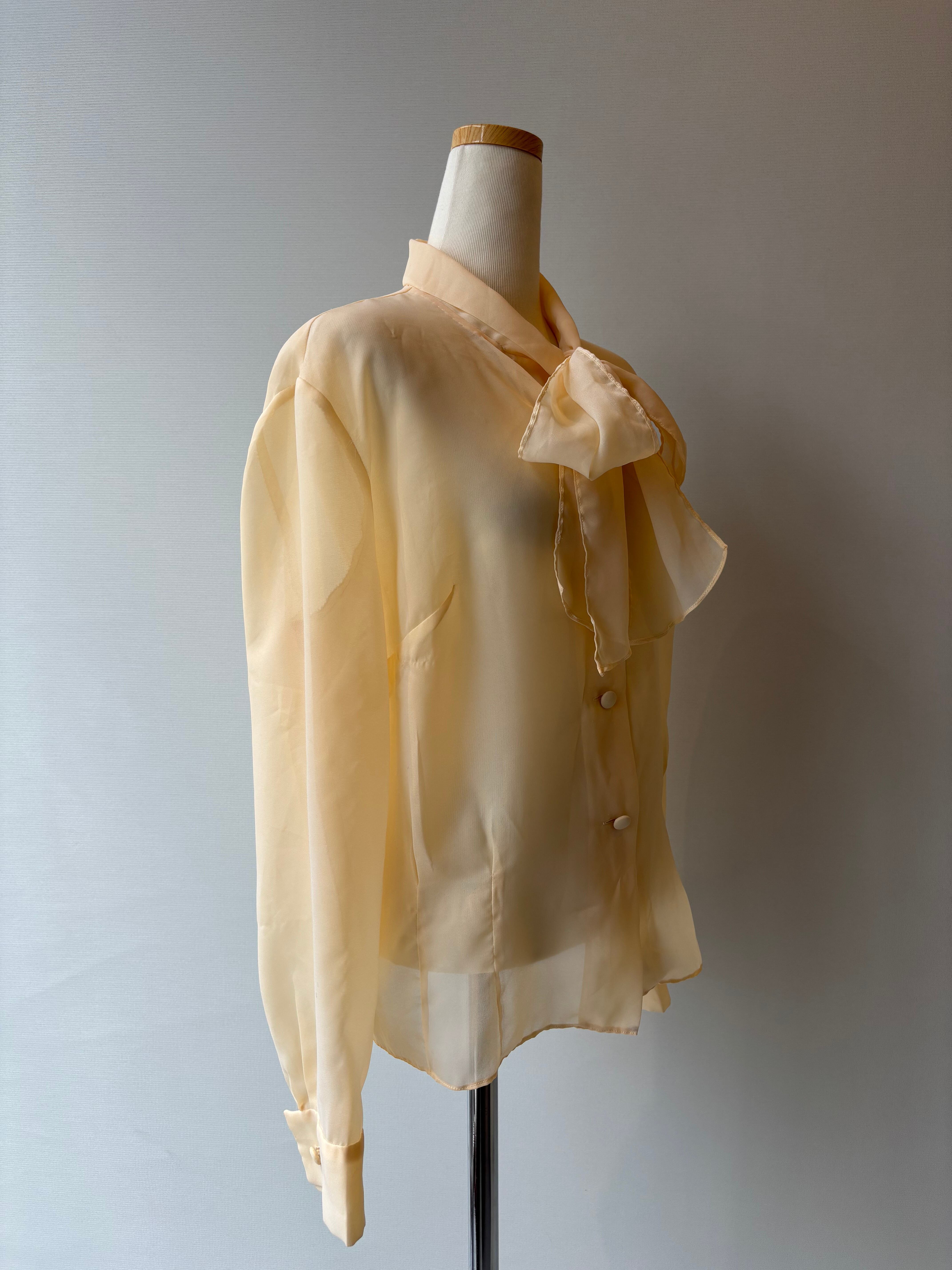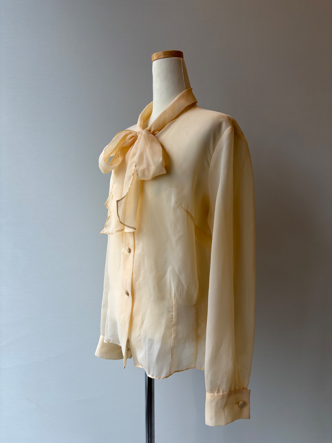 シアーな透け感が魅力のライトベージュのボウタイブラウス。