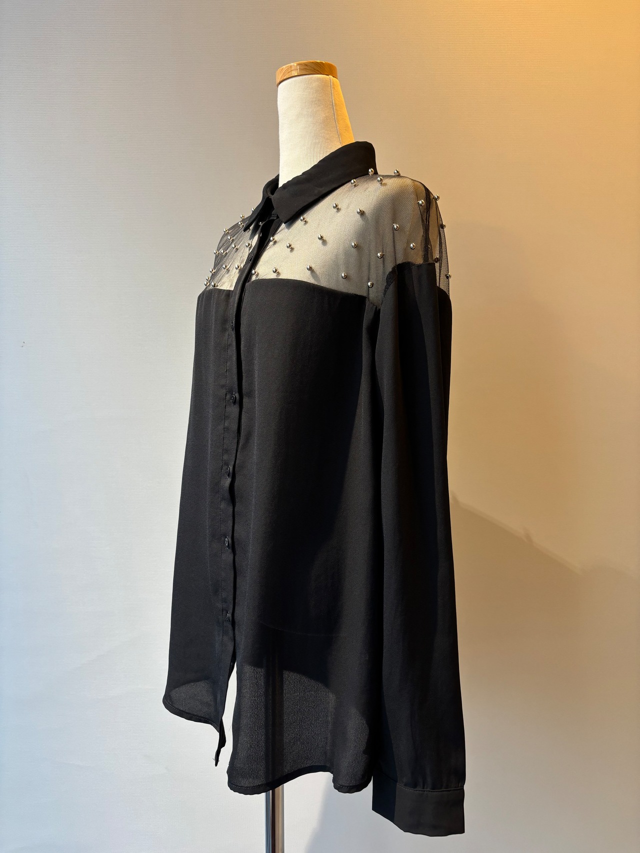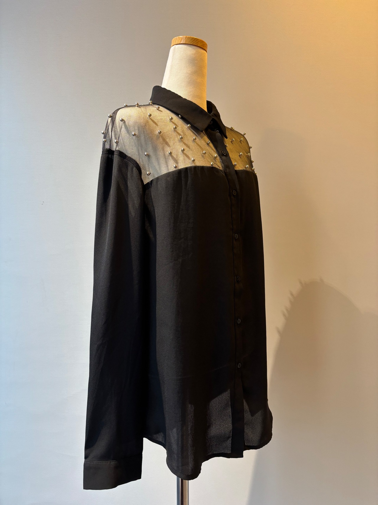 銀のボールディテールが特徴のシアーな長袖シャツ。透け感のある素材感が魅力的で、季節を問わずさまざまなスタイリングに活用できます。