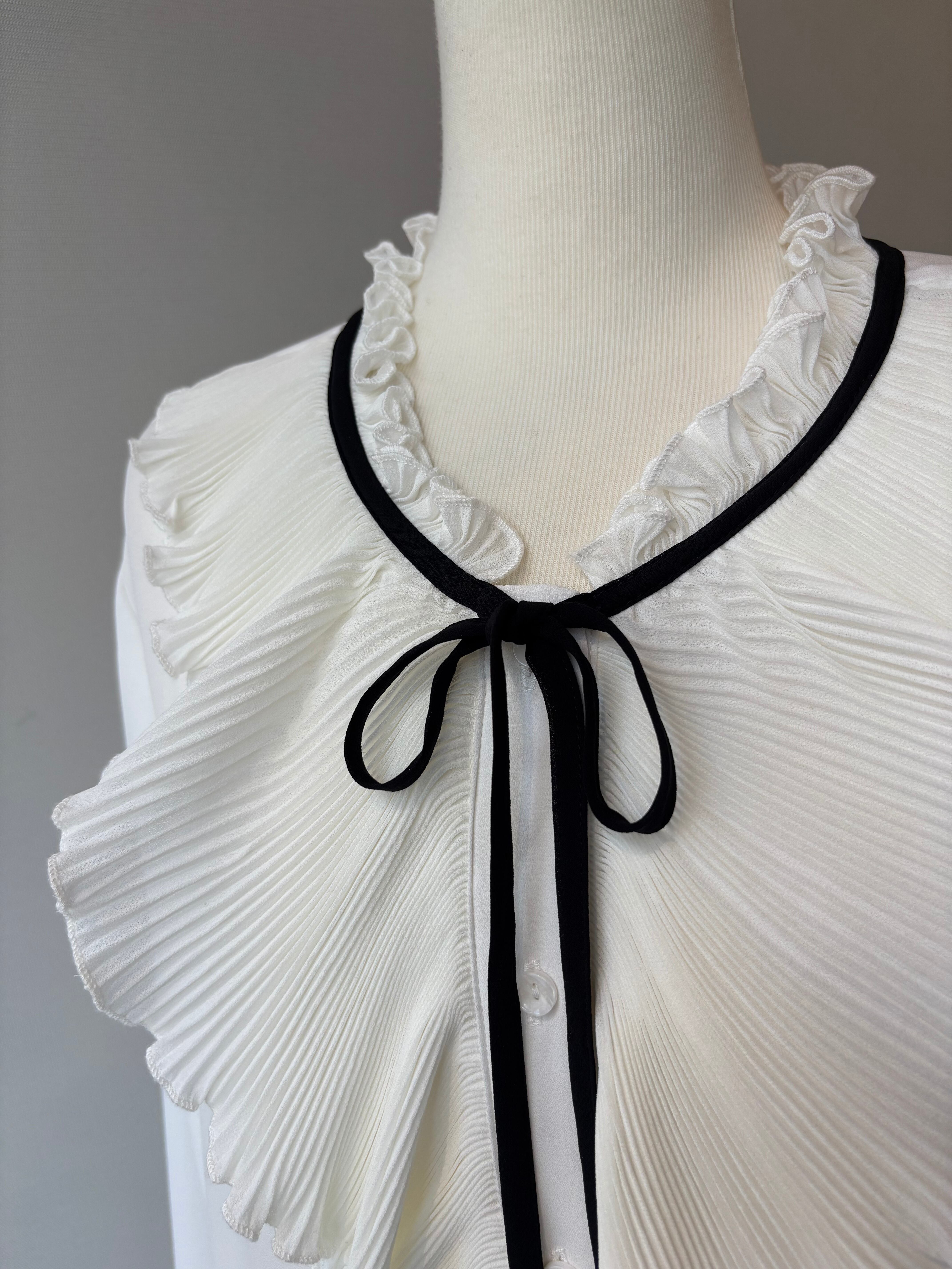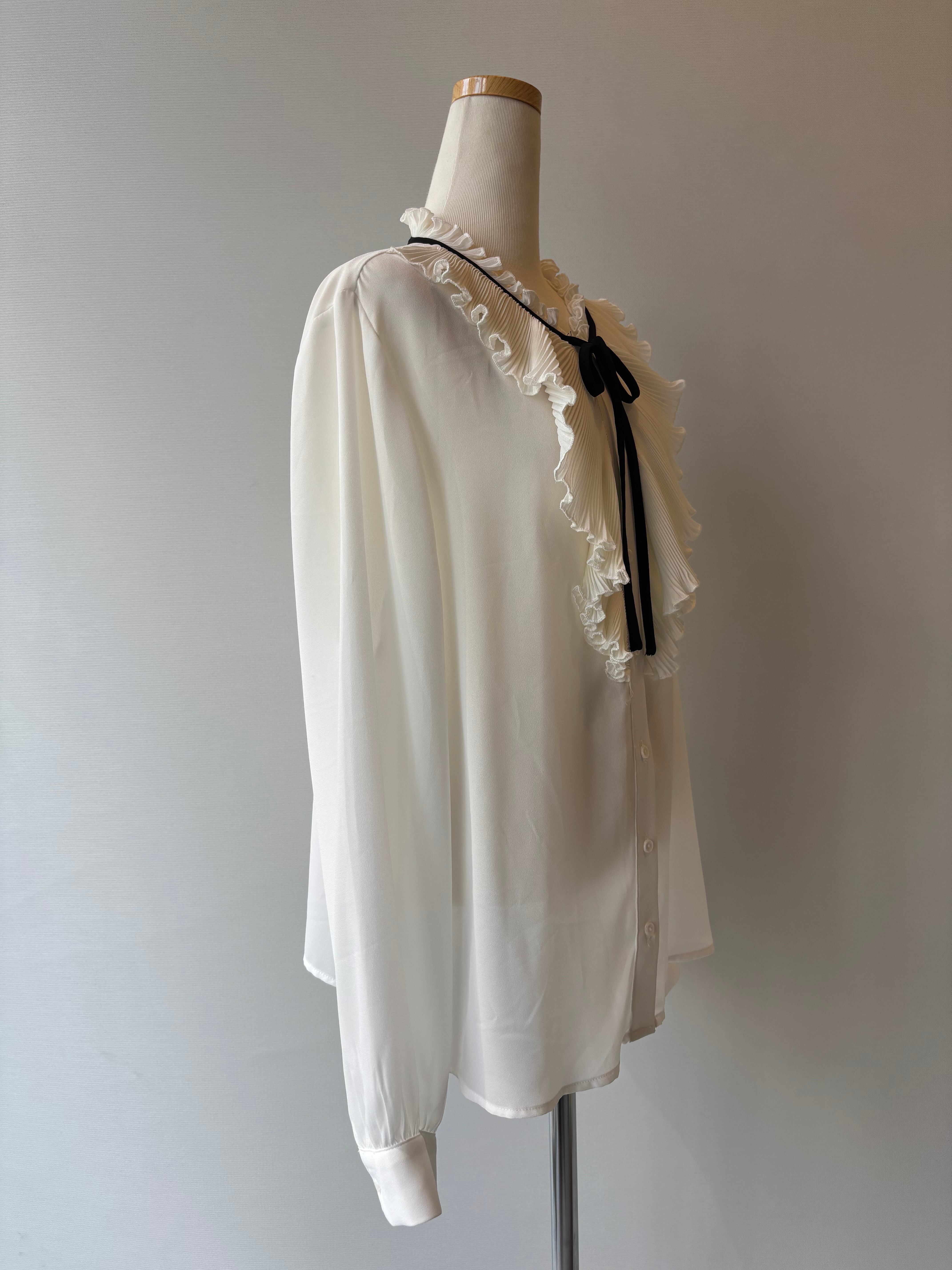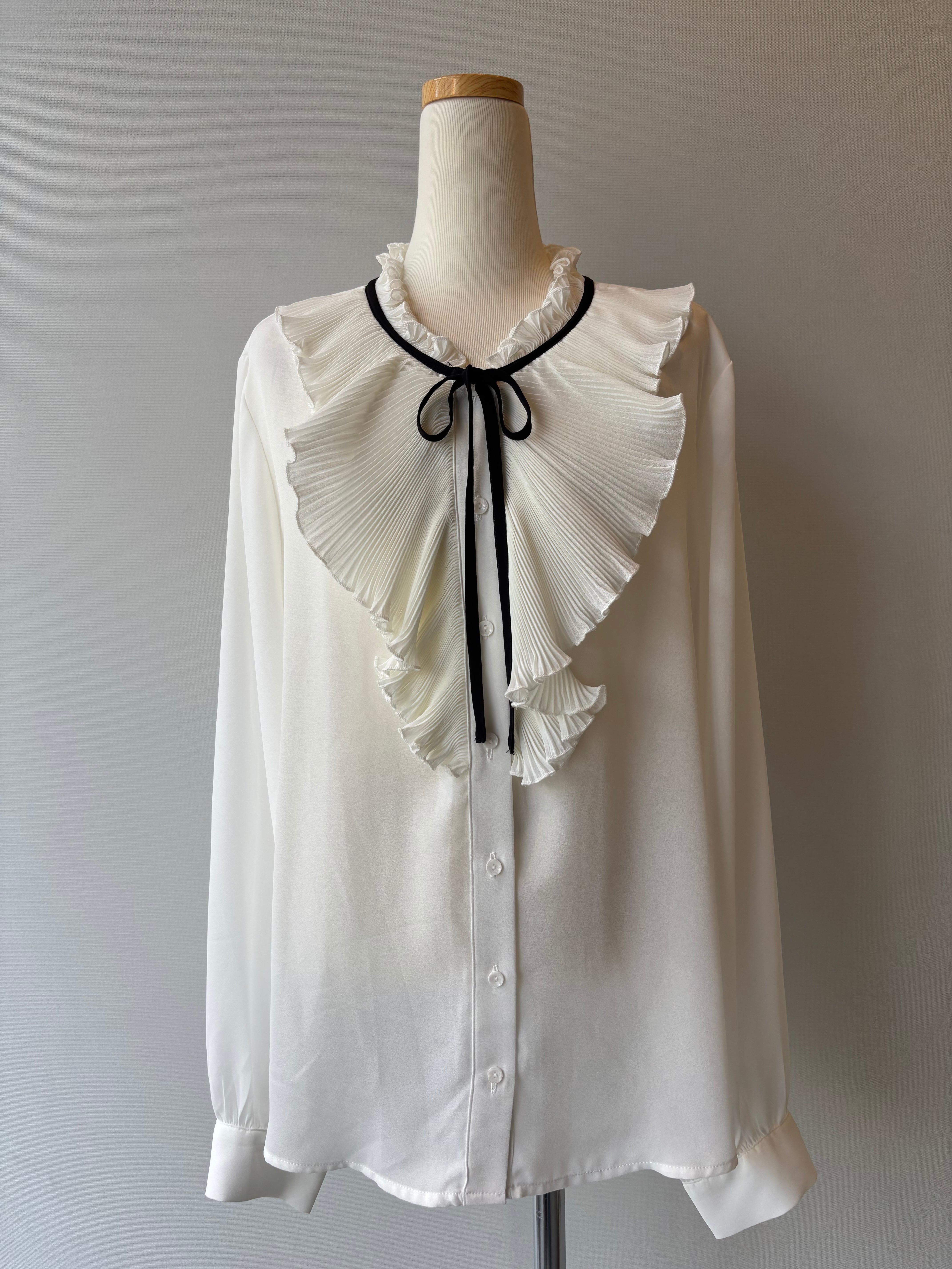 胸元に繊細なピンタックとフリルが施されたボウタイブラウス。華やかさの中にクラシカルな雰囲気もあり、ジャケットインや一枚着でも映える一着です。