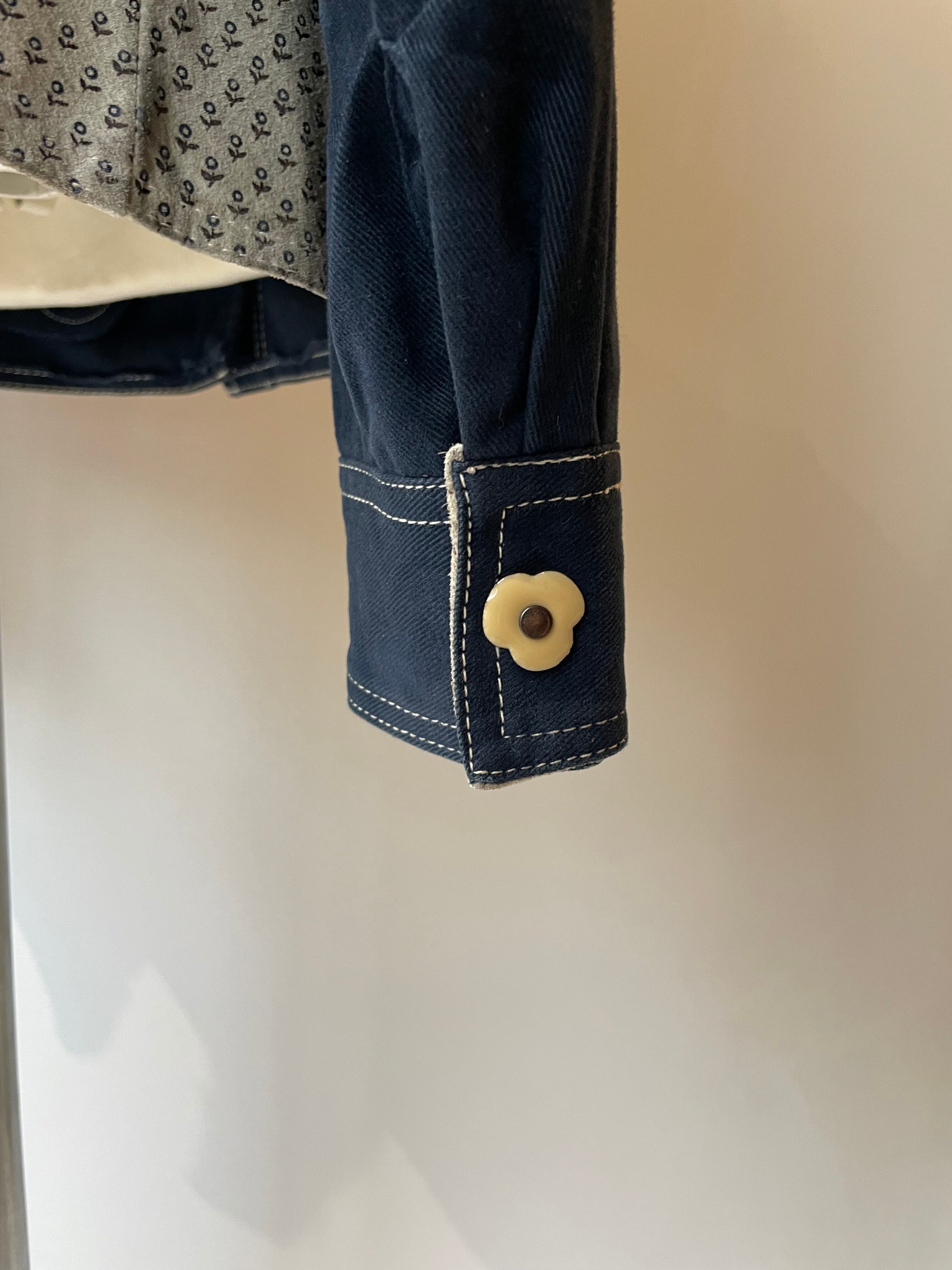 厚めのコットンにレザー部分には花の総柄、ボタンも花の形になっており気の抜かないデザイン。