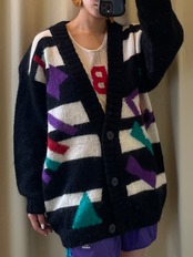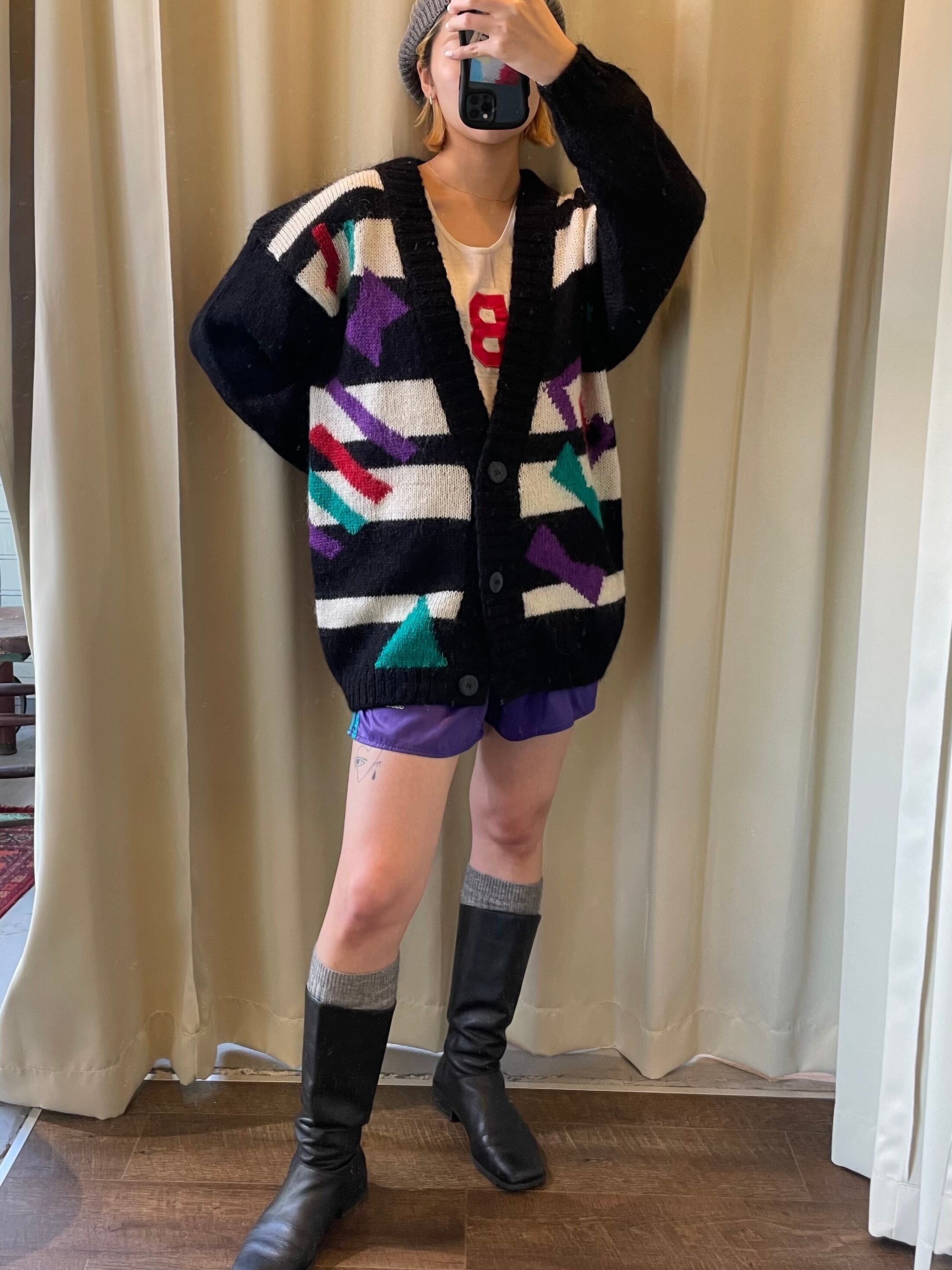 幾何学模様とボーダーの組み合わせがユニークなカーディガン 。