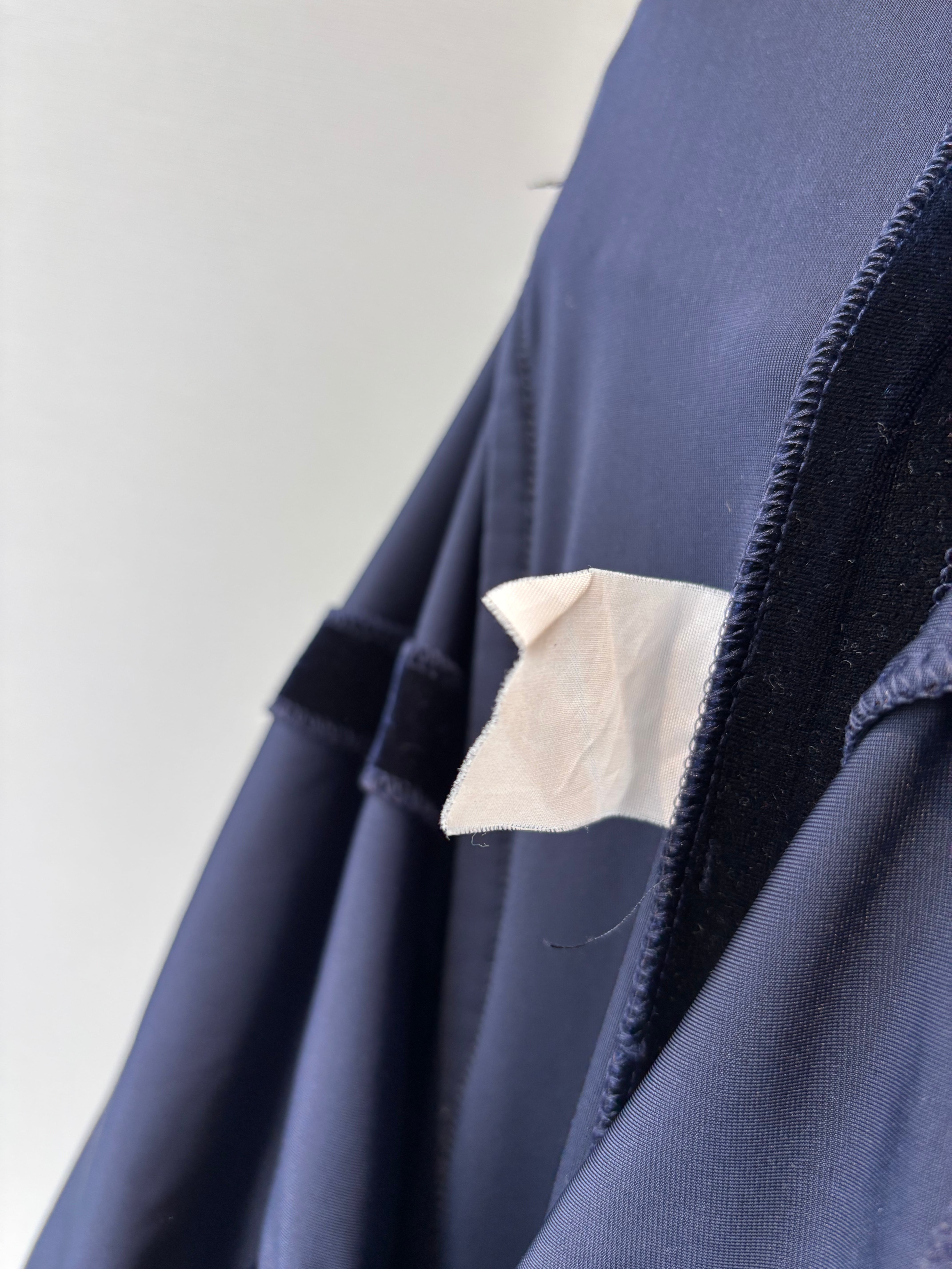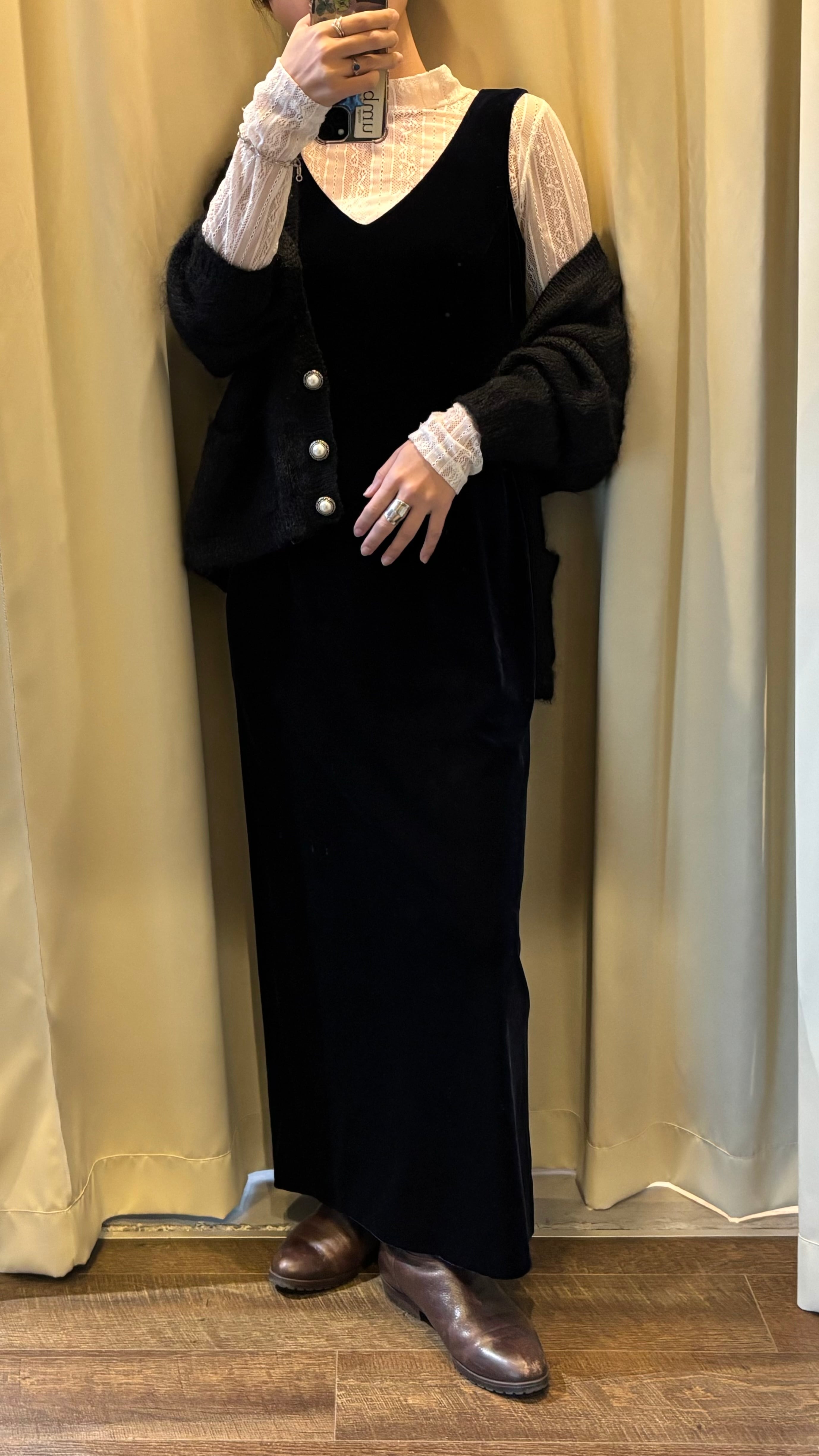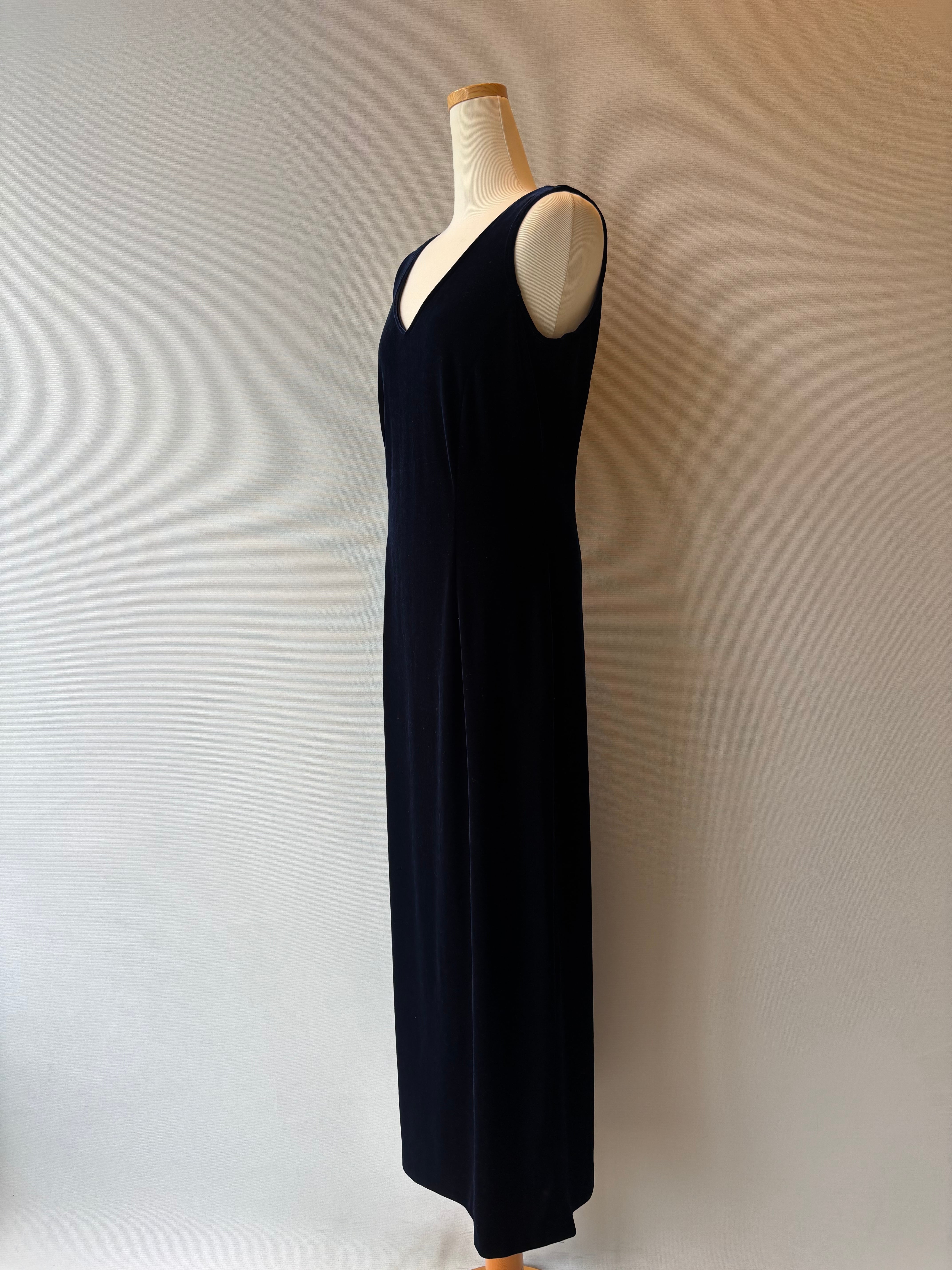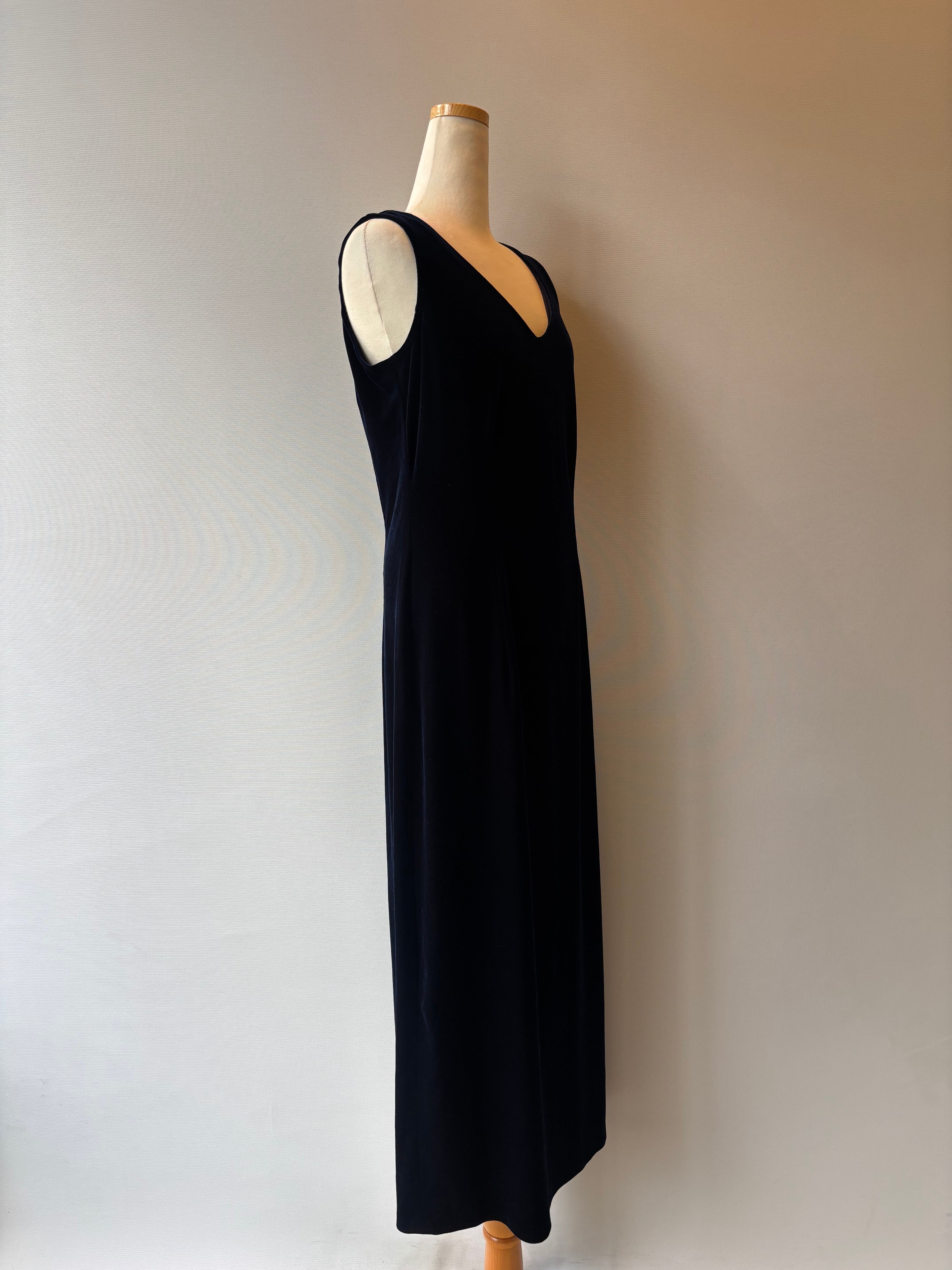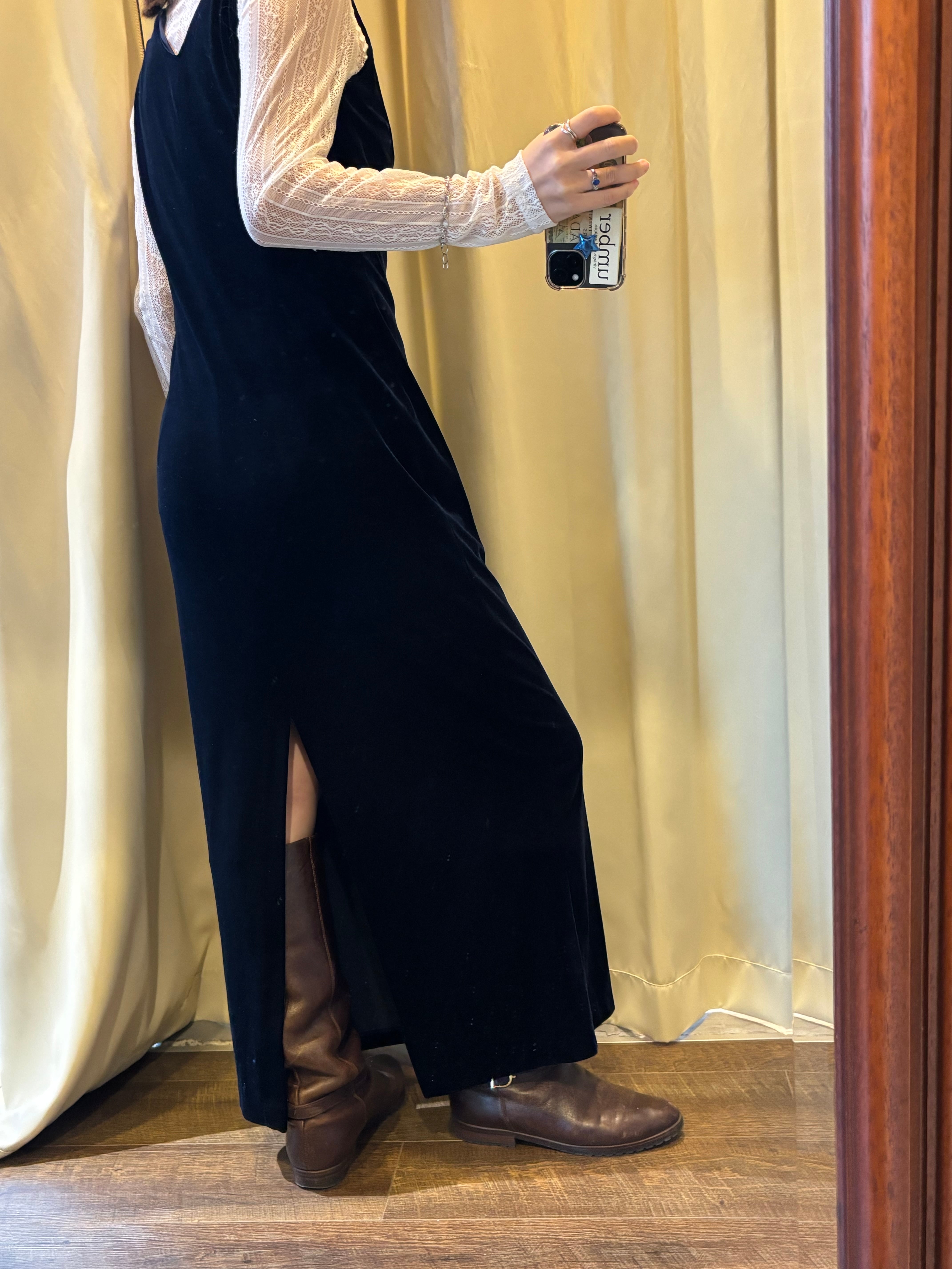 バックスリットが大きく入ったシンプルなネイビーのベロアワンピース。