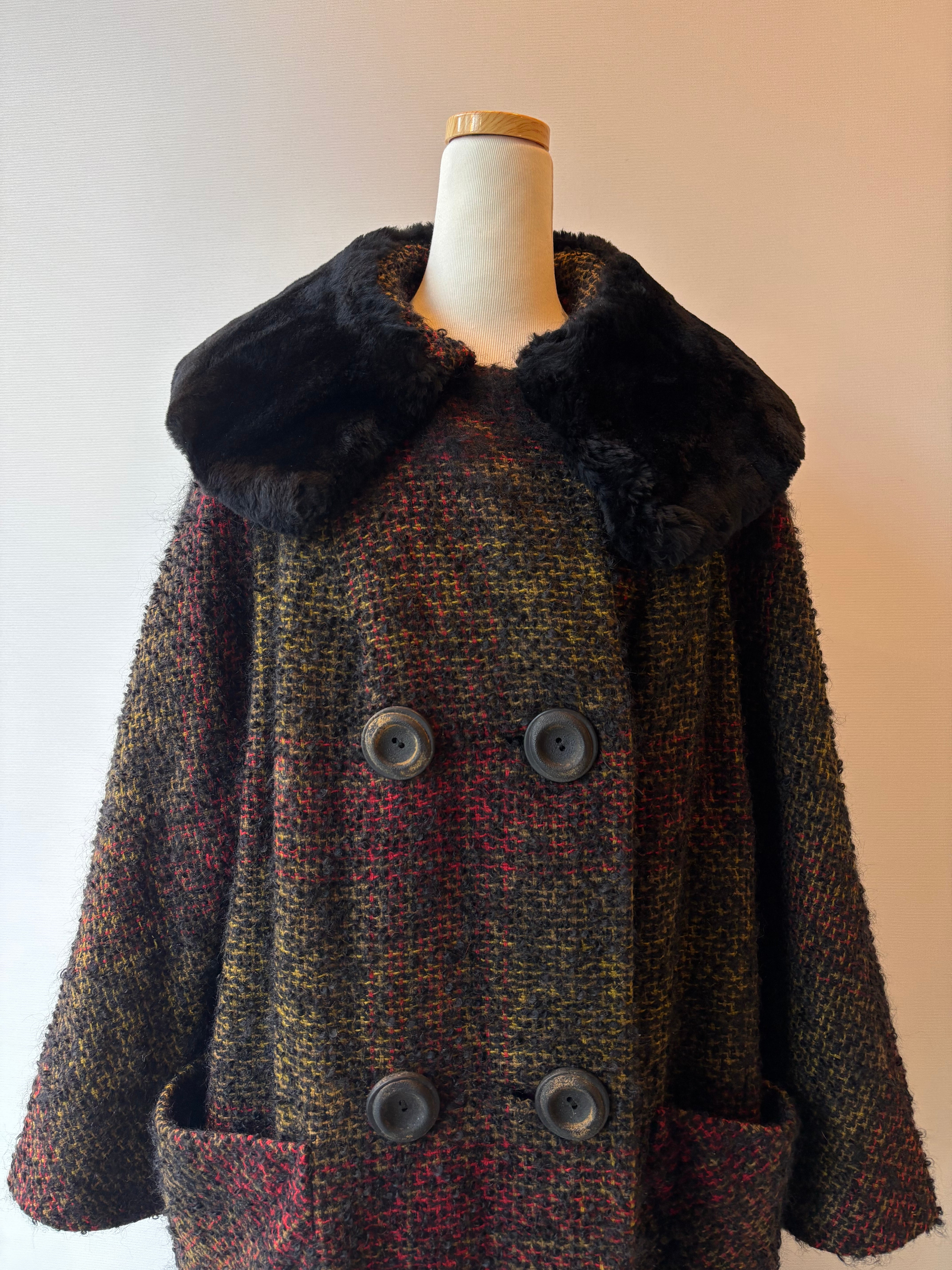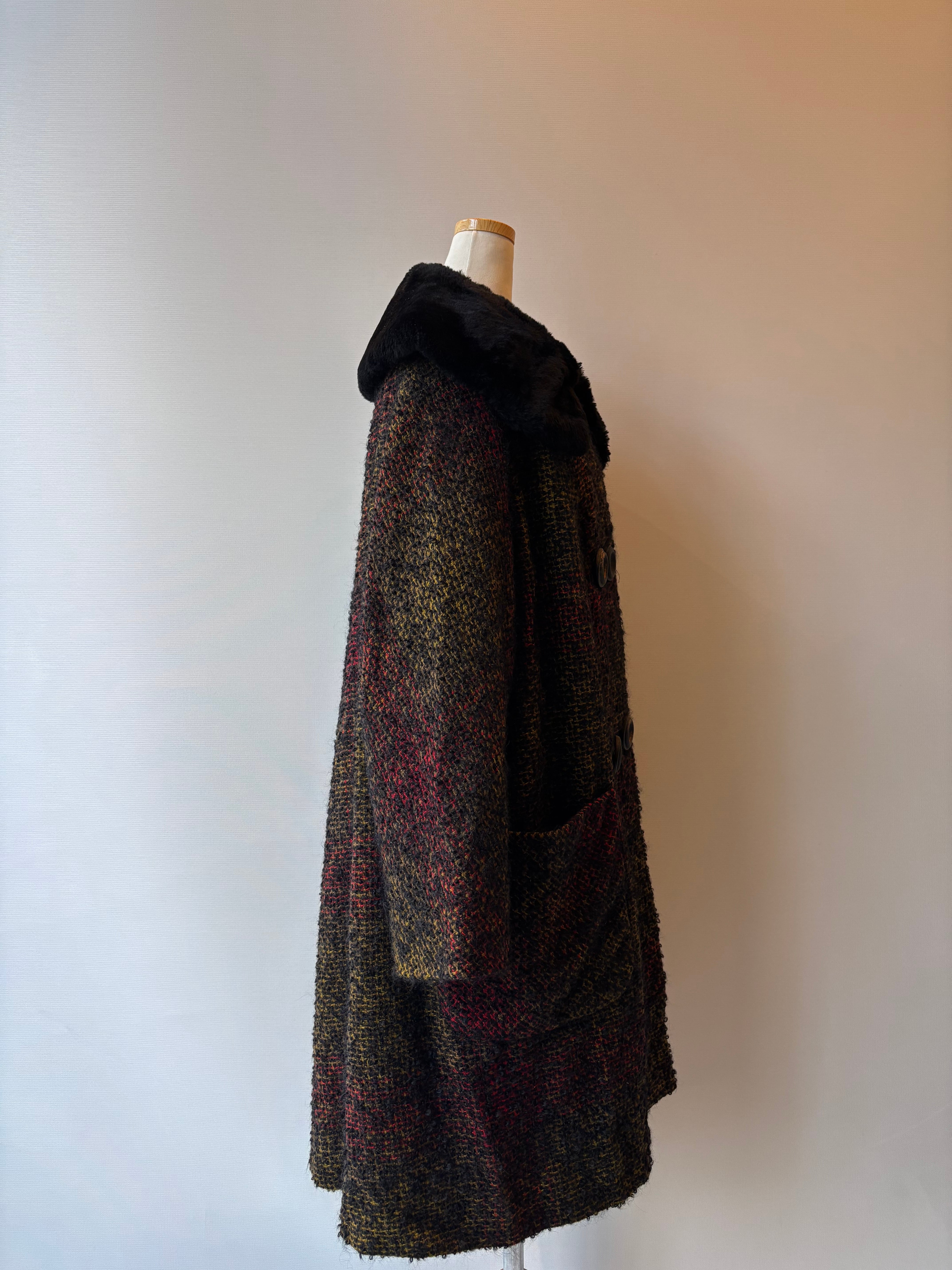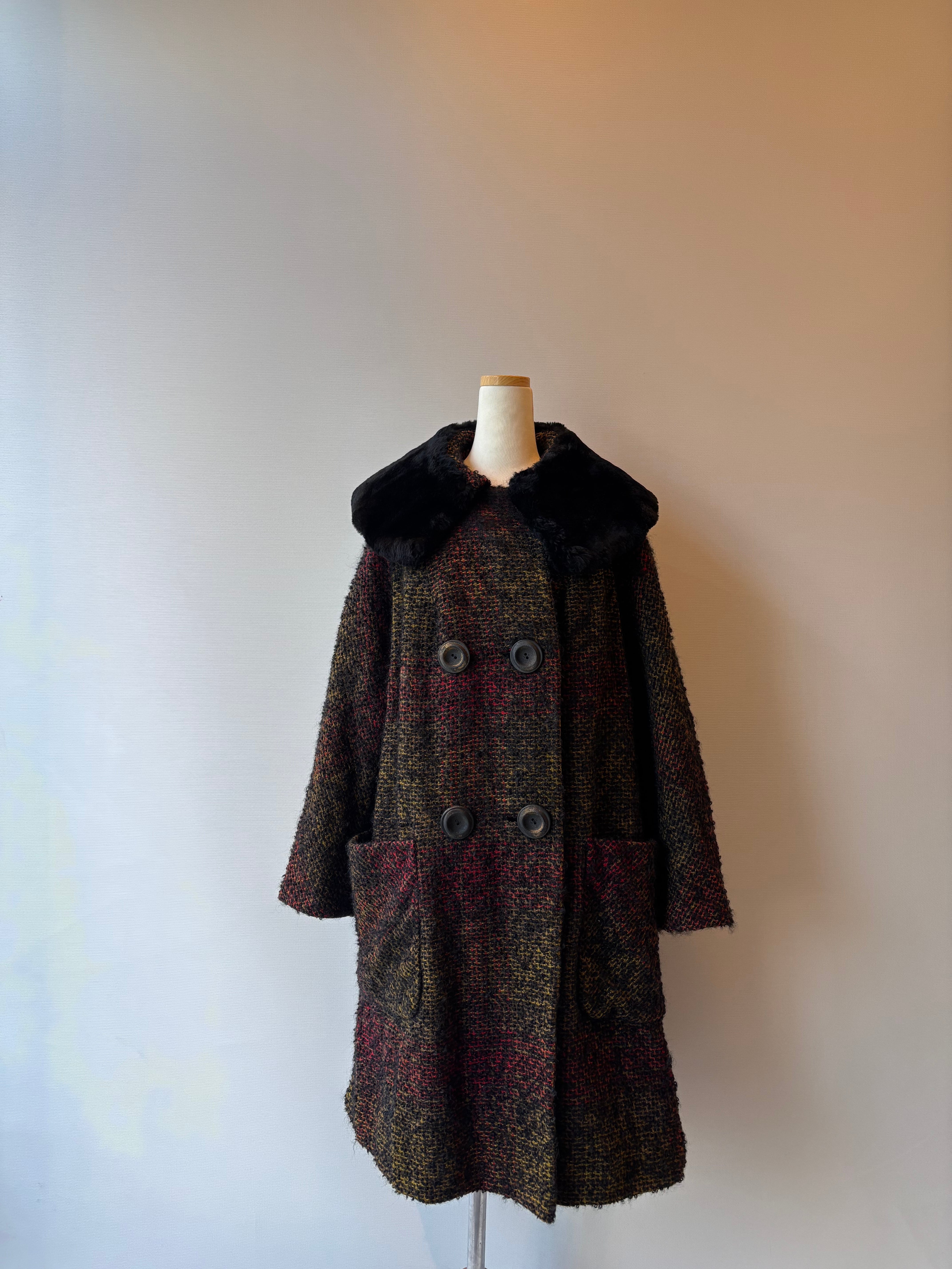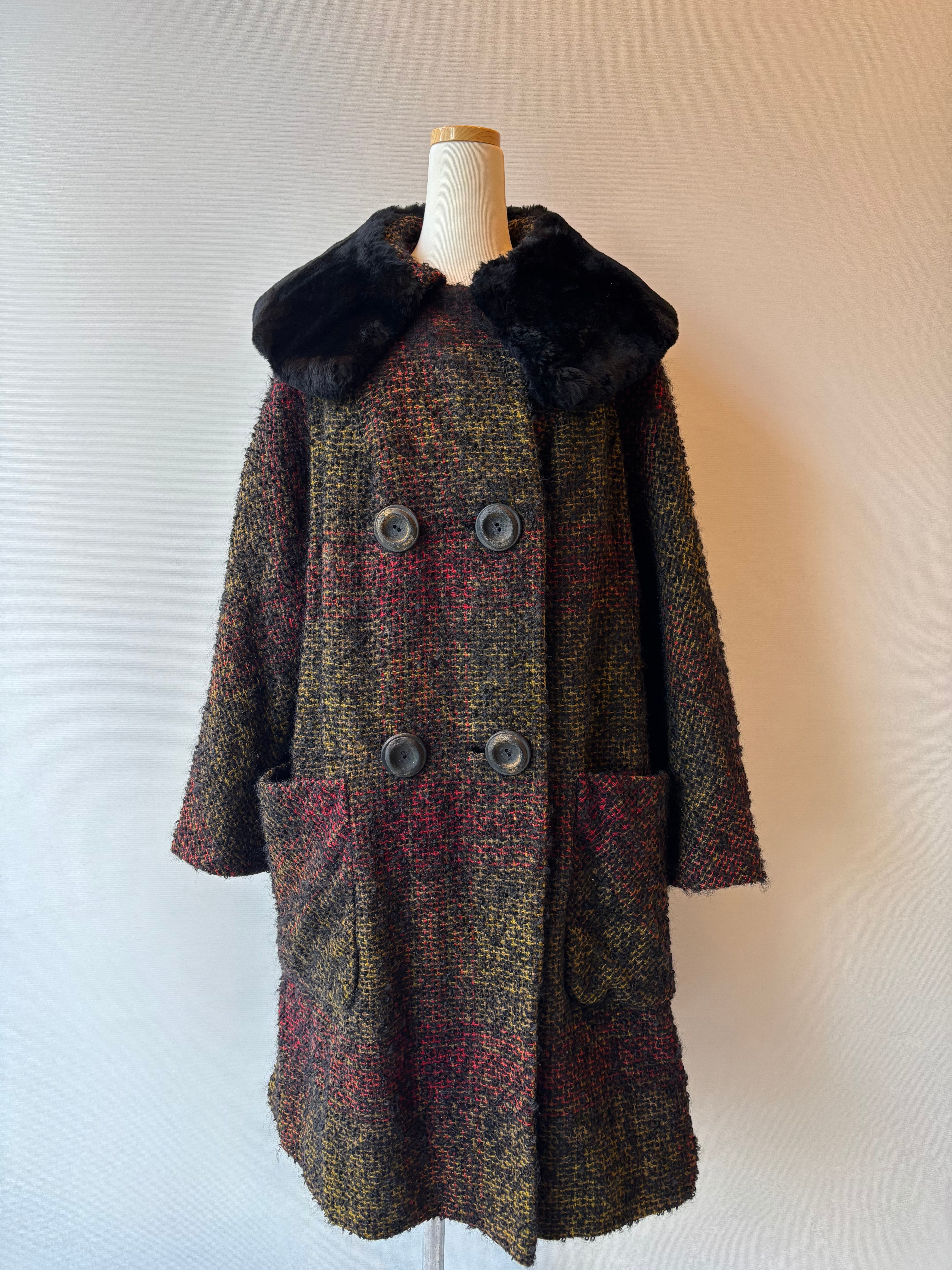 ふわっと毛足の出たモヘアツイードに、首元のフェイクファーが華やかさをプラスした一着です。