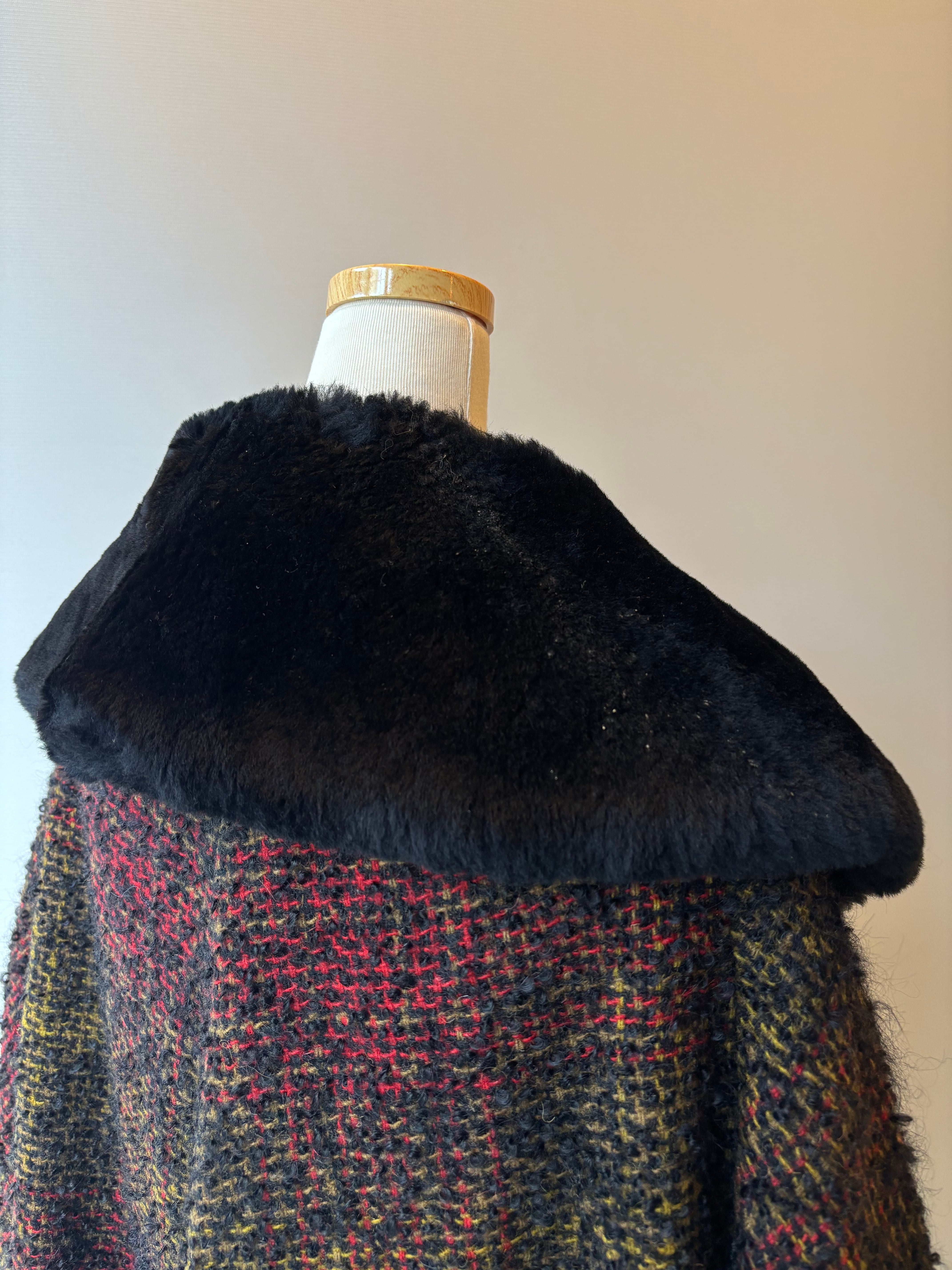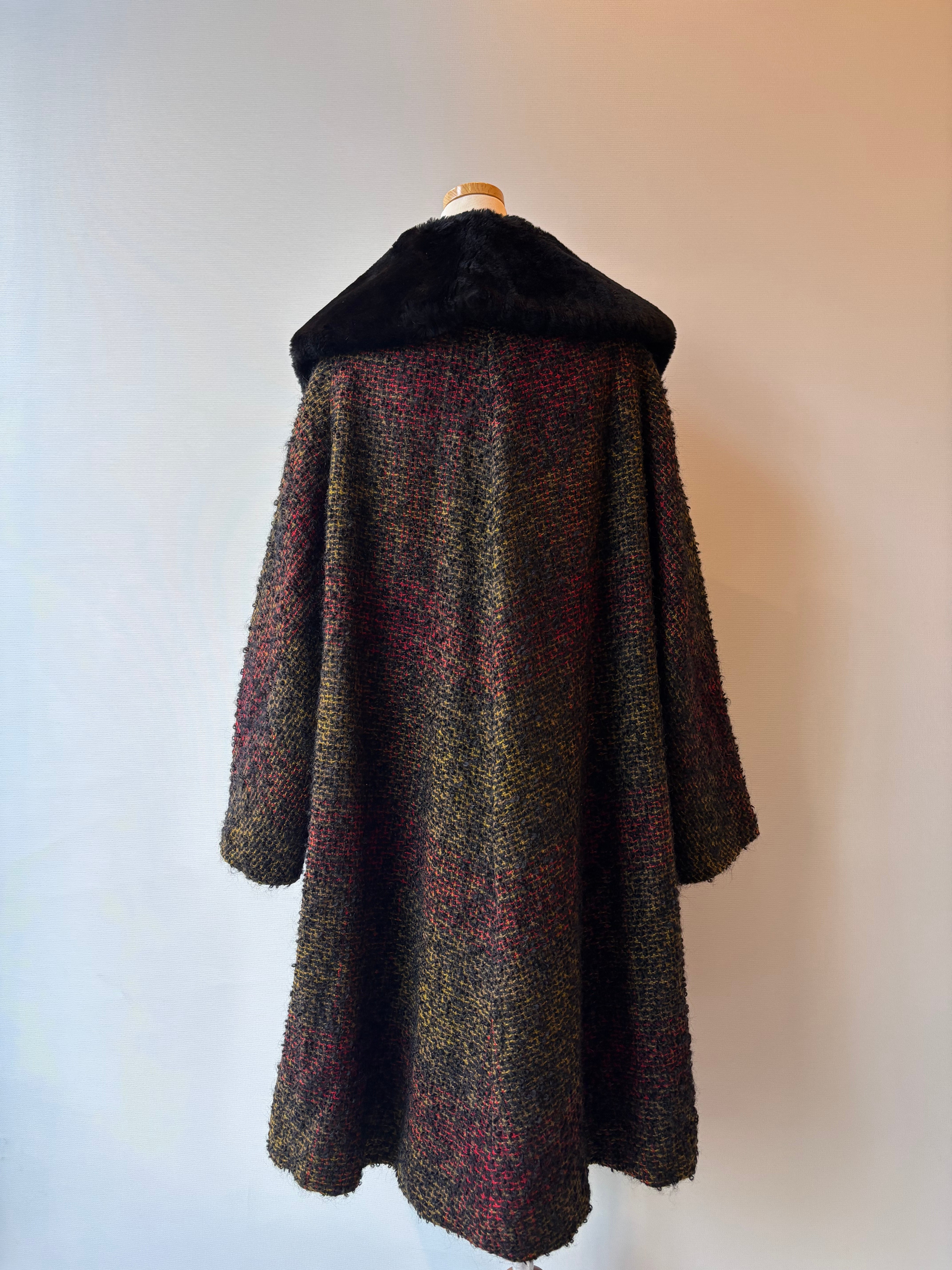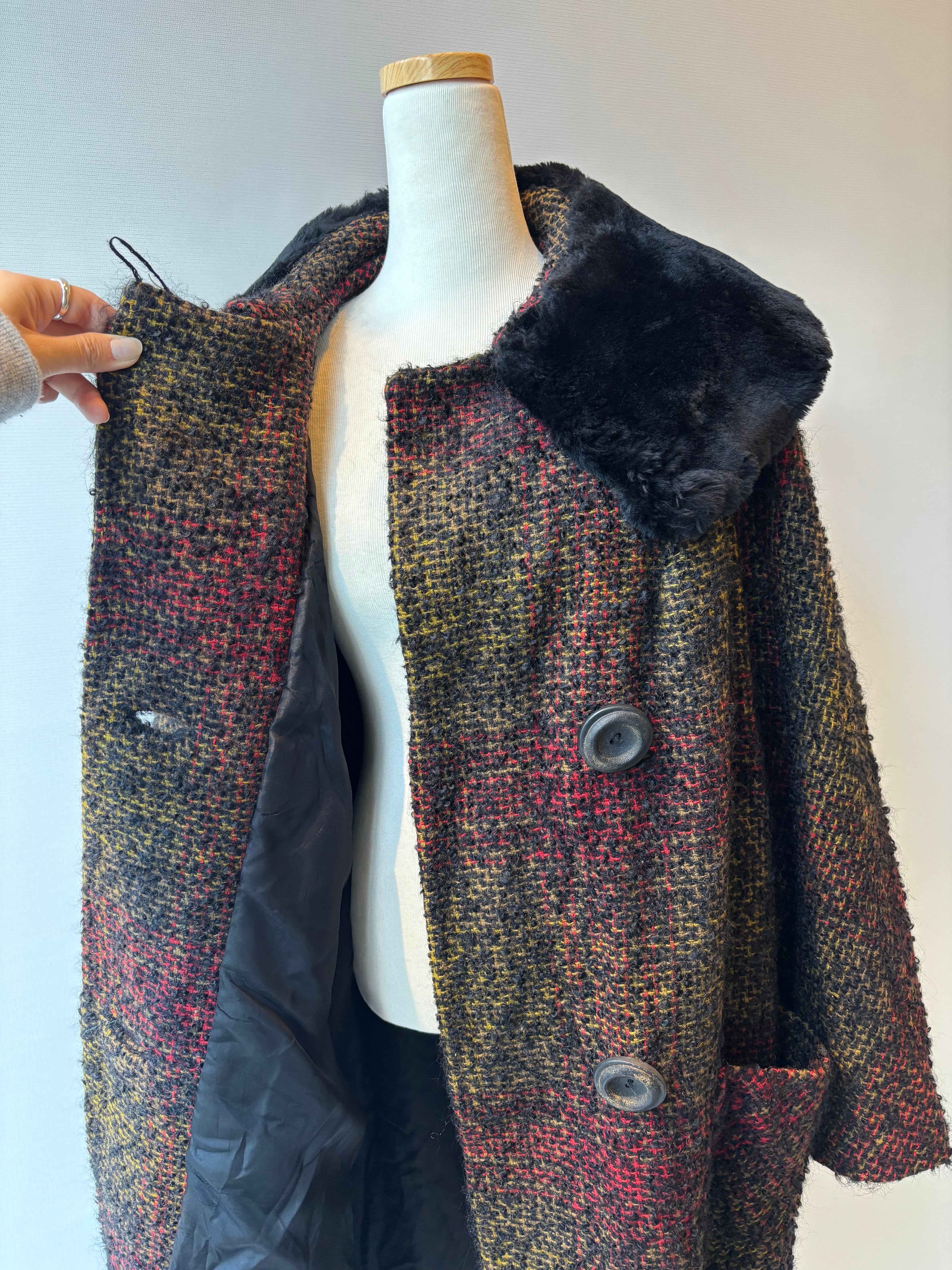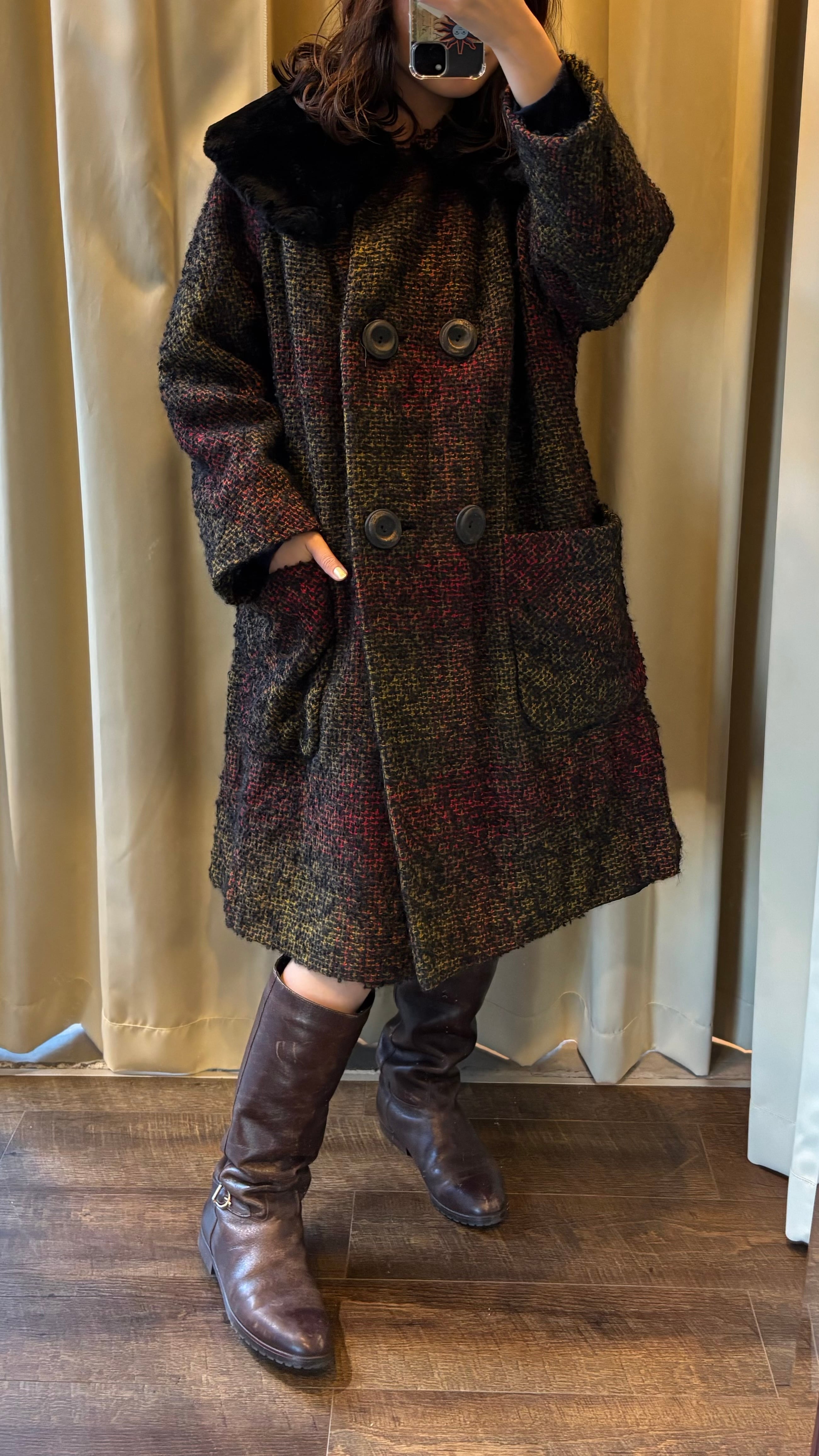 ふわっと毛足の出たモヘアツイードに、首元のフェイクファーが華やかさをプラスした一着です。