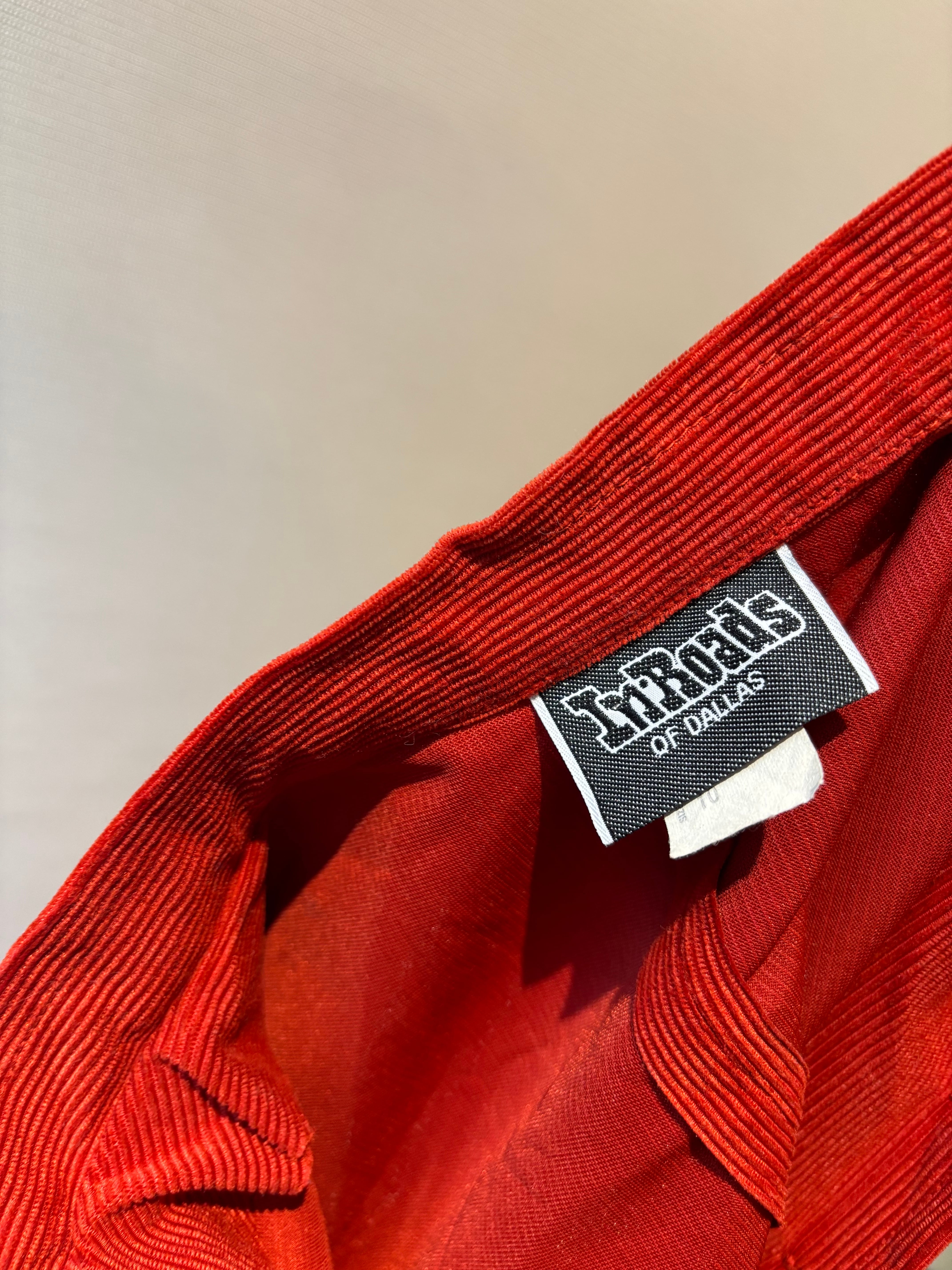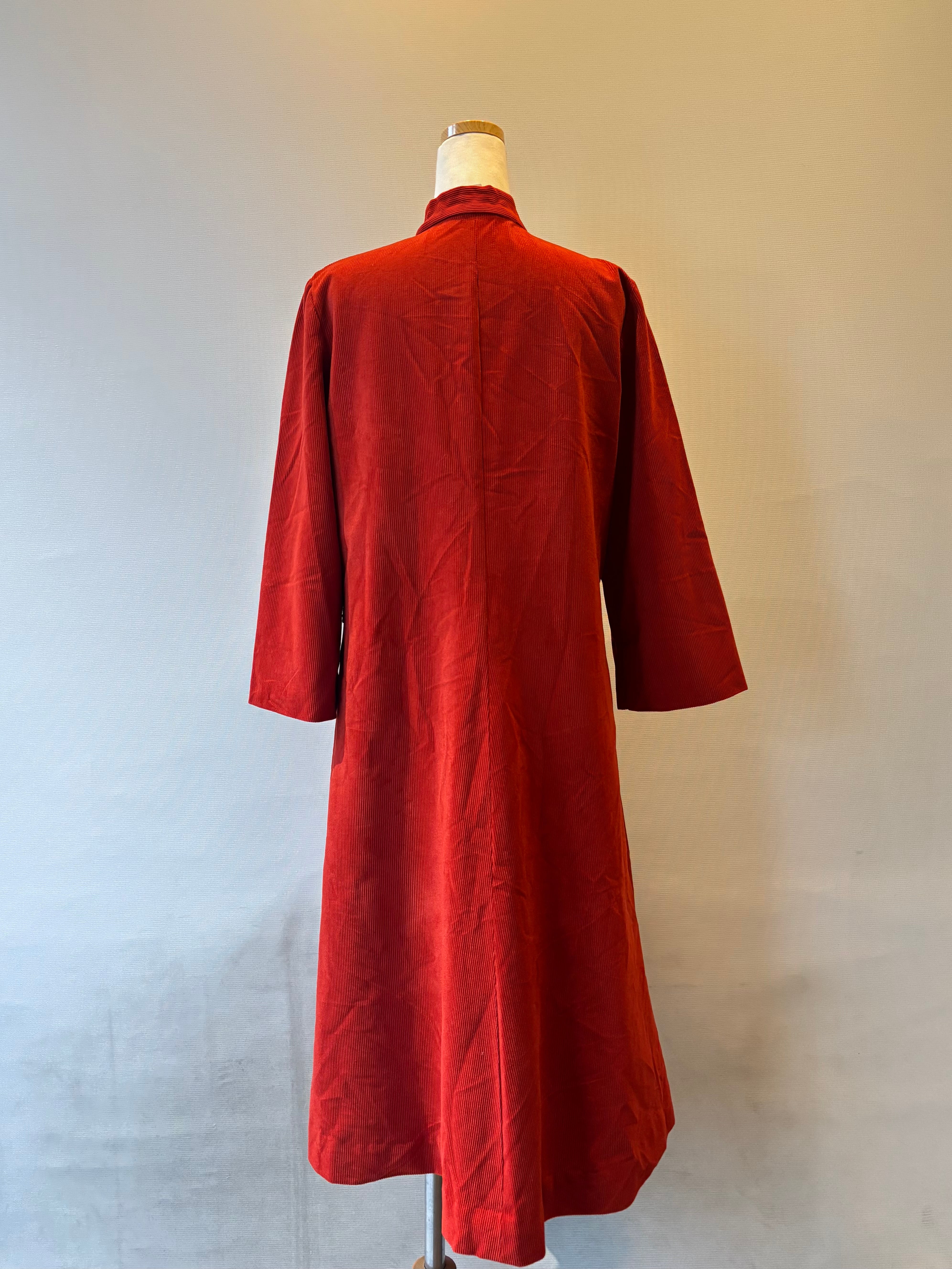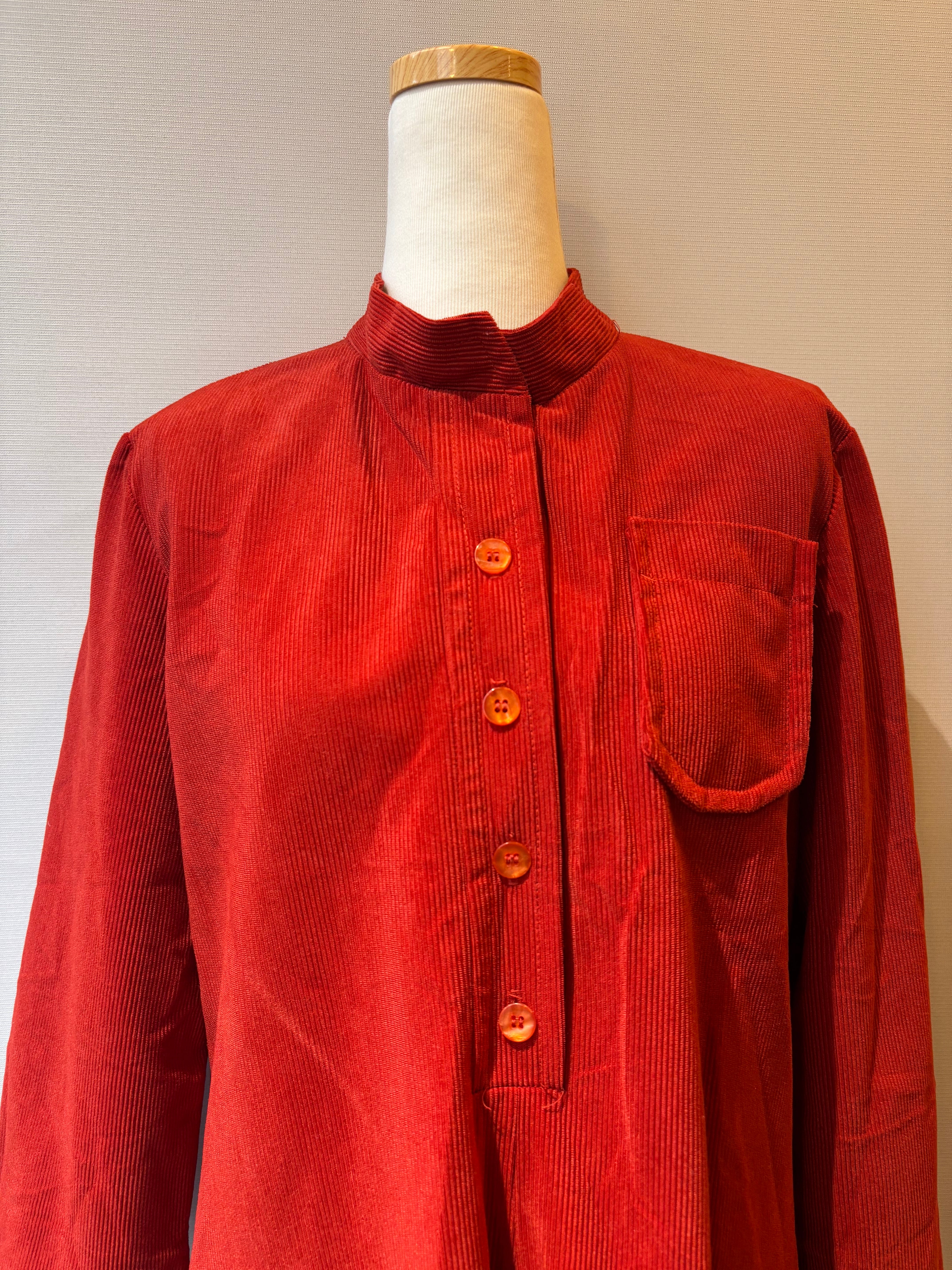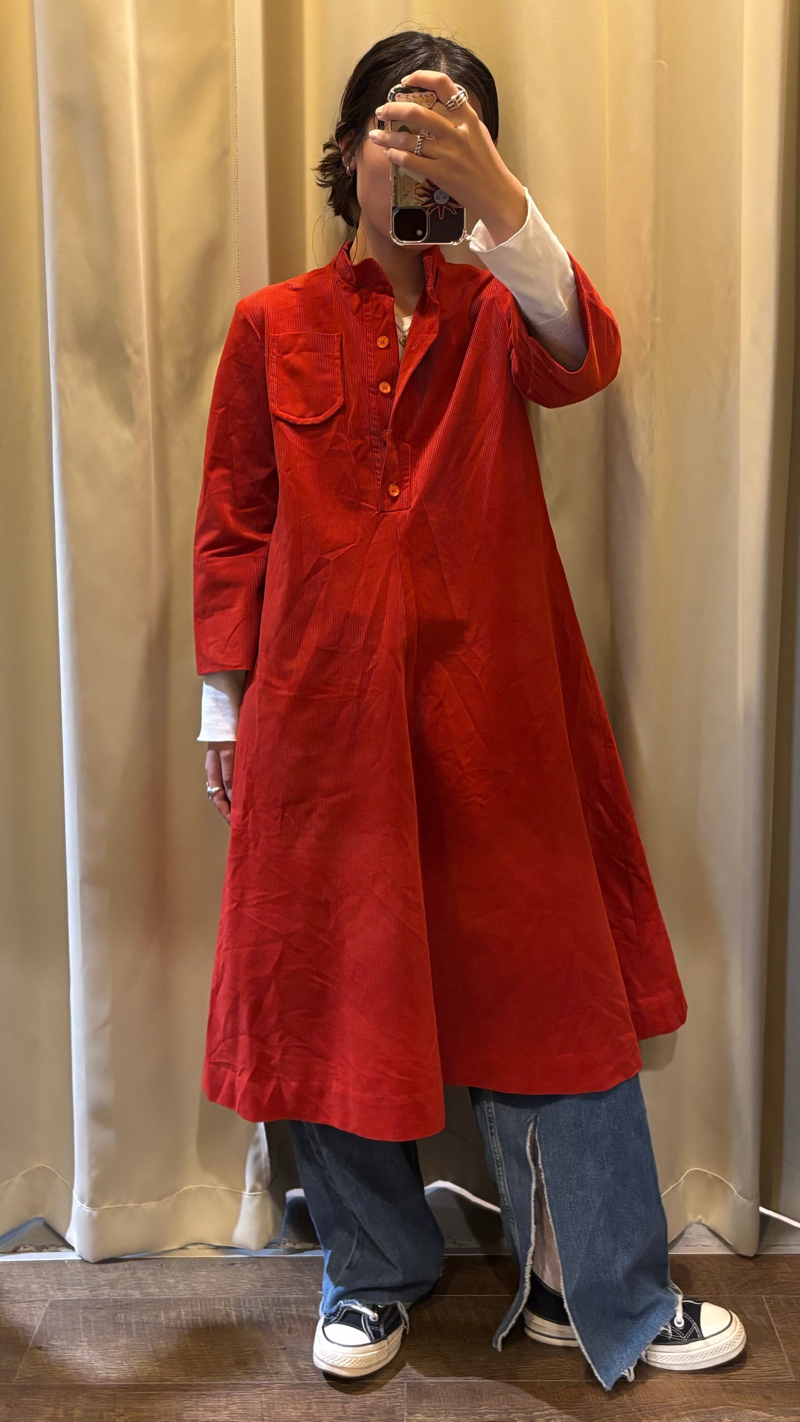 オレンジ色がパッと目を引く、コーデュロイのミディー丈ワンピース。
