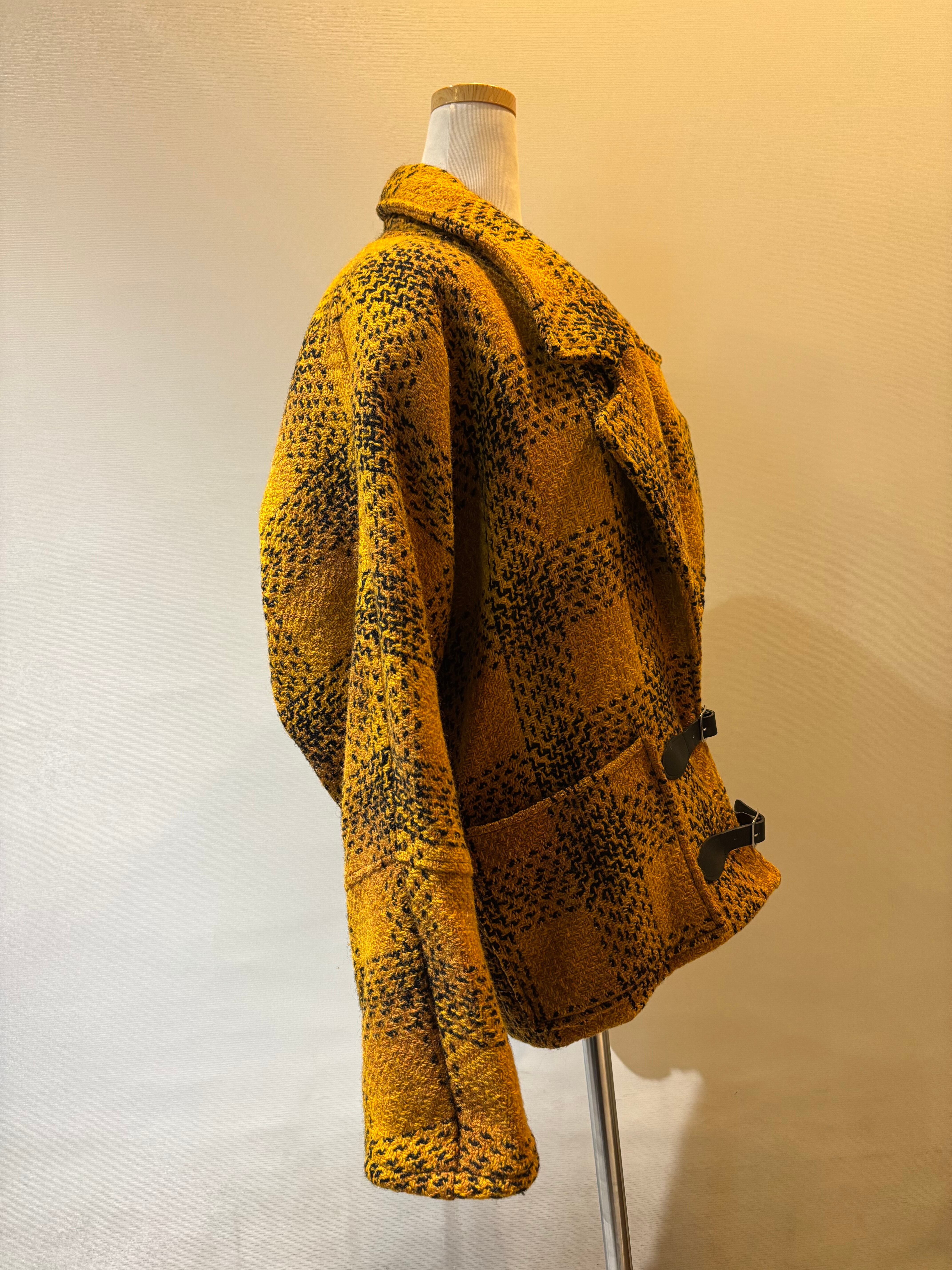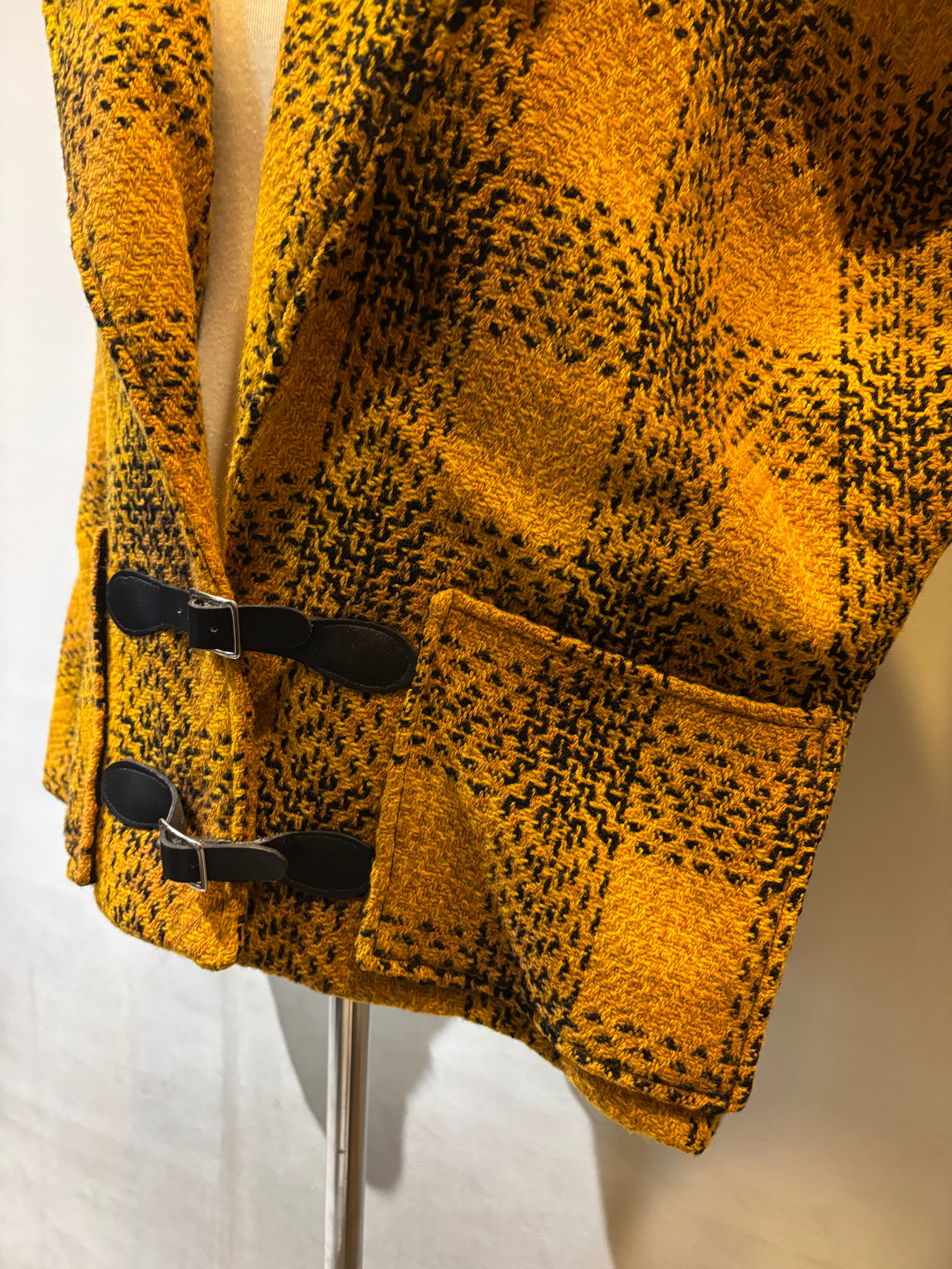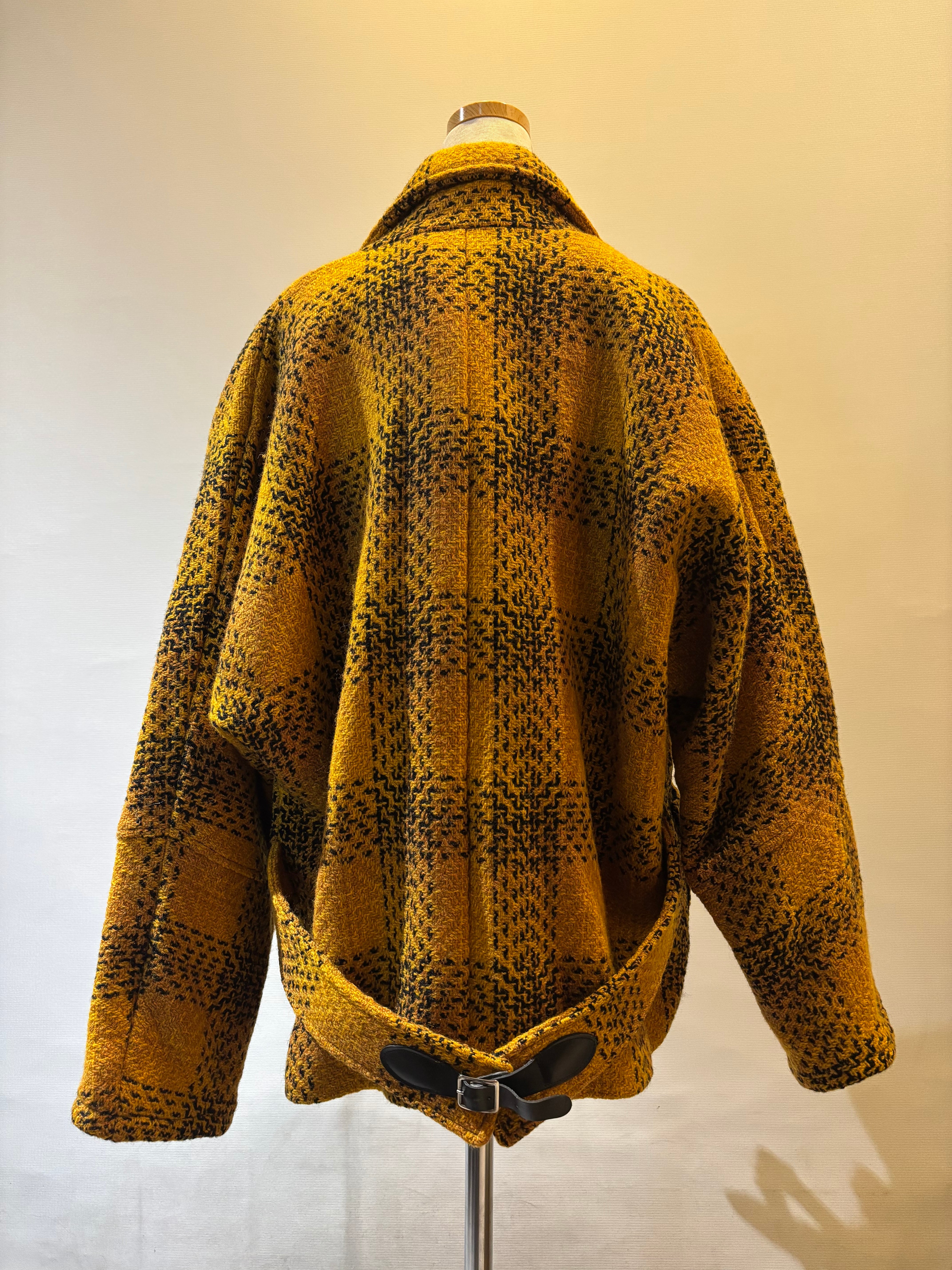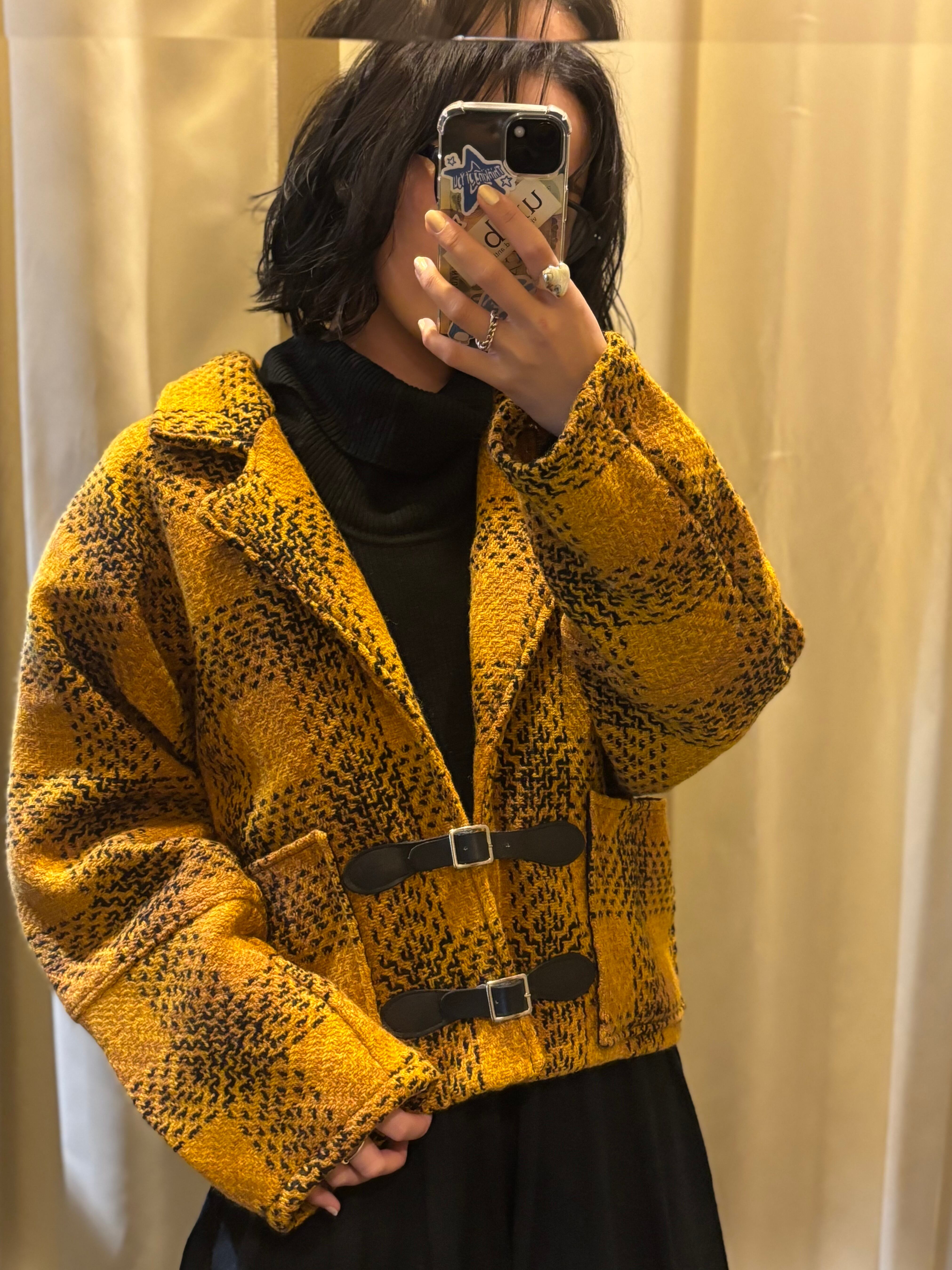肩落ちしたシルエットが可愛い、マスタードカラーのチェックツイードジャケット。