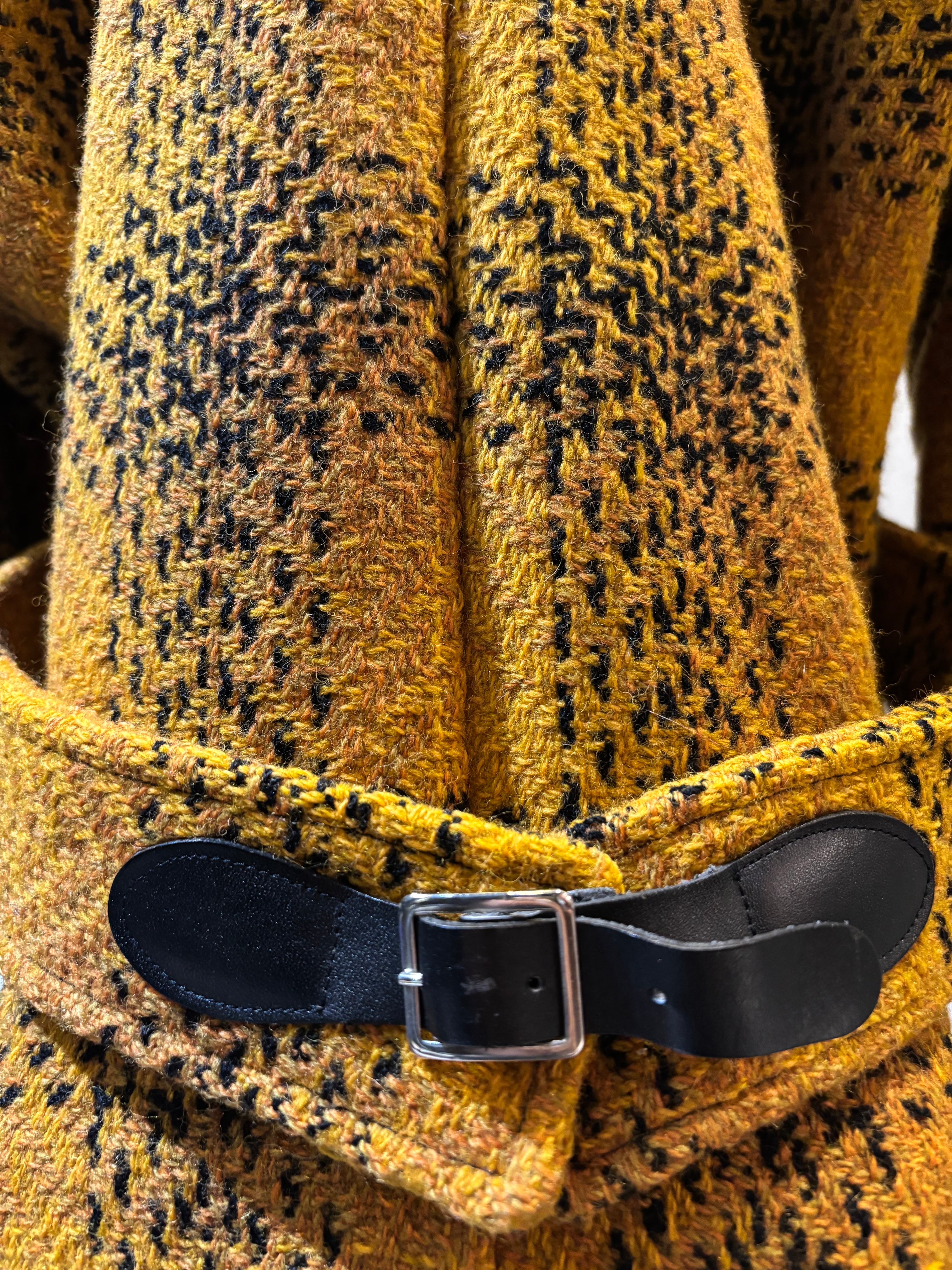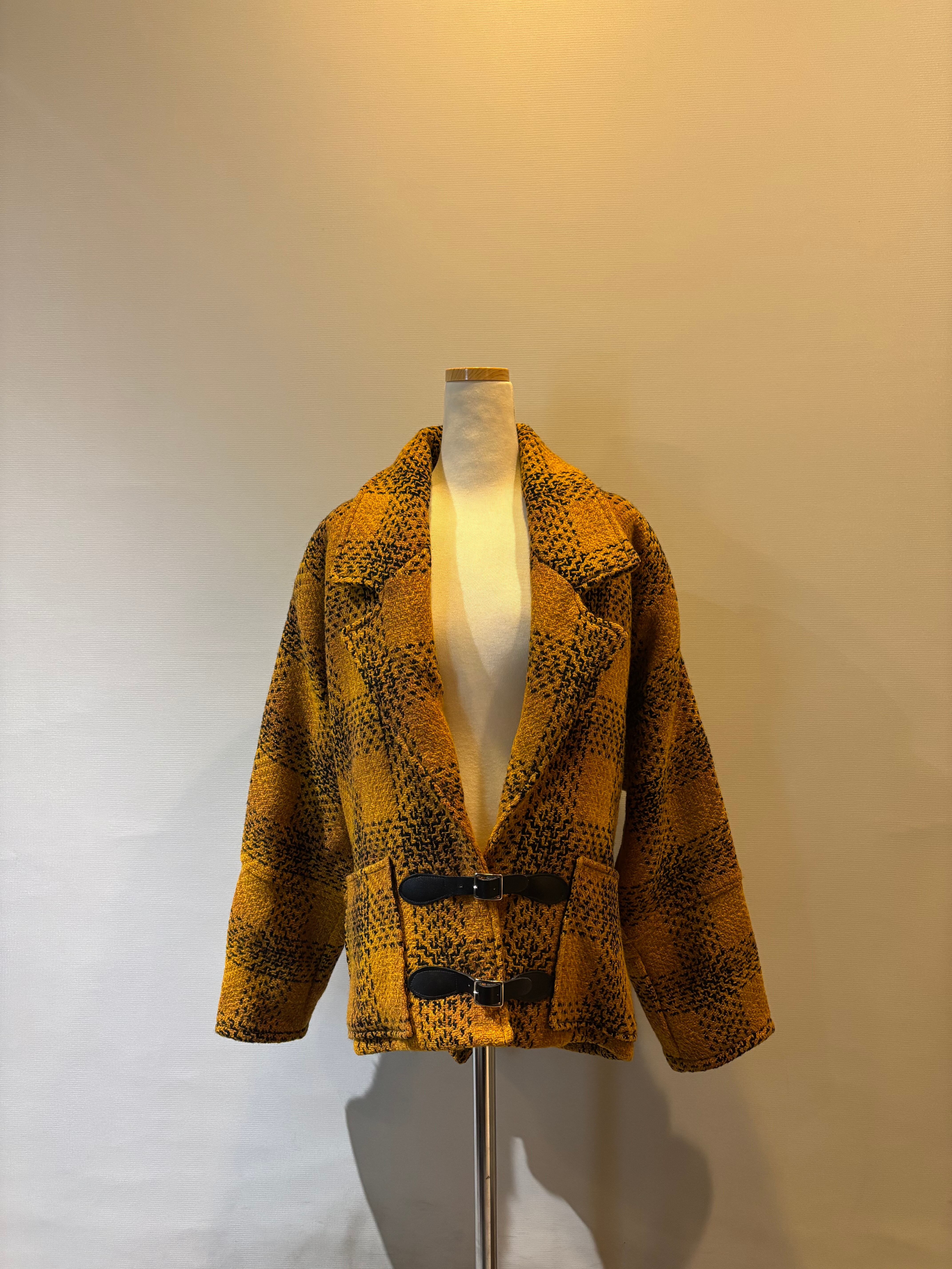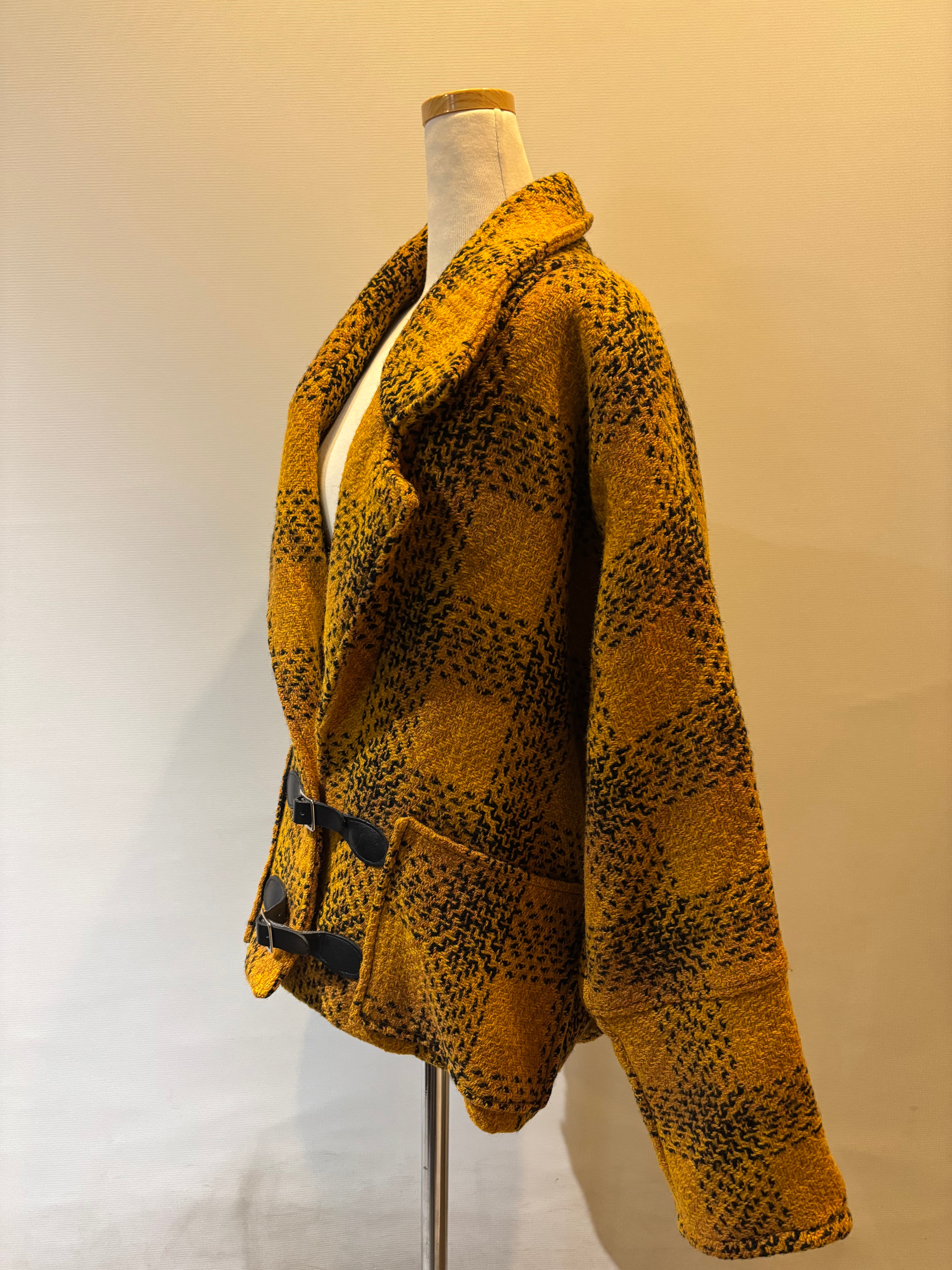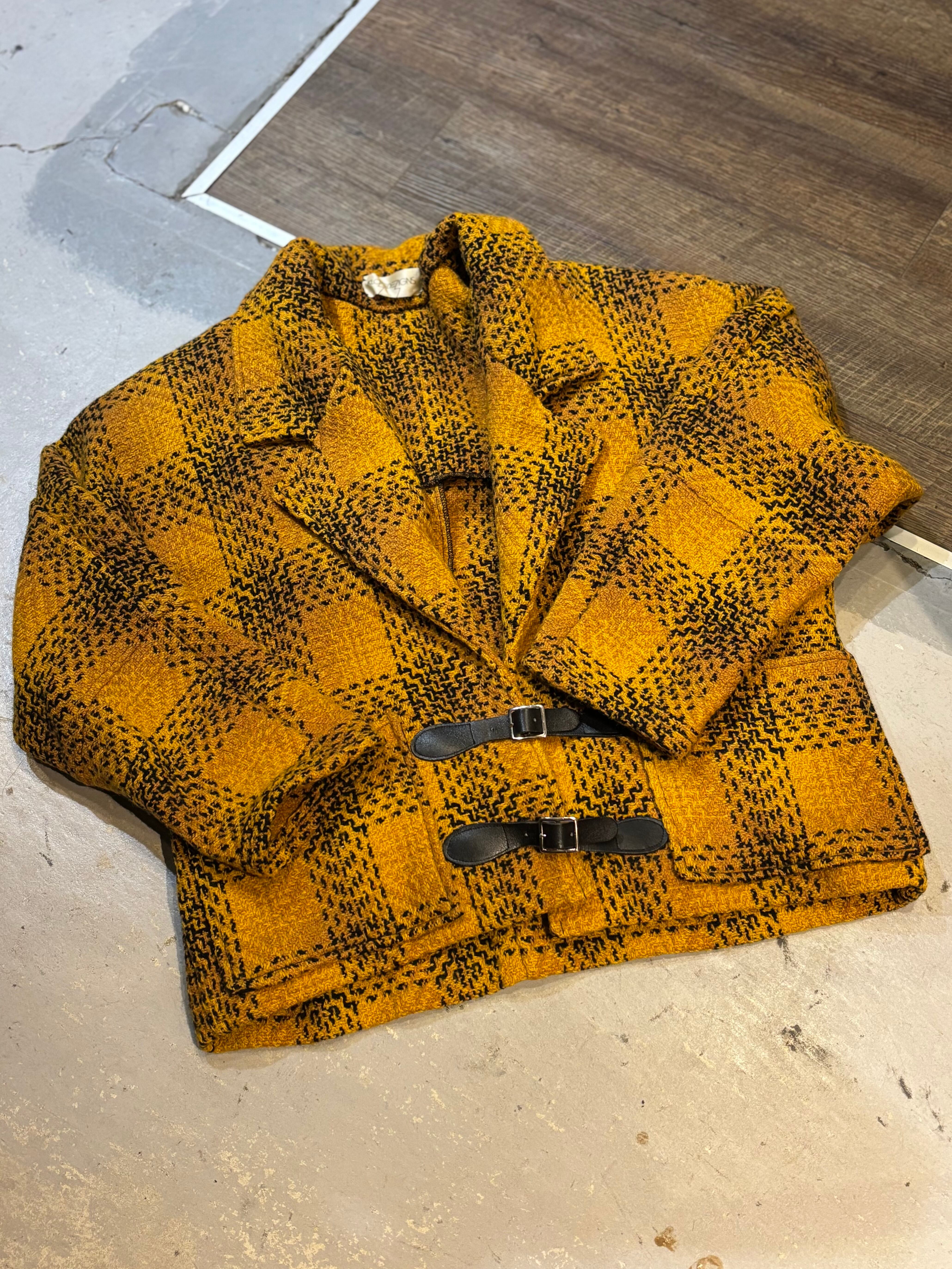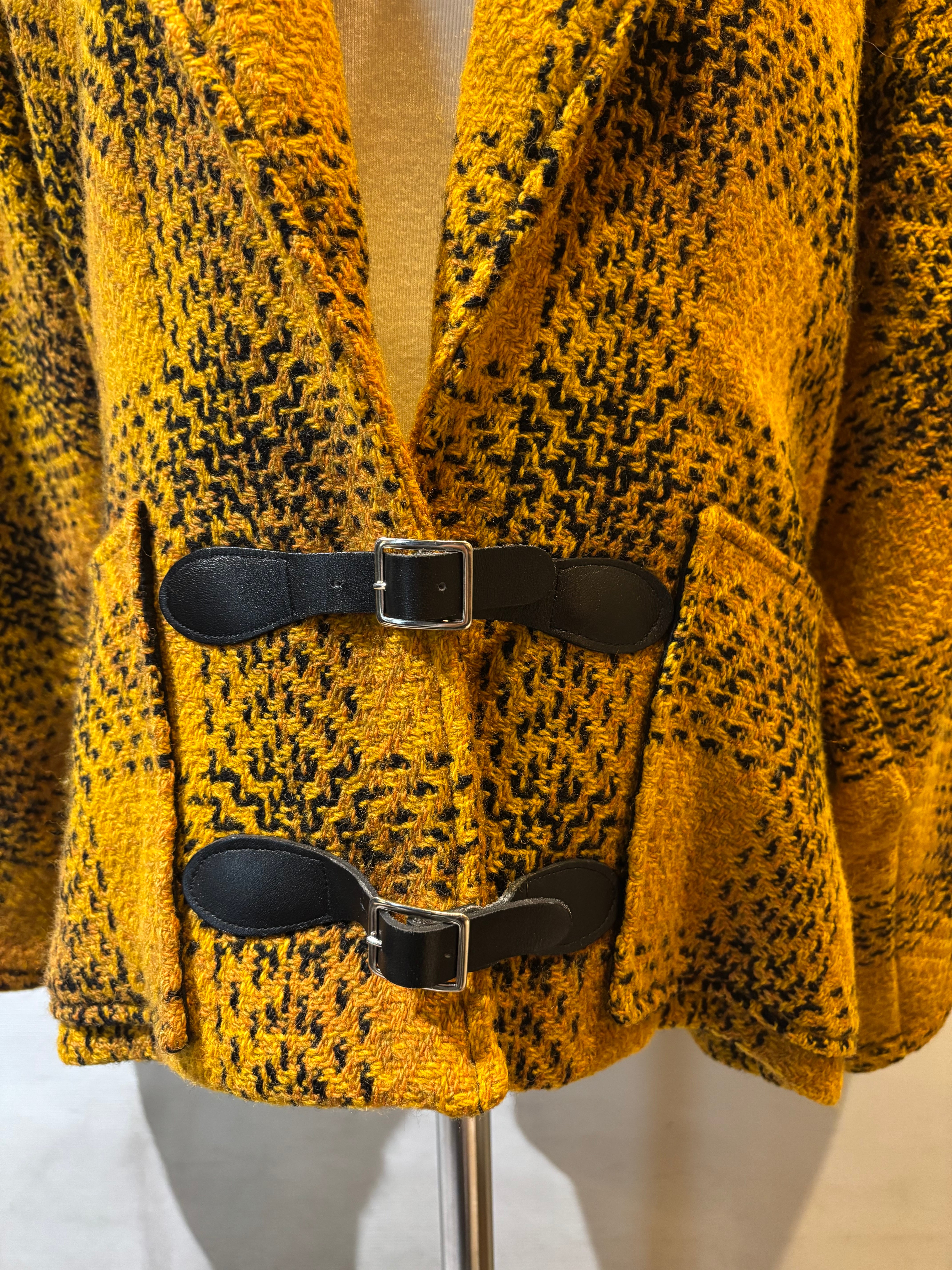肩落ちしたシルエットが可愛い、マスタードカラーのチェックツイードジャケット。