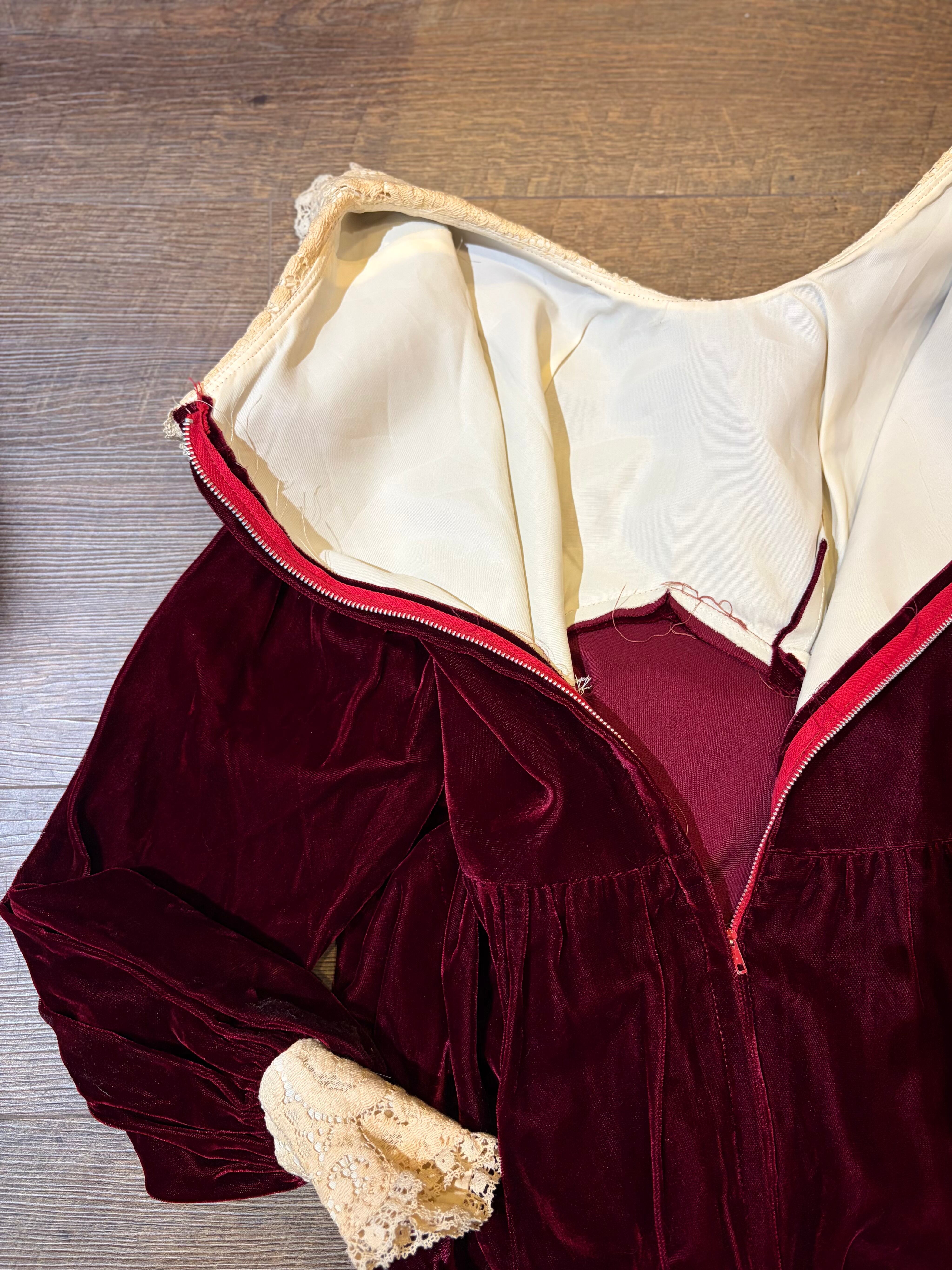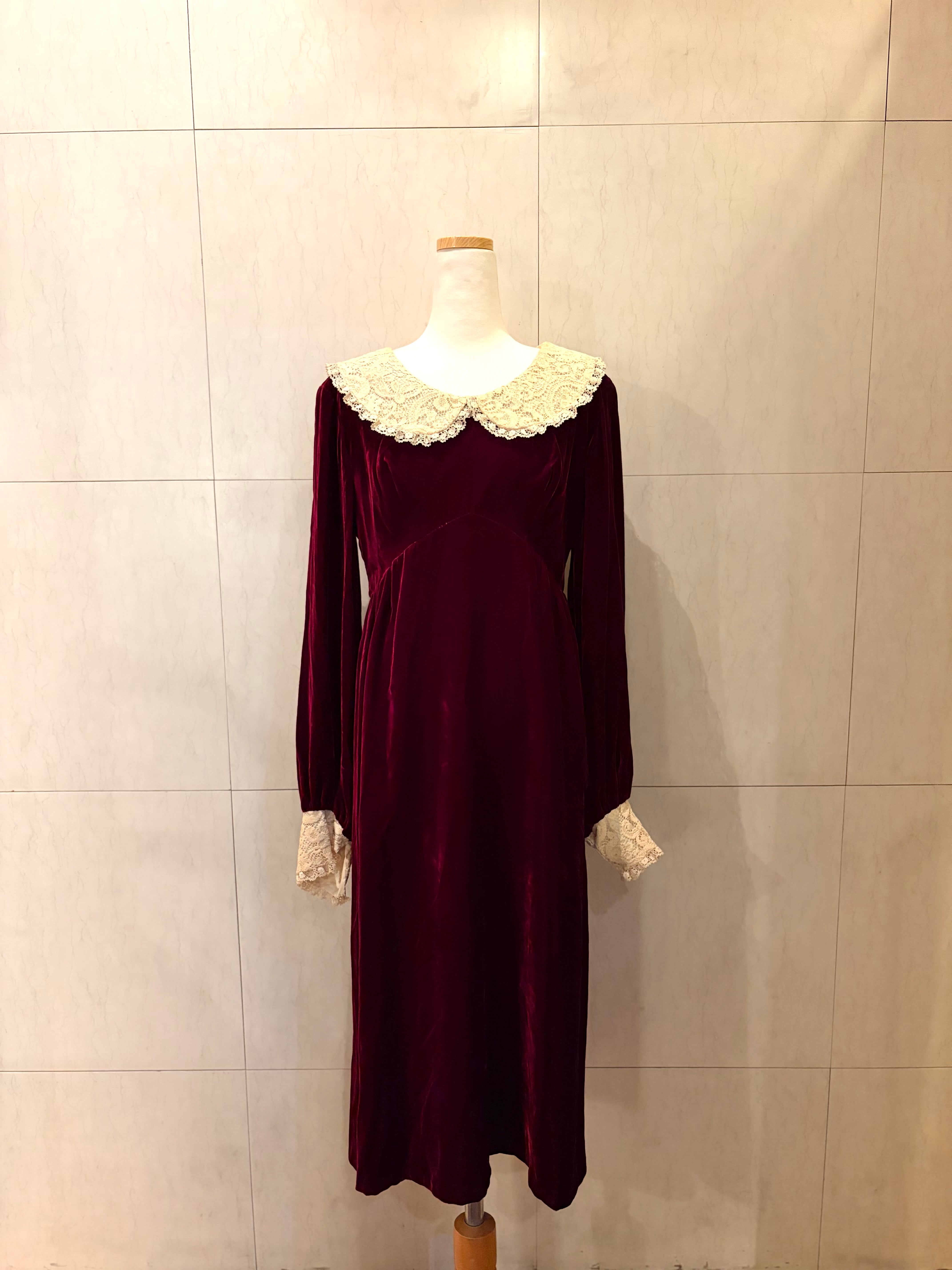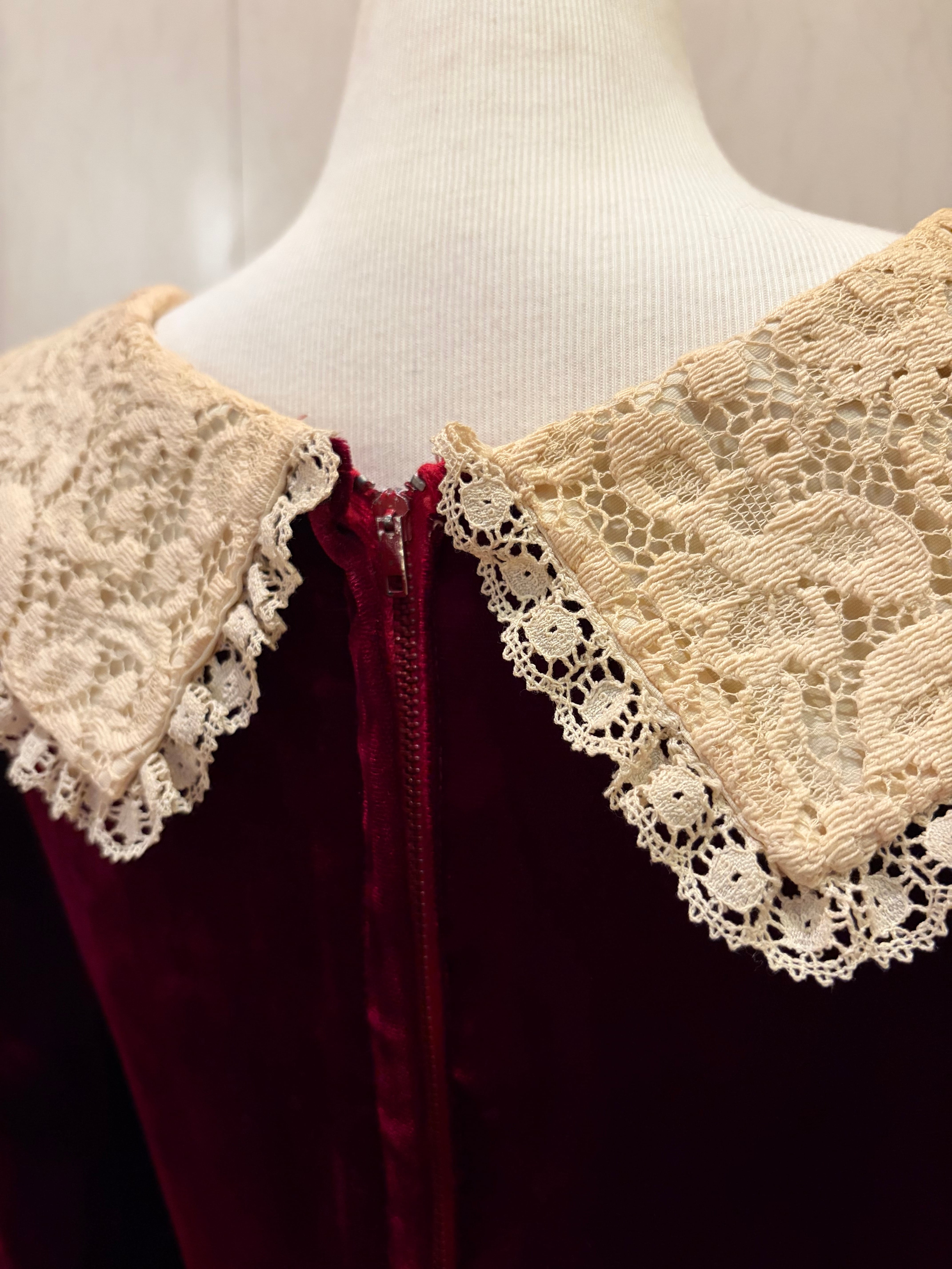 ラウンドカラーのレースとパフスリーブのディテールがクラシカルな雰囲気を演出する、ボルドーカラーが印象的なベルベットワンピース。