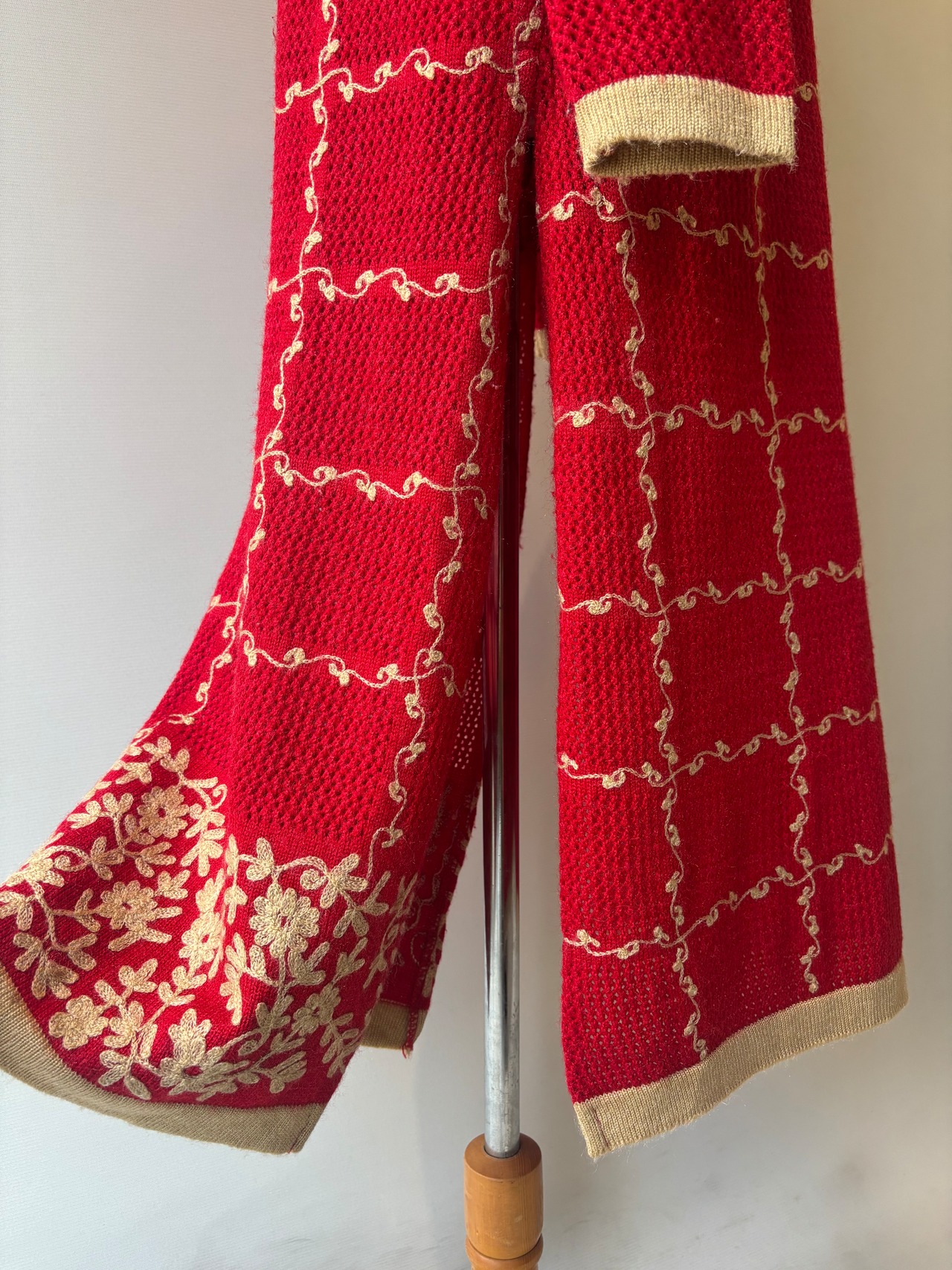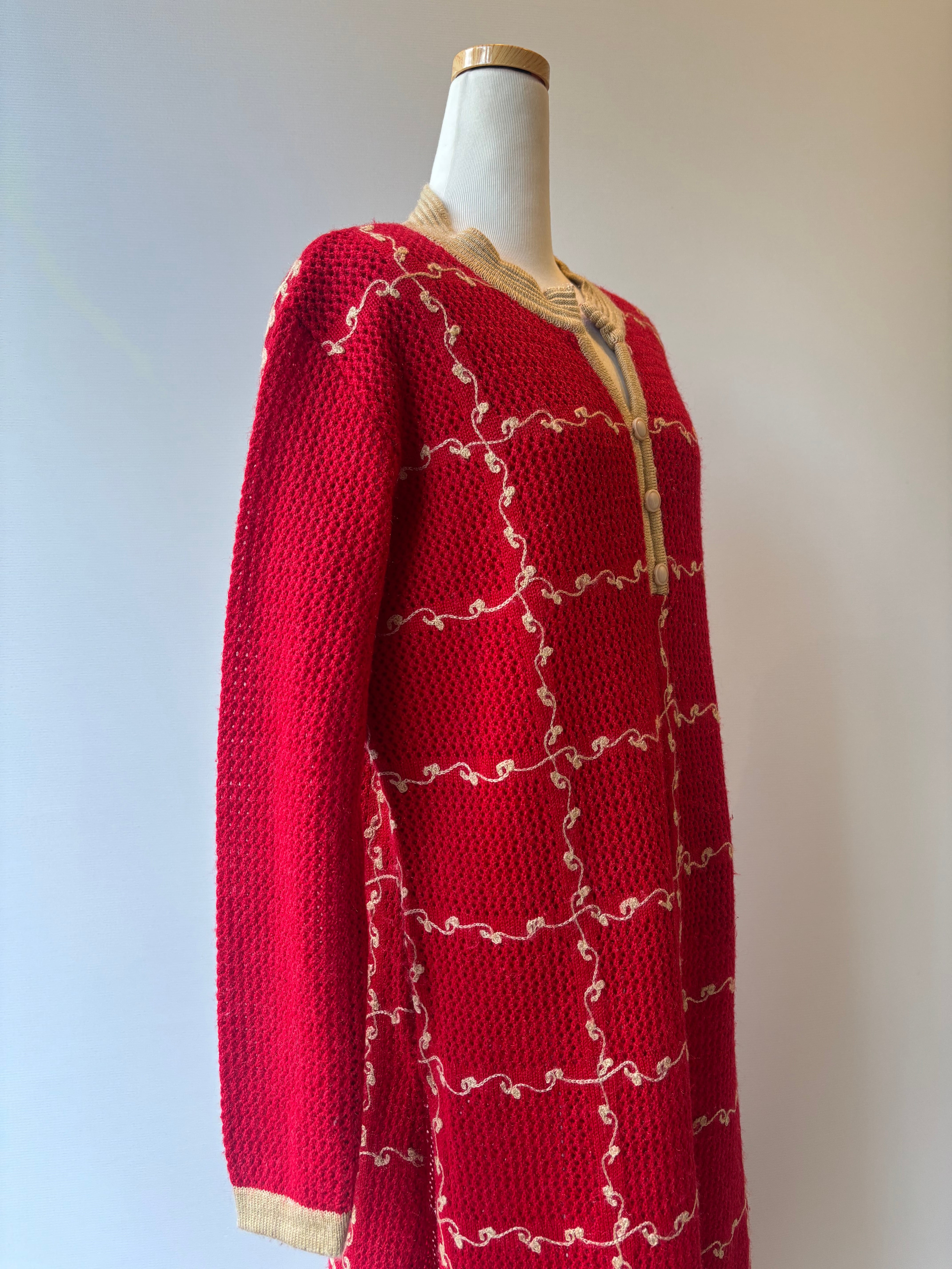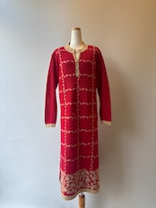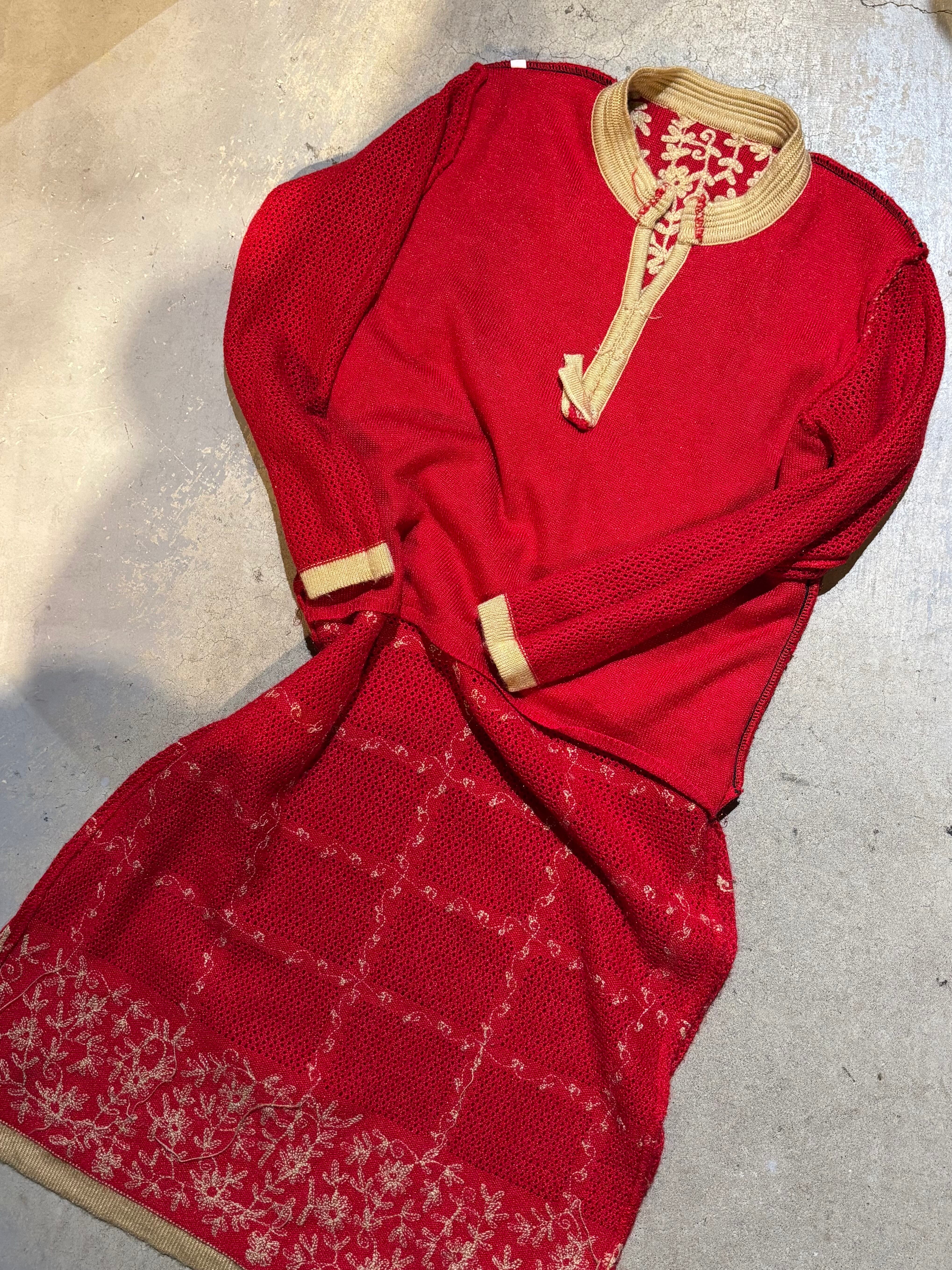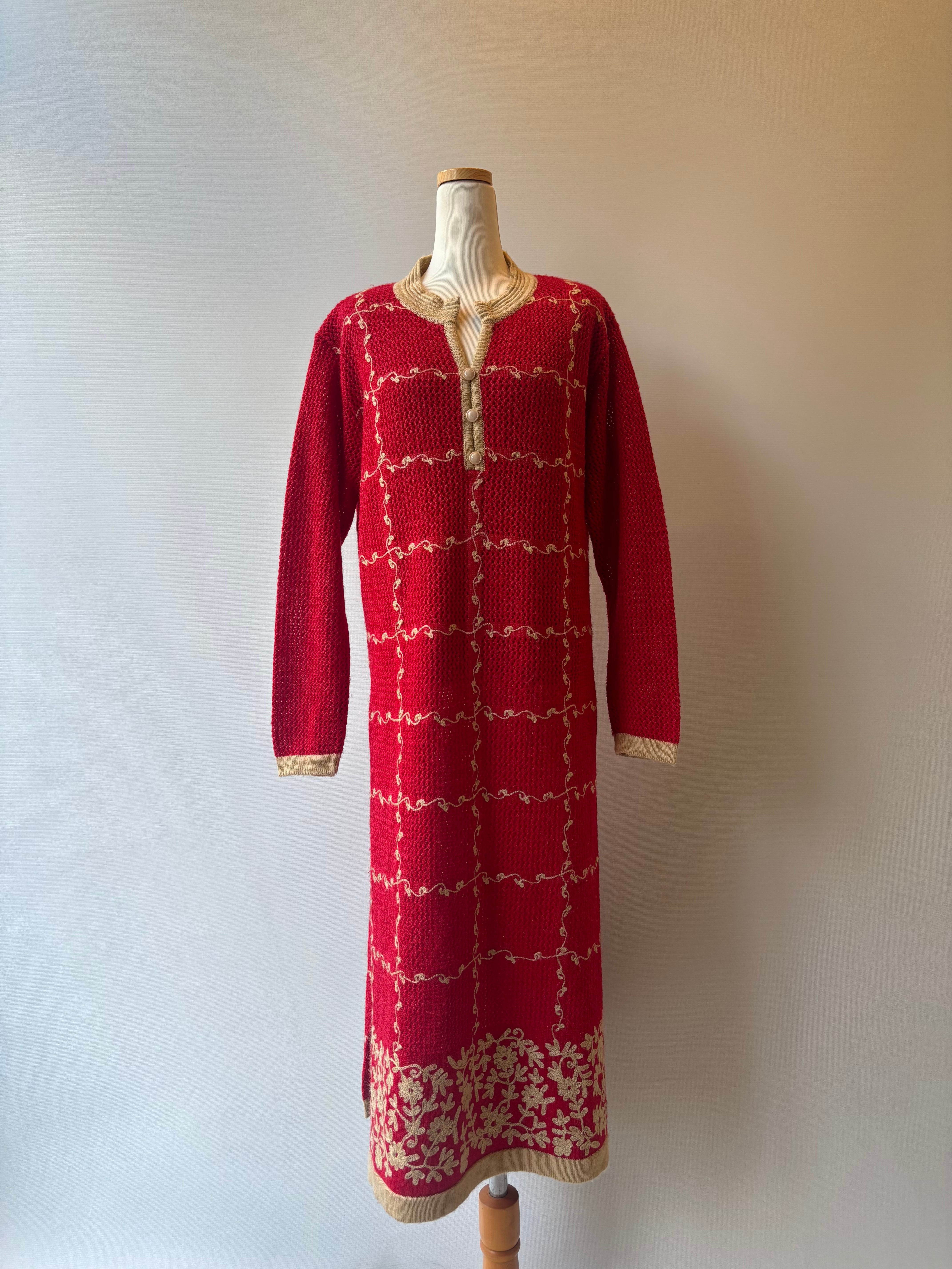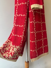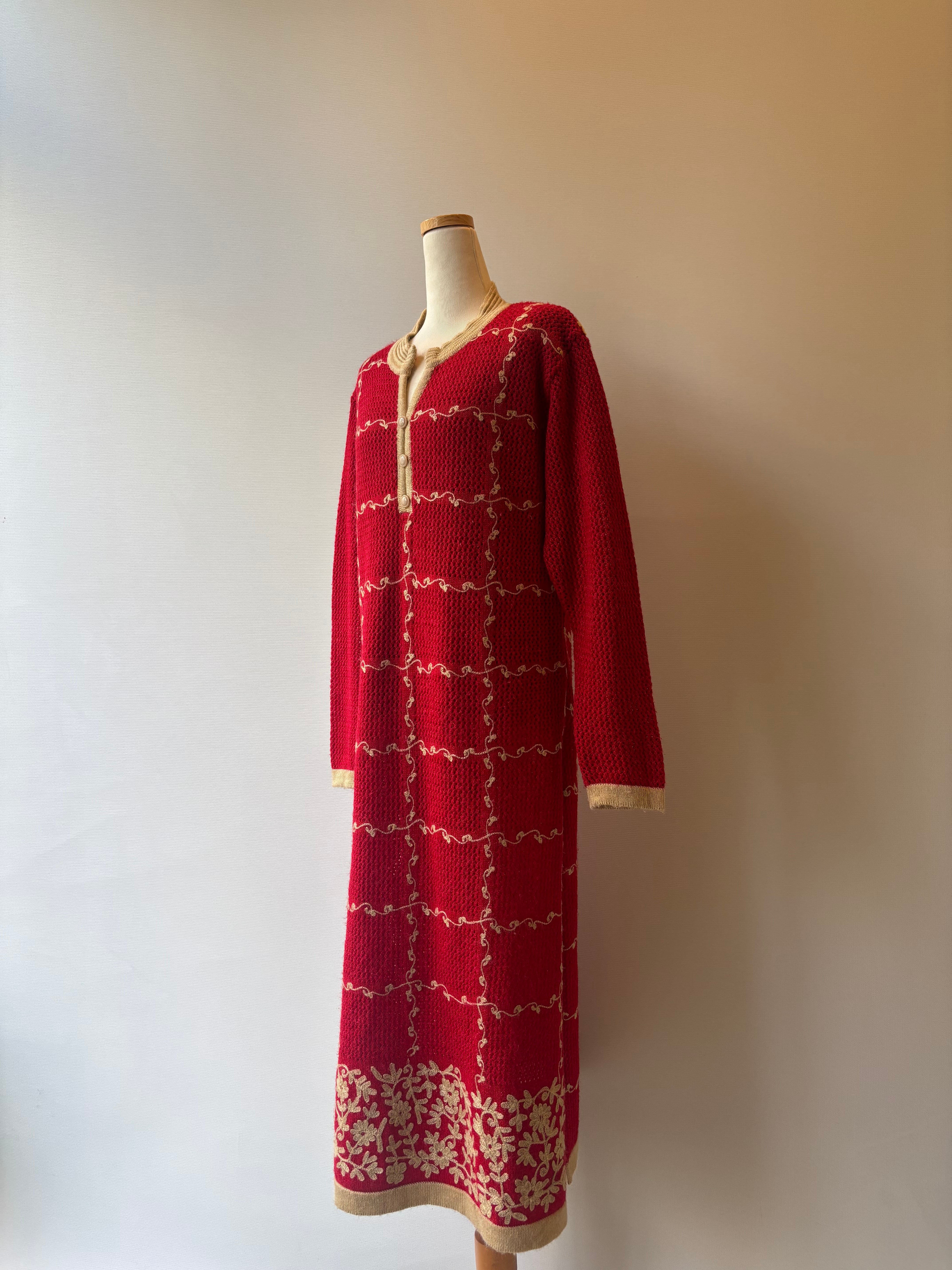 赤×ベージュの配色が絶妙な、刺繍のワンピース。