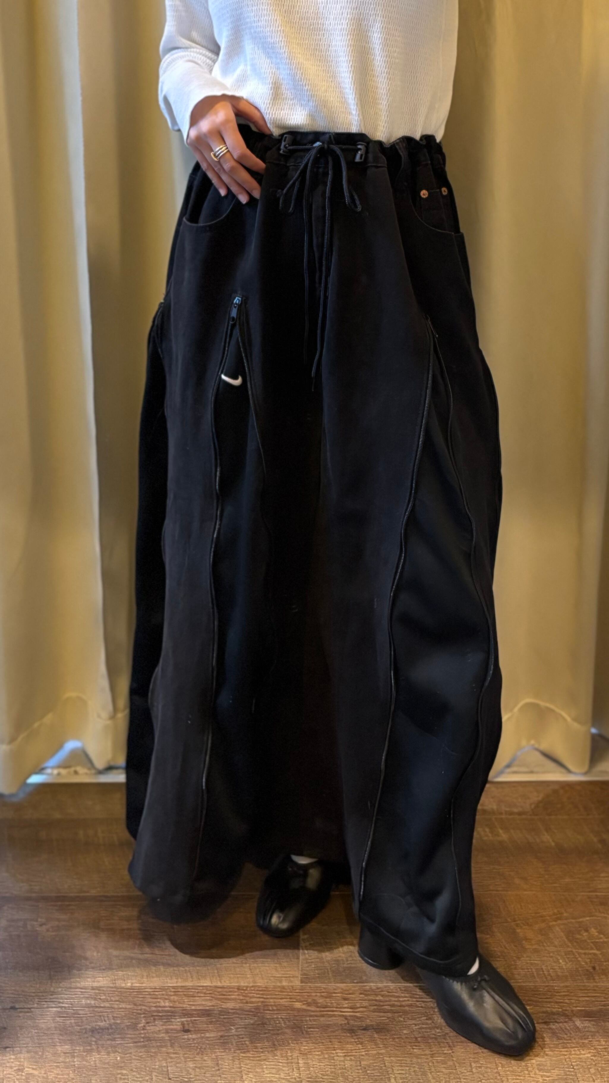 ロングジップが印象的なリメイク風、ブラックカラーのデニムスカート。