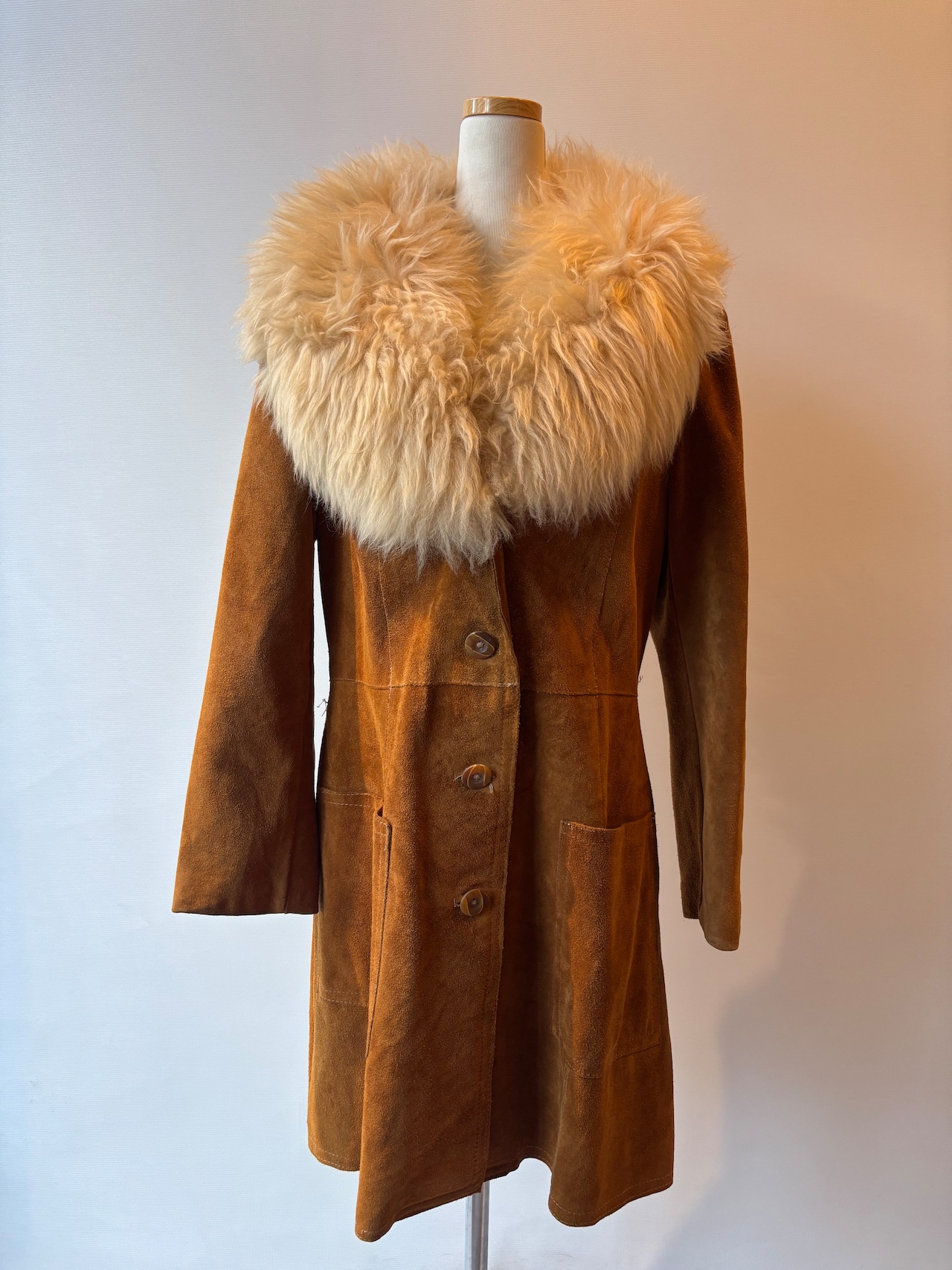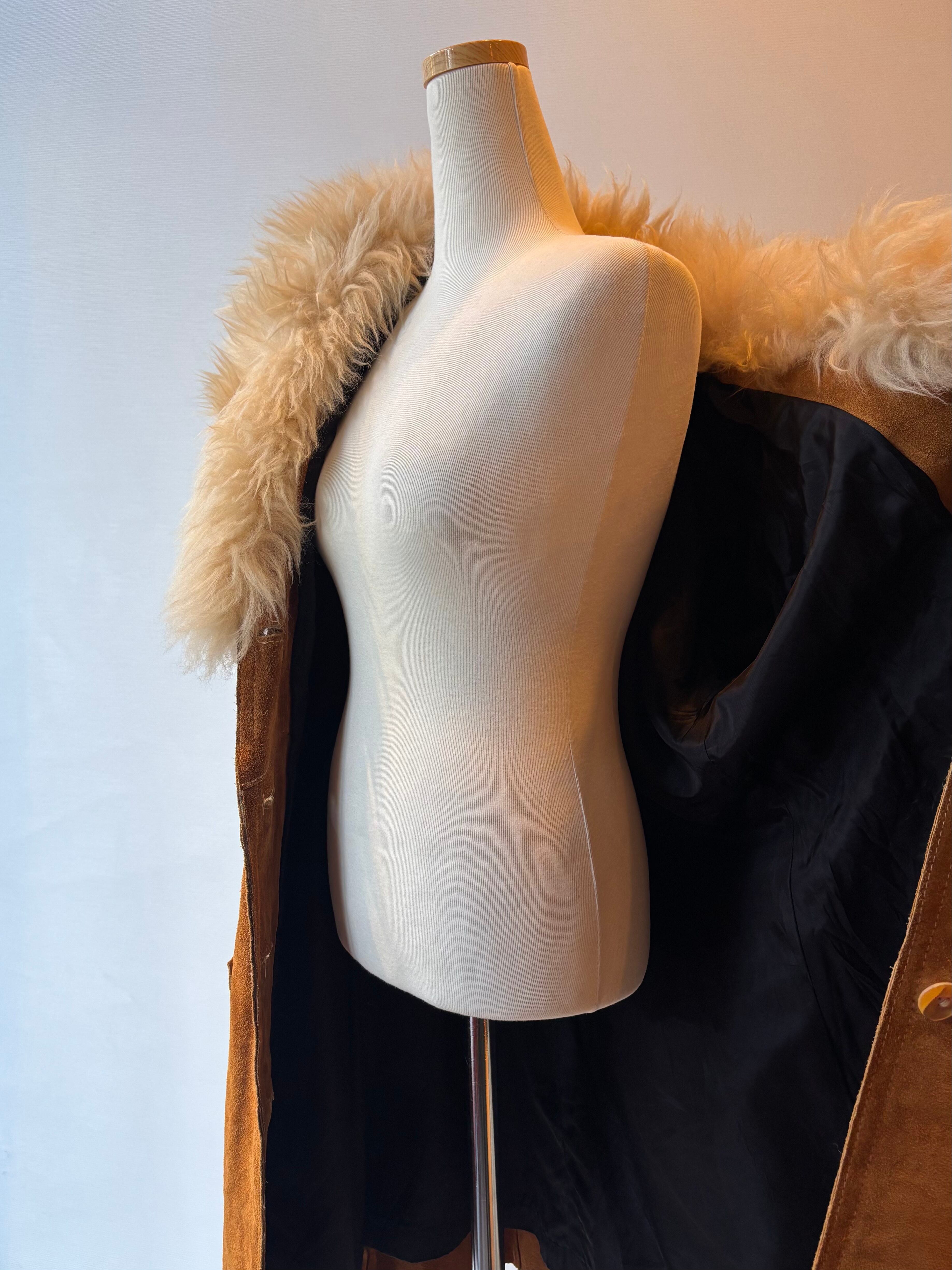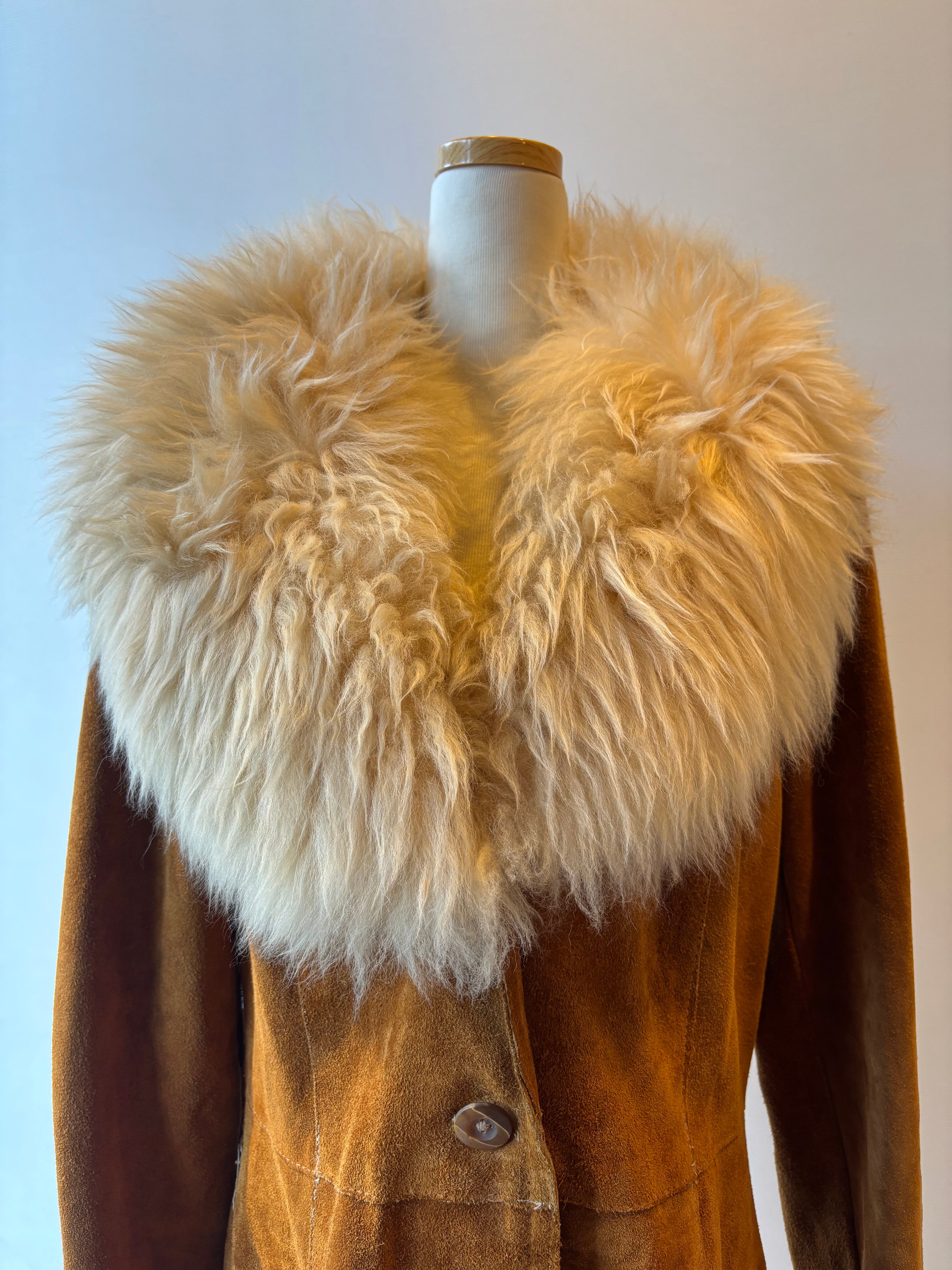 首元はボリュームたっぷりのファーに、キャメルカラーのスウェードコート。