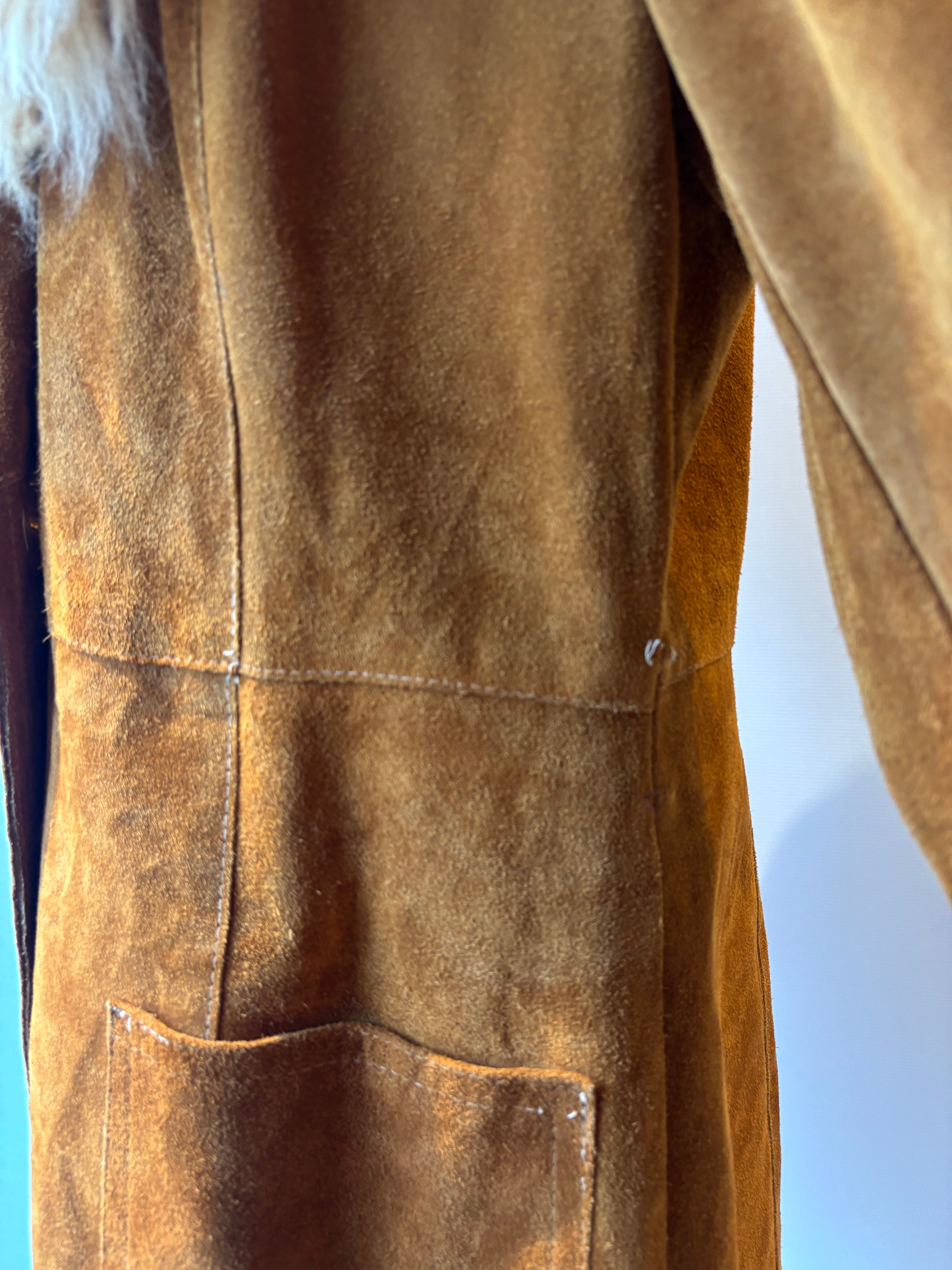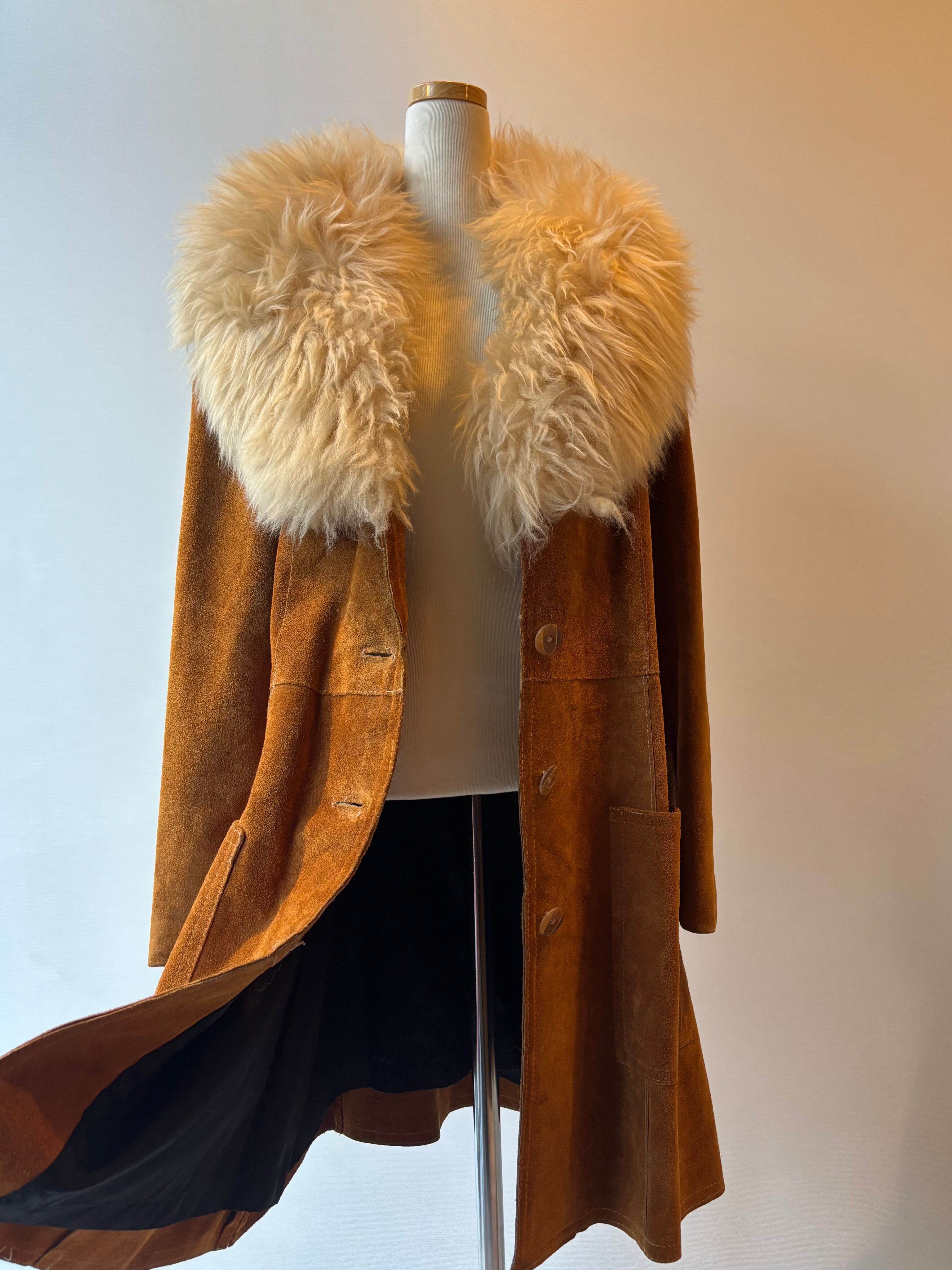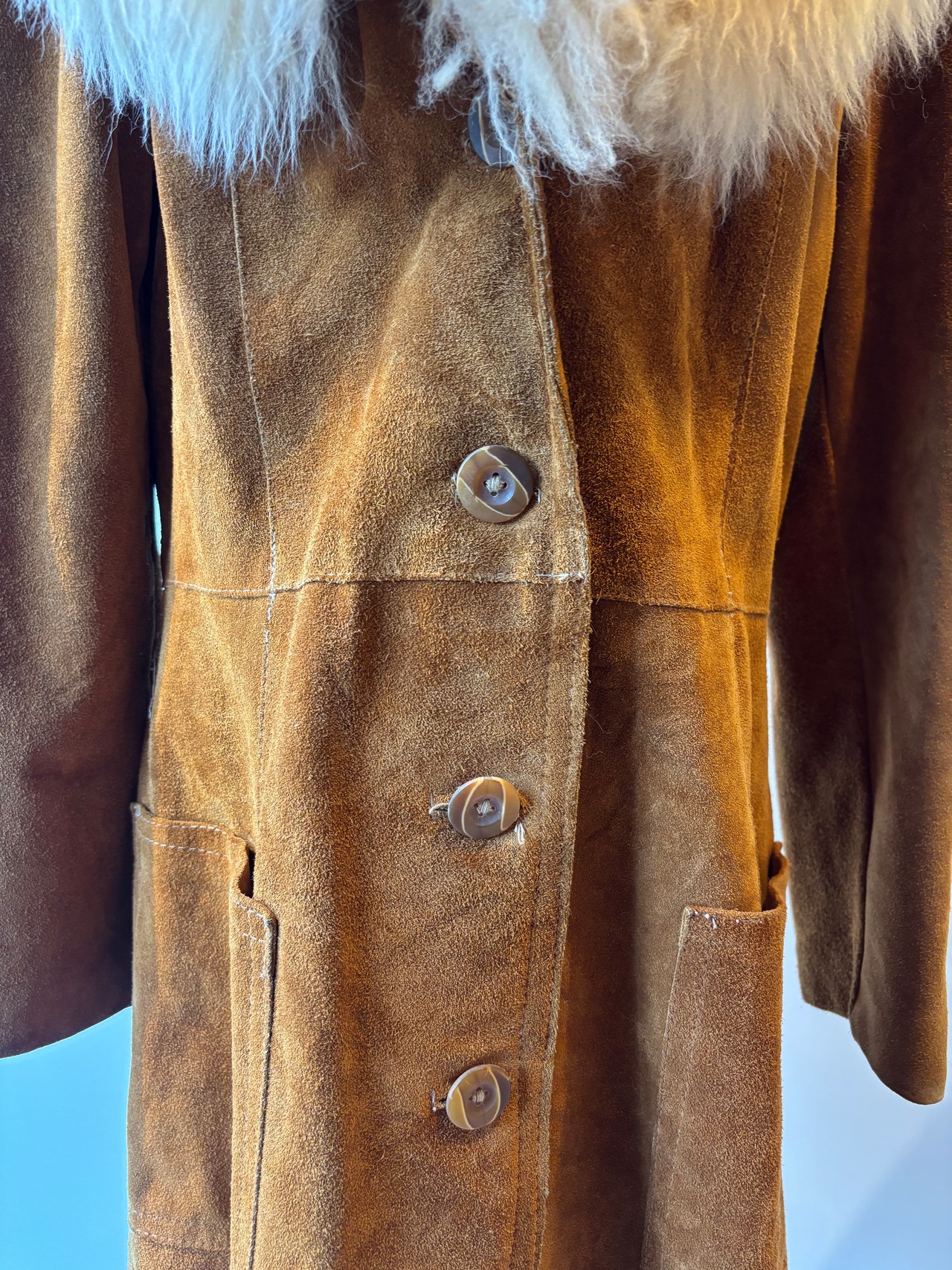 首元はボリュームたっぷりのファーに、キャメルカラーのスウェードコート。