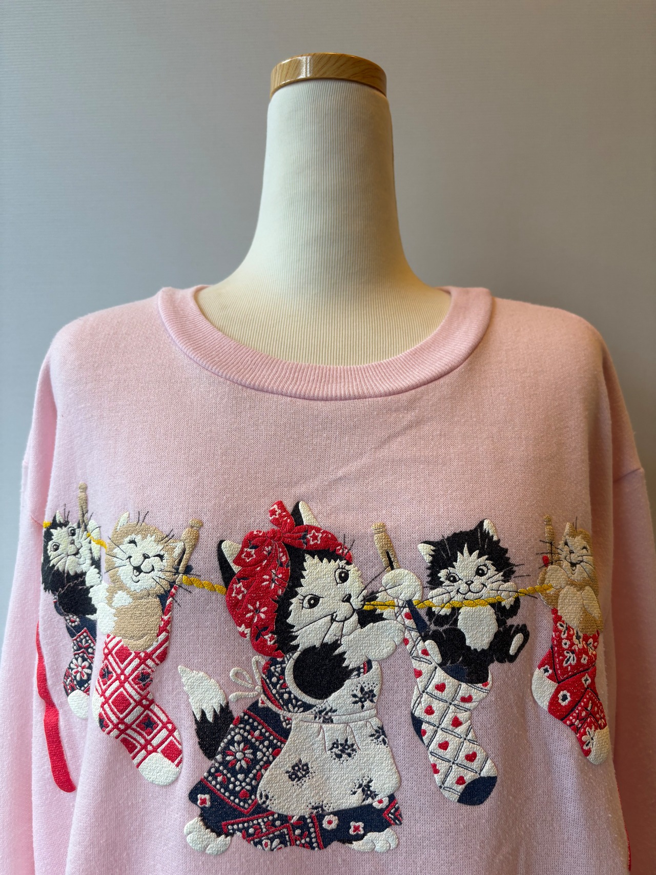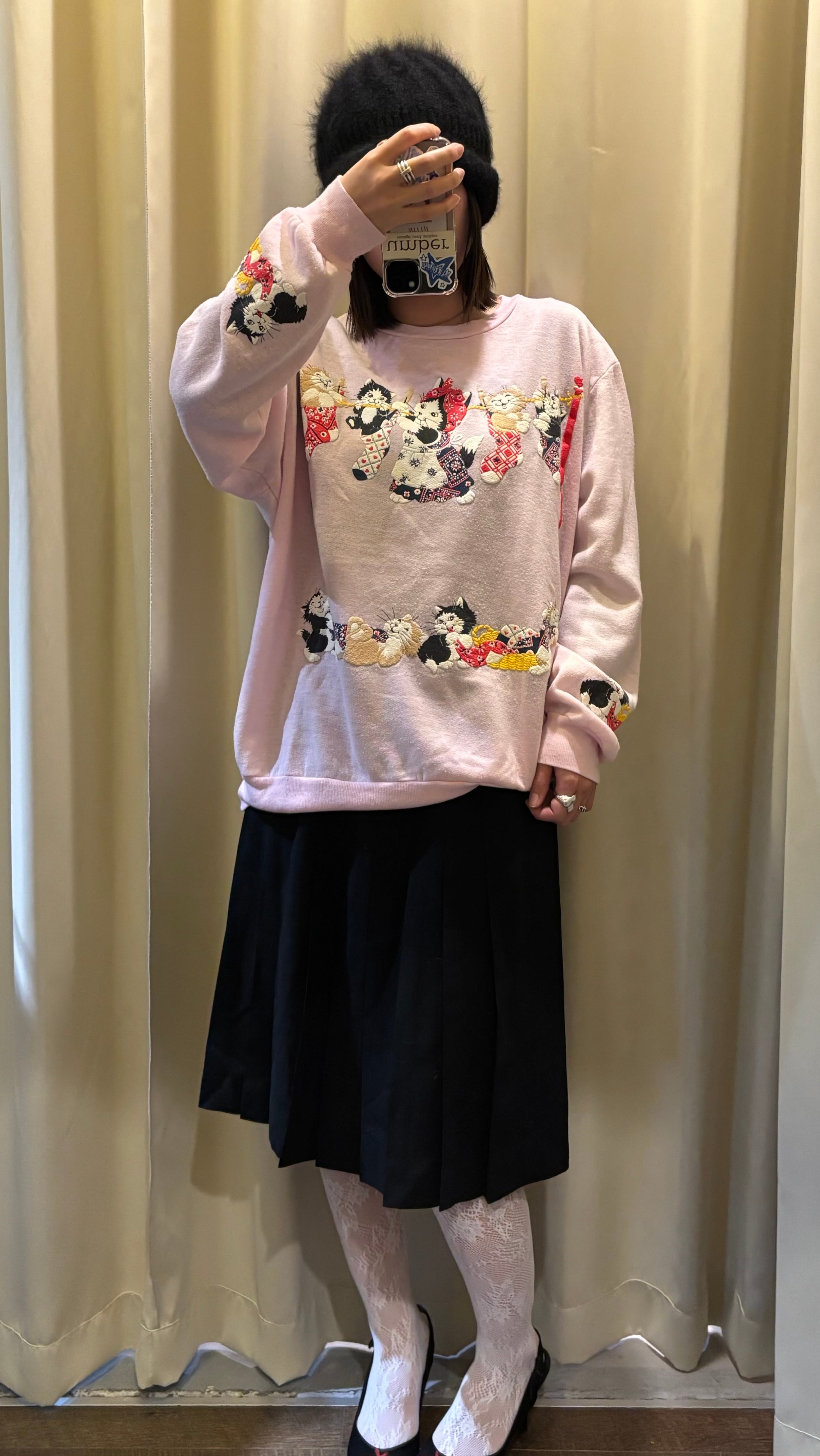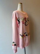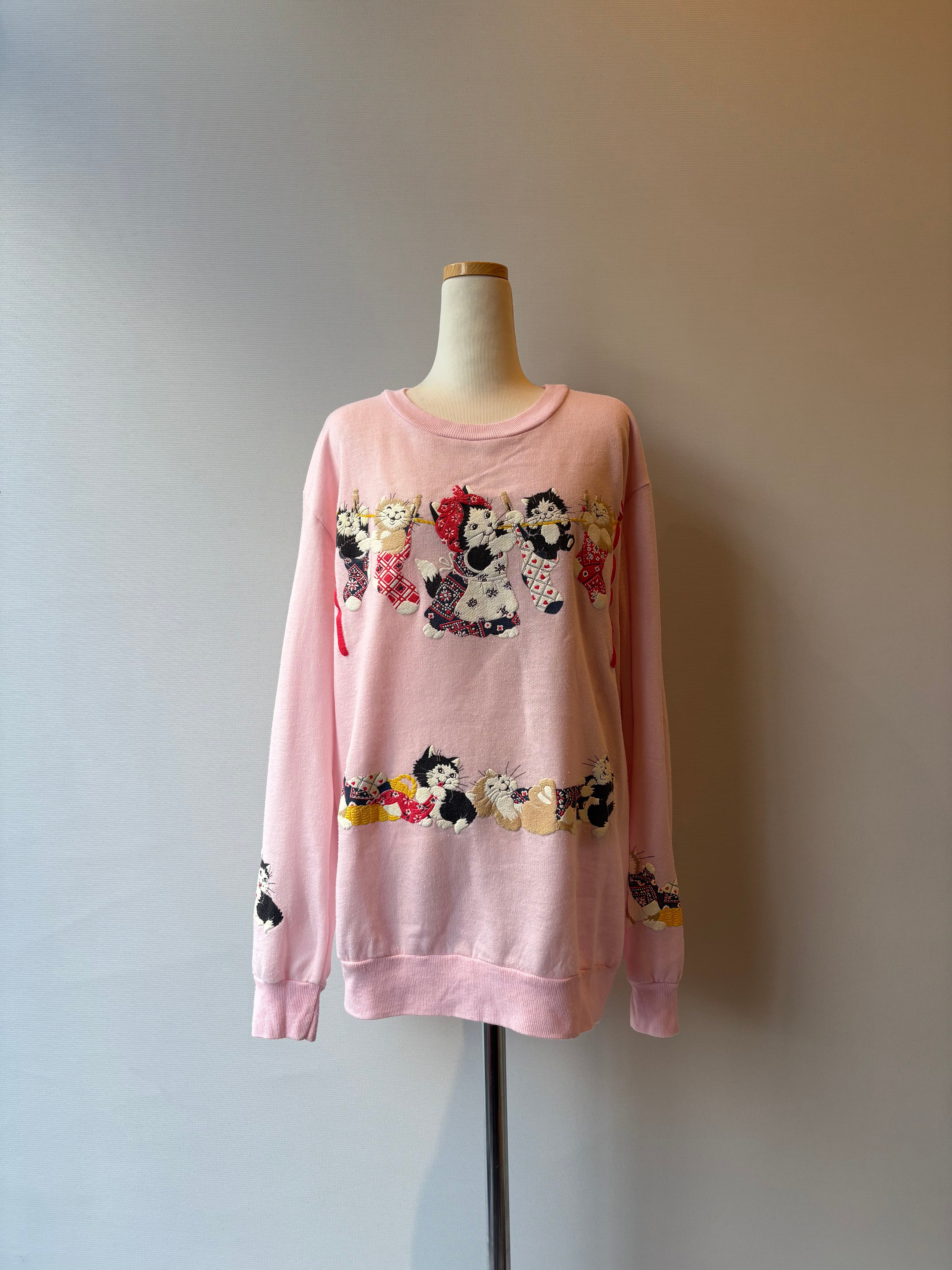 立体的なキャットプリントが可愛らしい、淡いピンクカラーのスウェットシャツ。