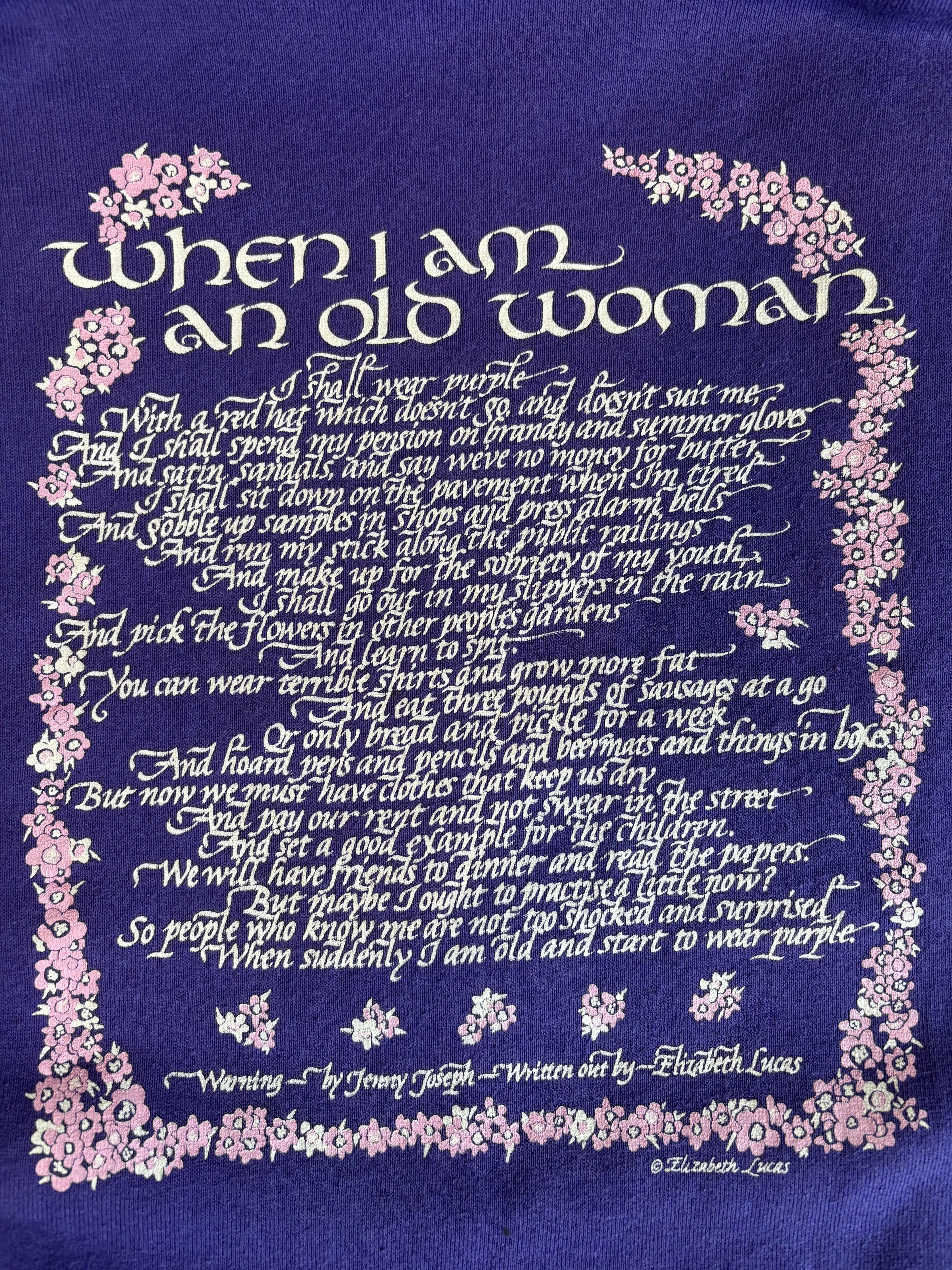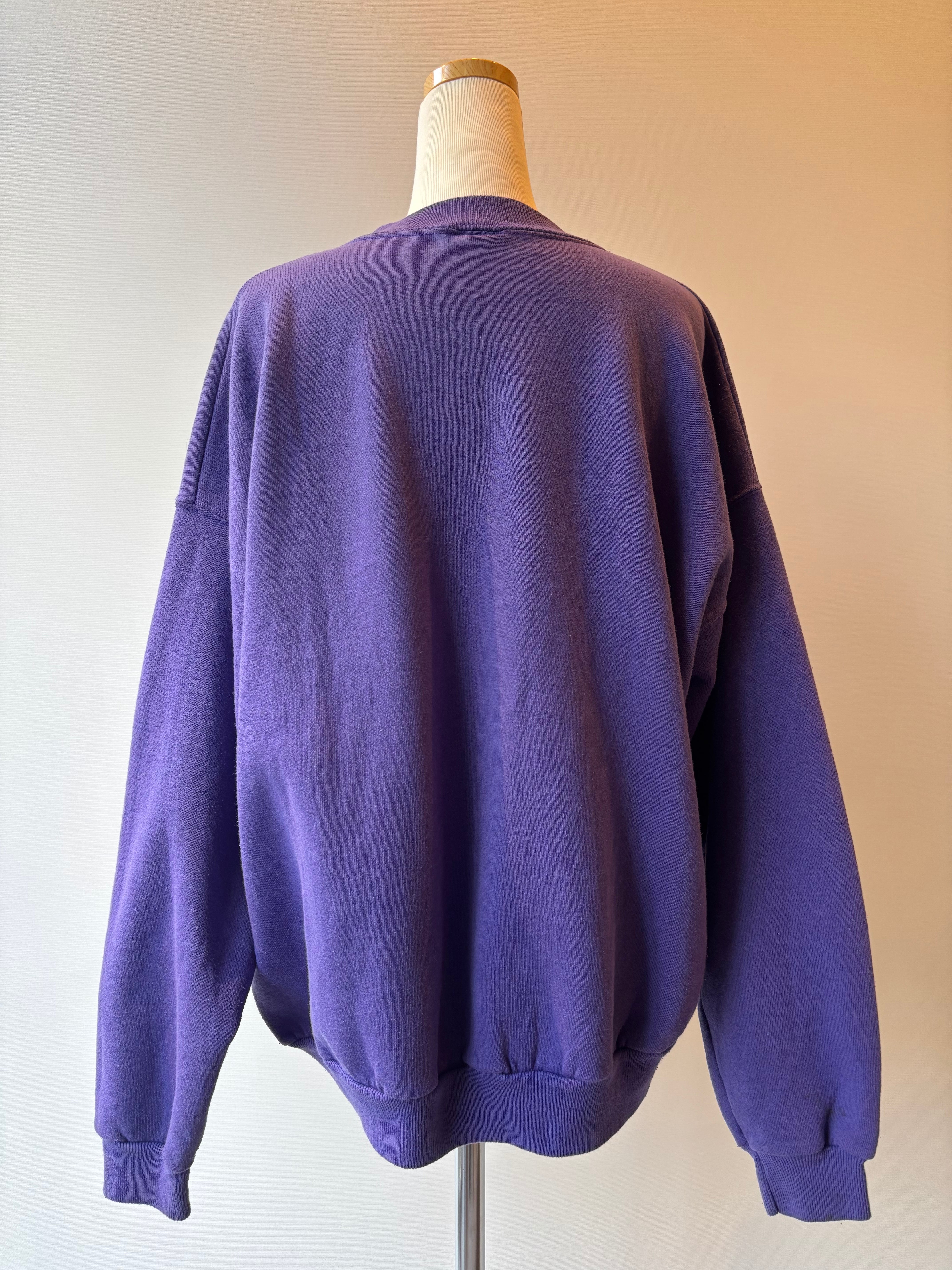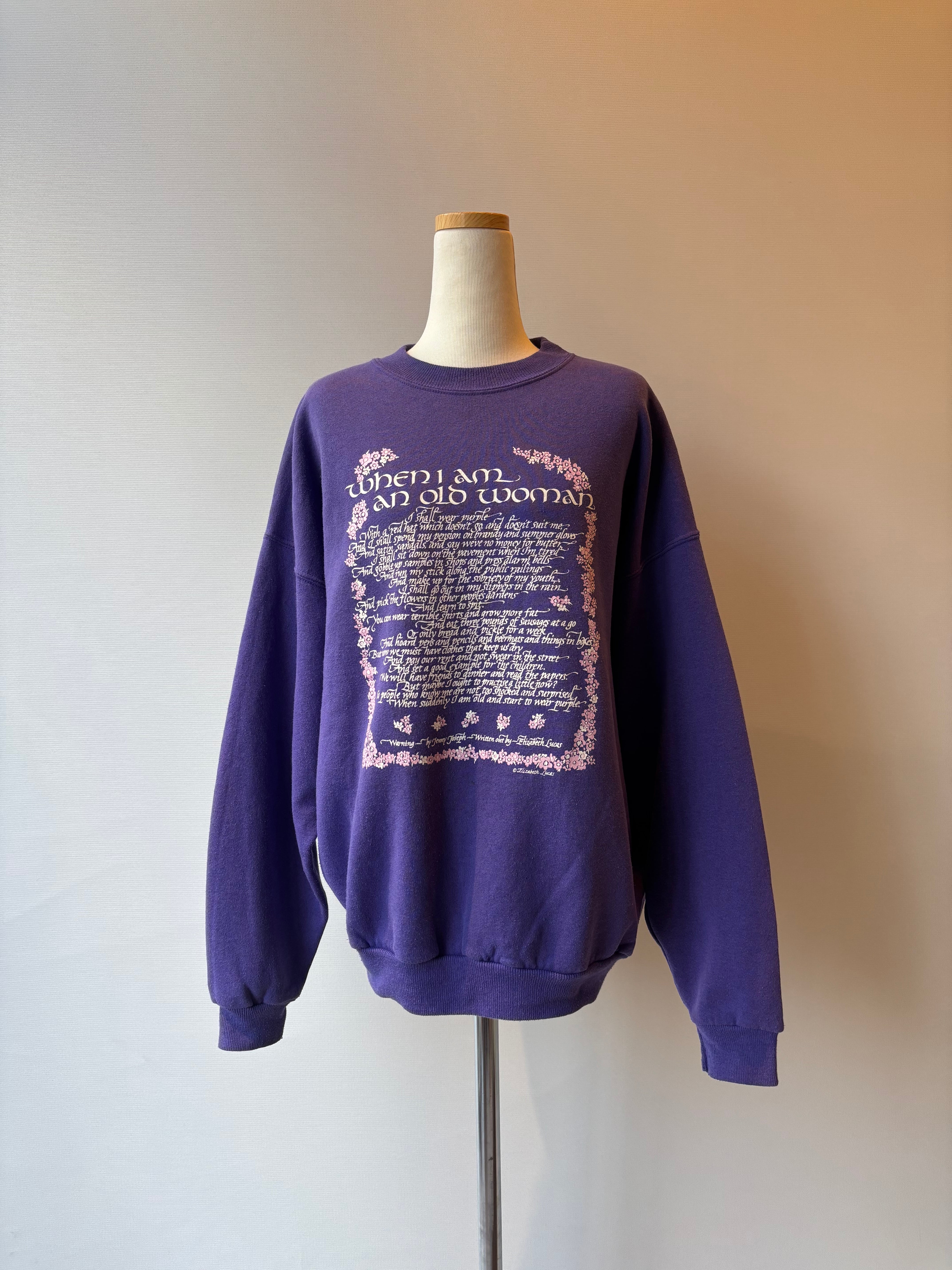 90年代らしいカラーリングと、フラワーフレームが印象的なメッセージスウェット。