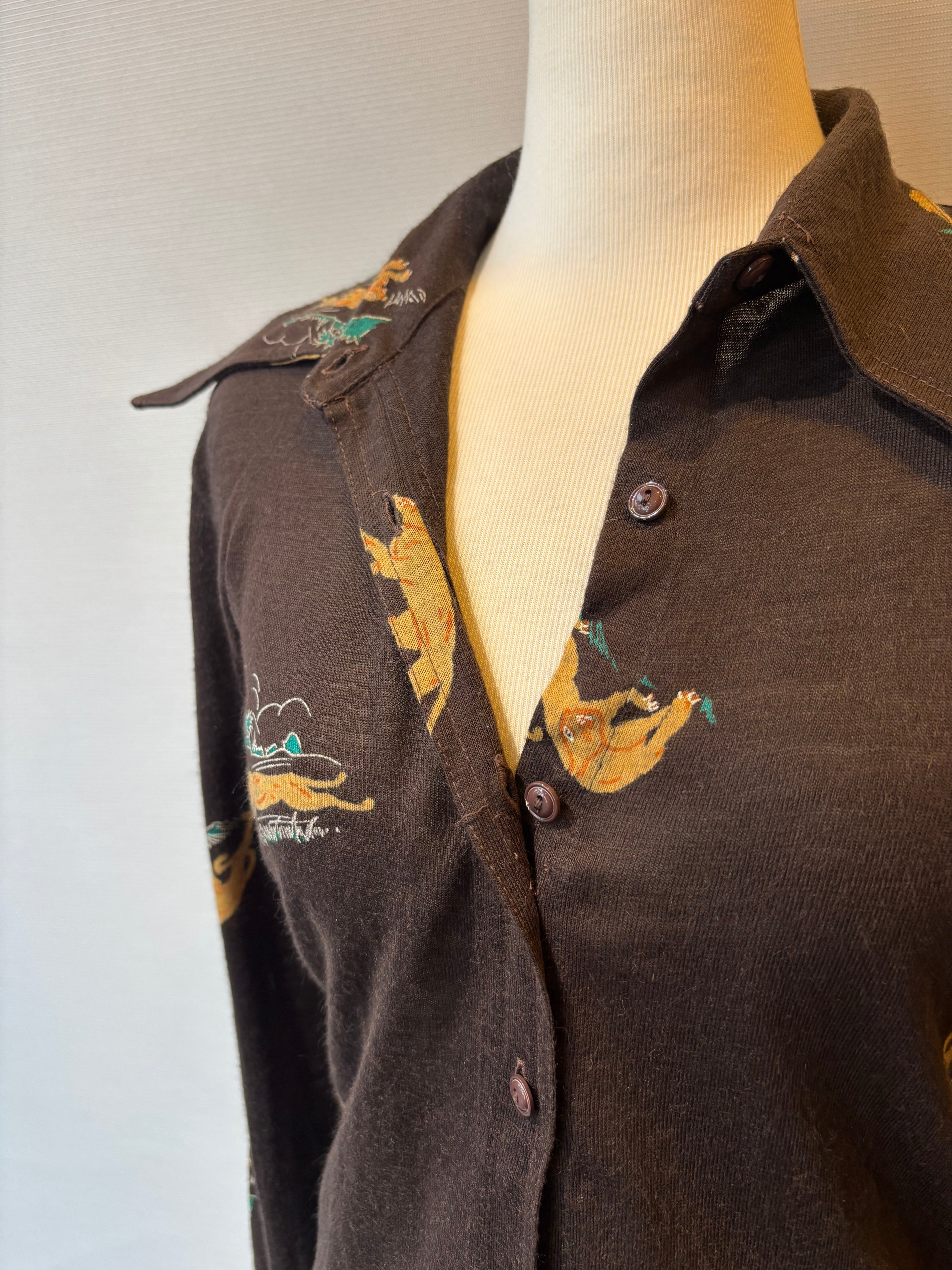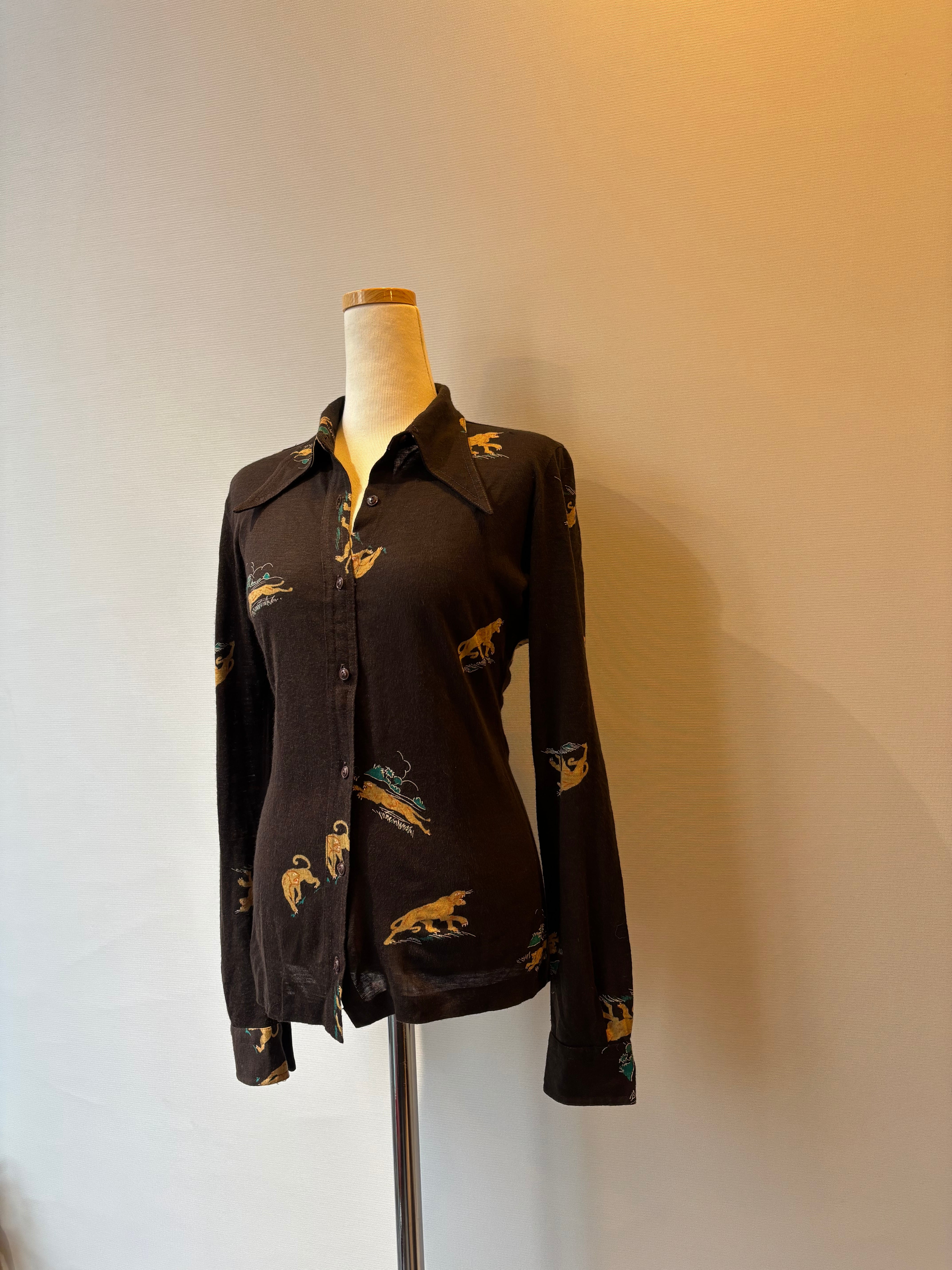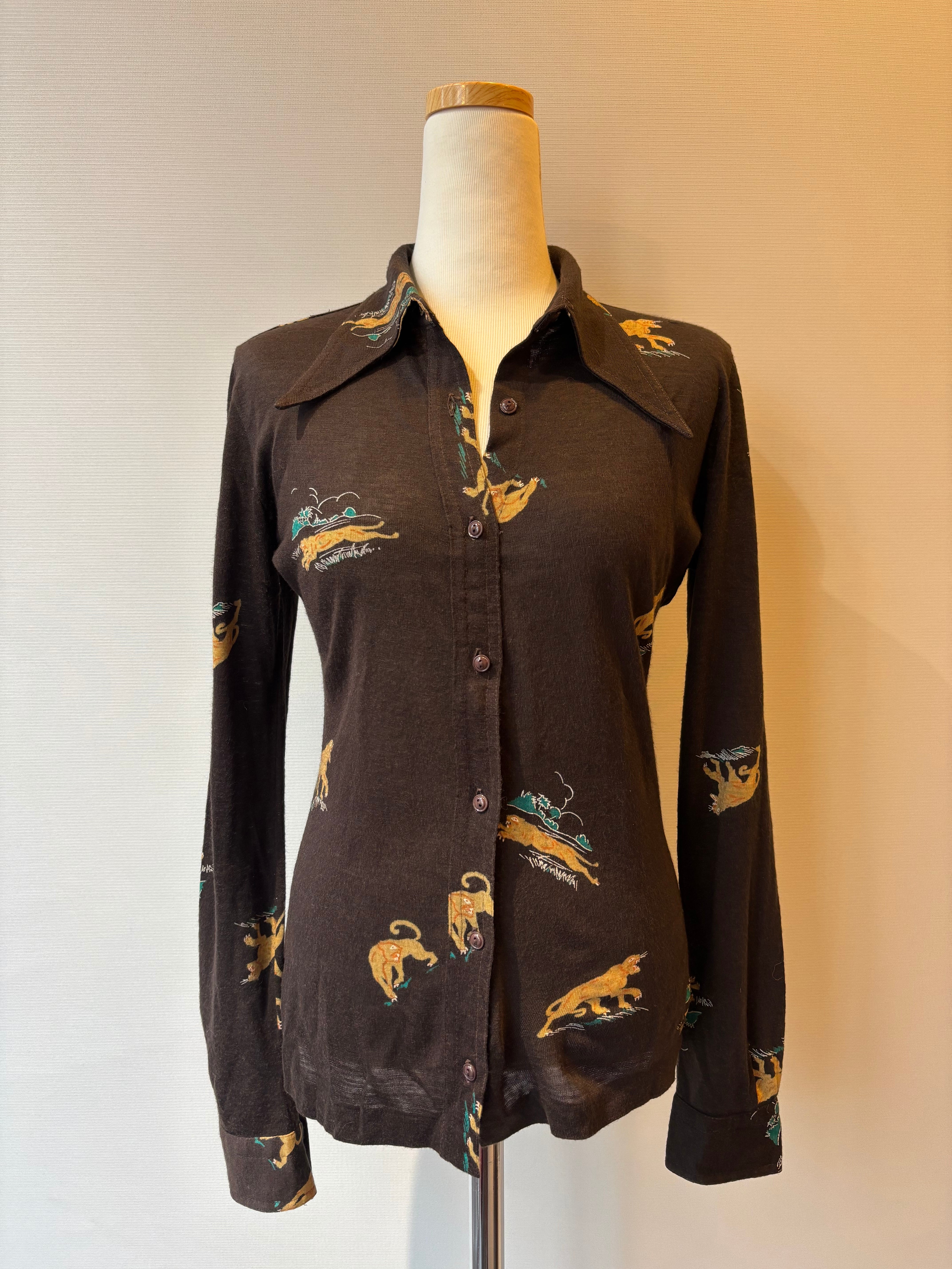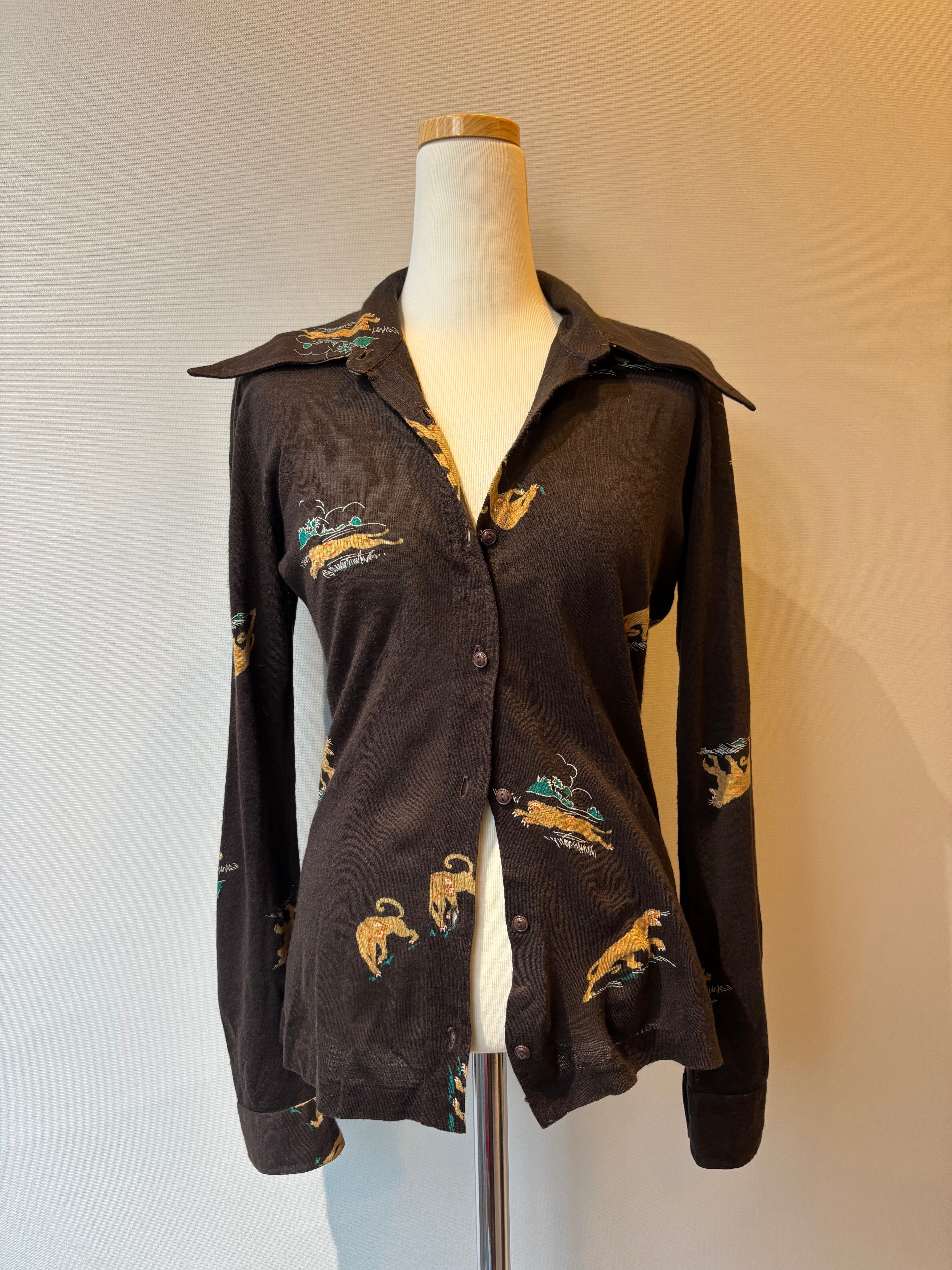 華奢な方におすすめの、ロングポイントカラーが印象的なブラウンシャツ。
