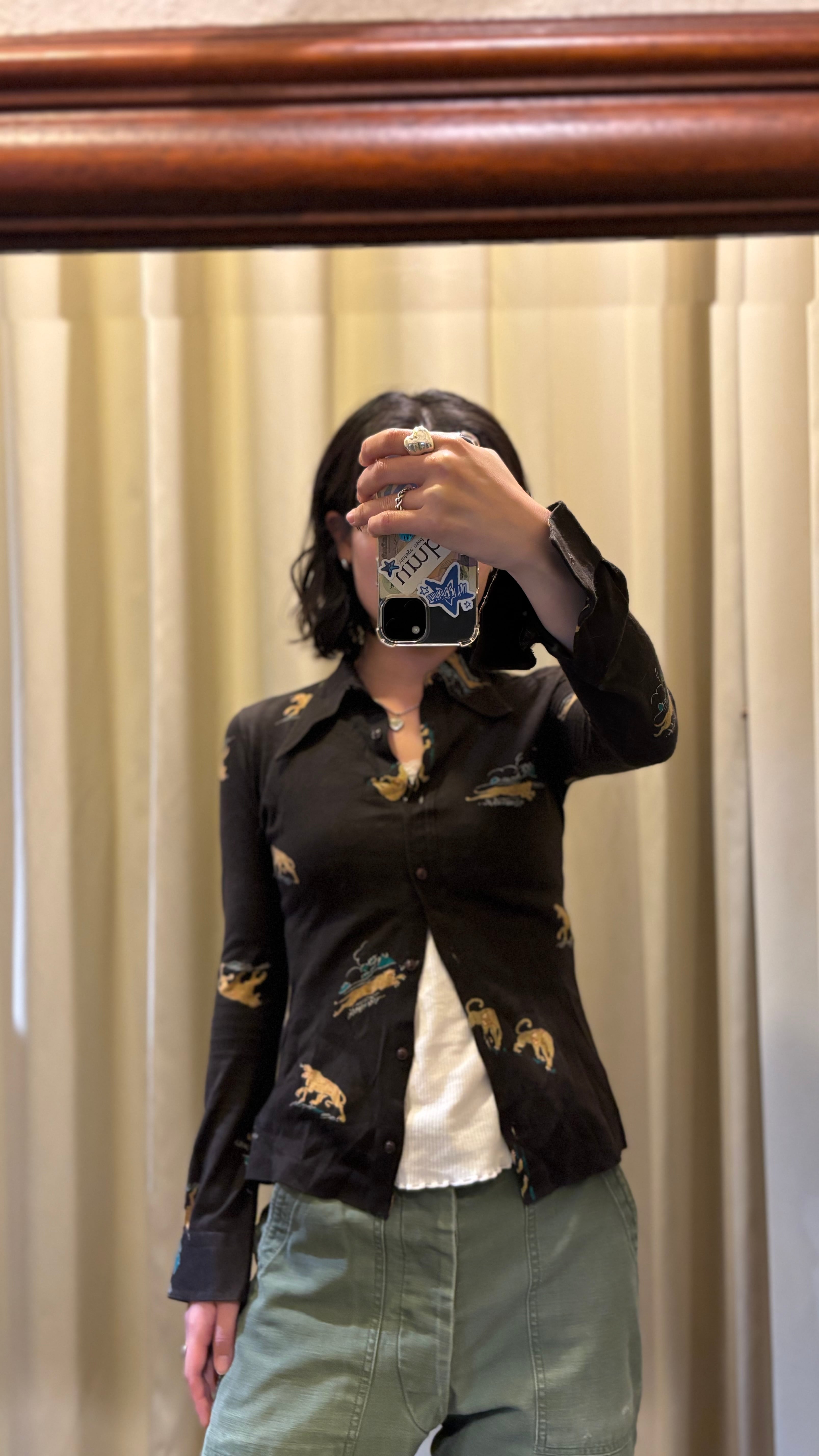 ヒョウ柄プリントがアクセントになり、一枚ではもちろんインナーとしても活躍します。
