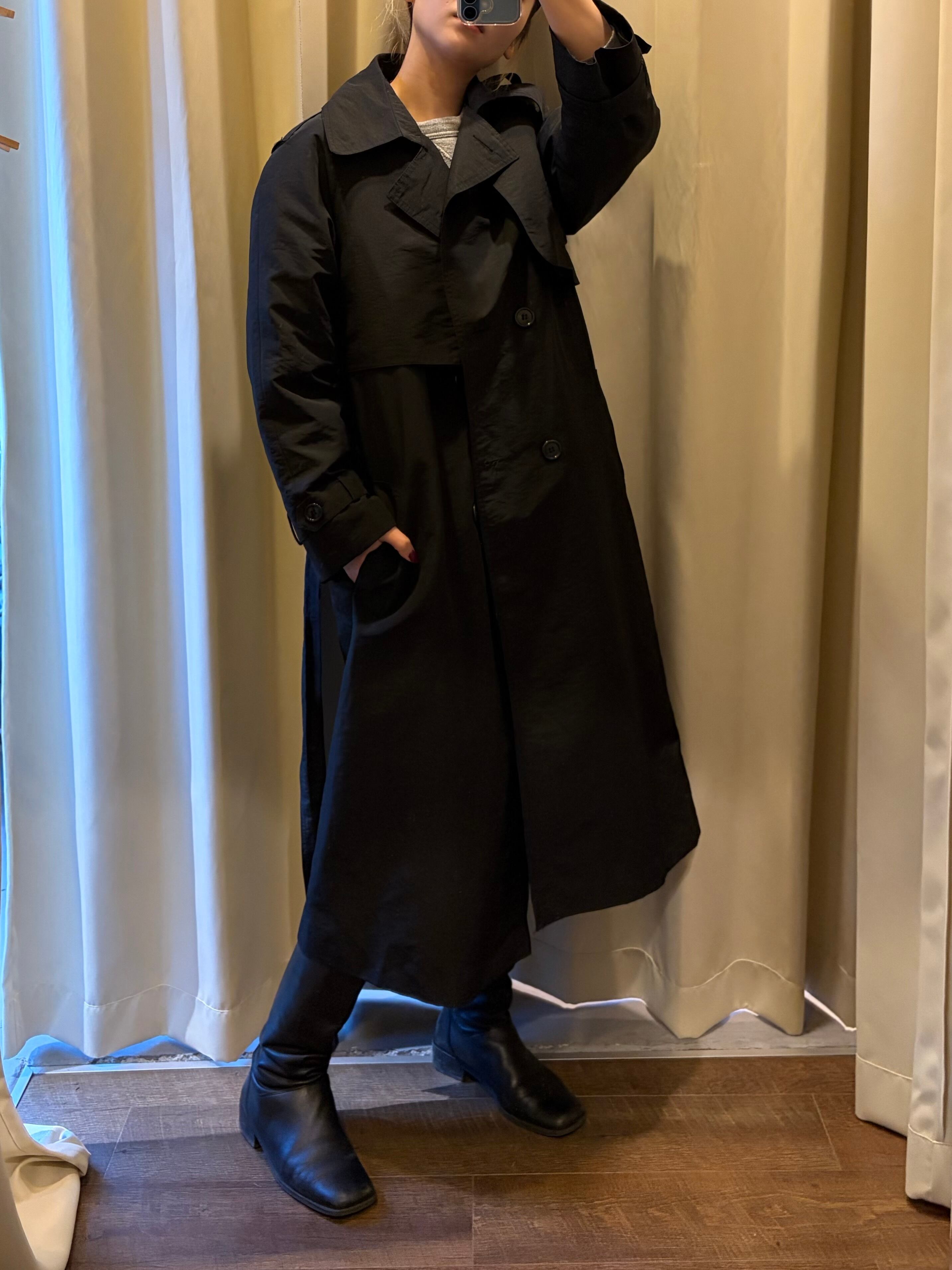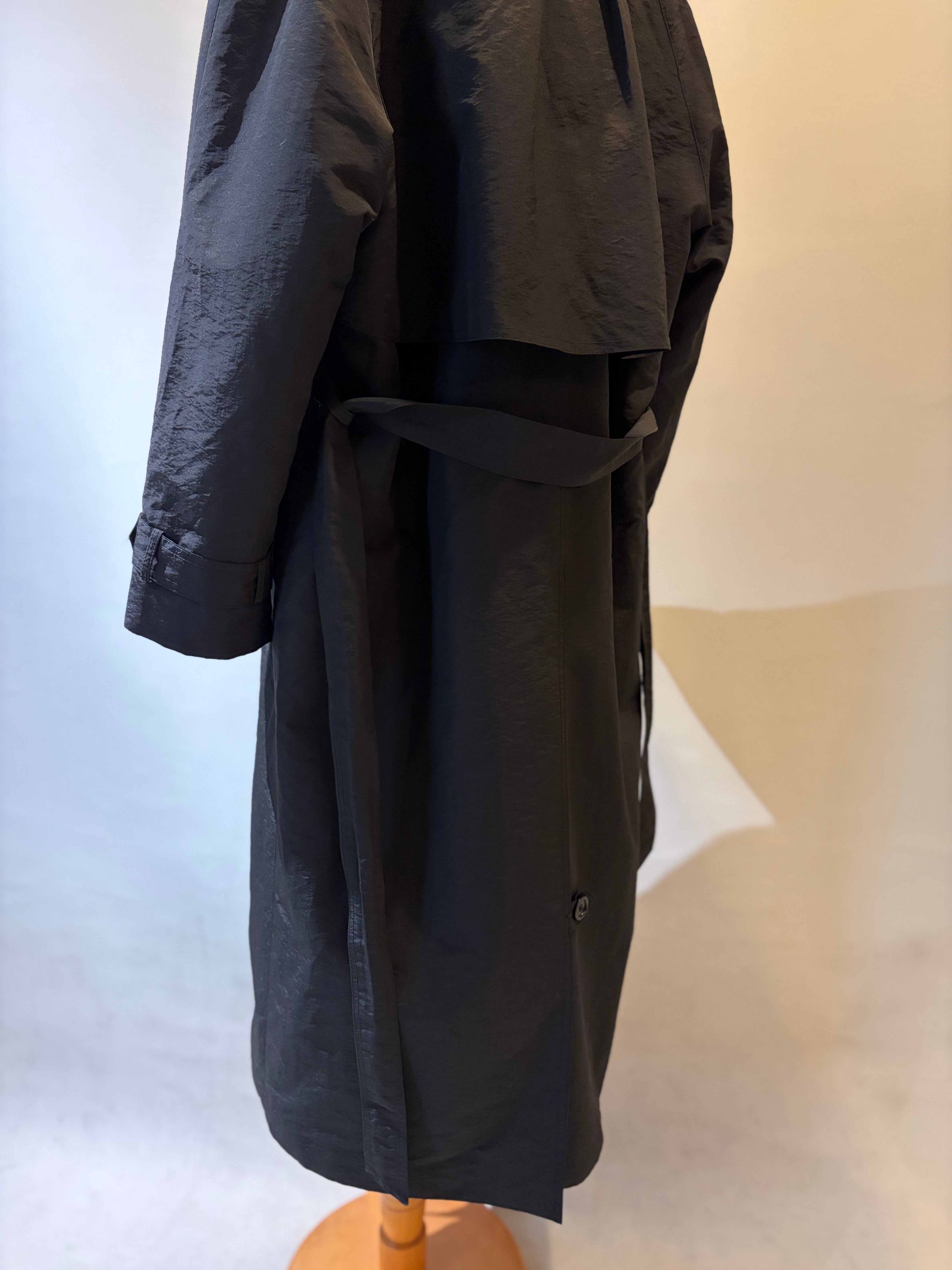 撥水加工がされた、光沢あるトレンチコート。