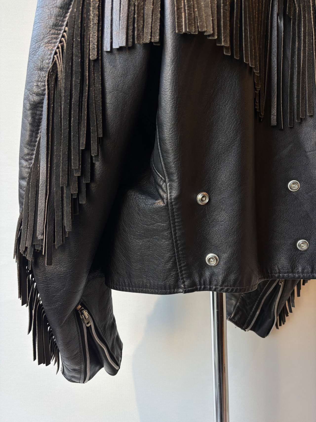 動くたびに揺れるフリンジと、大ぶりのコンチョスタッズが存在感を放ち、スタイリングのアクセントになります。