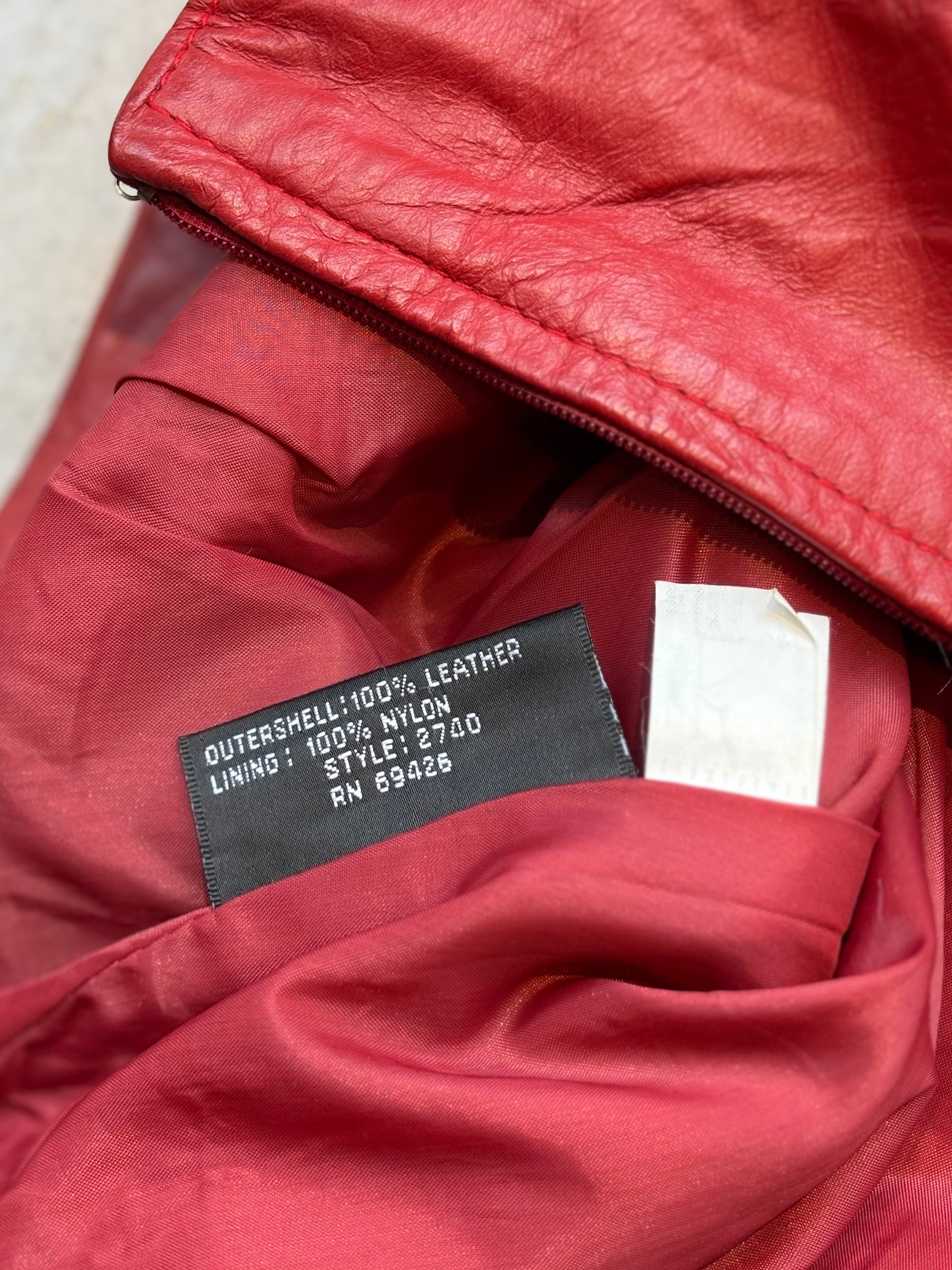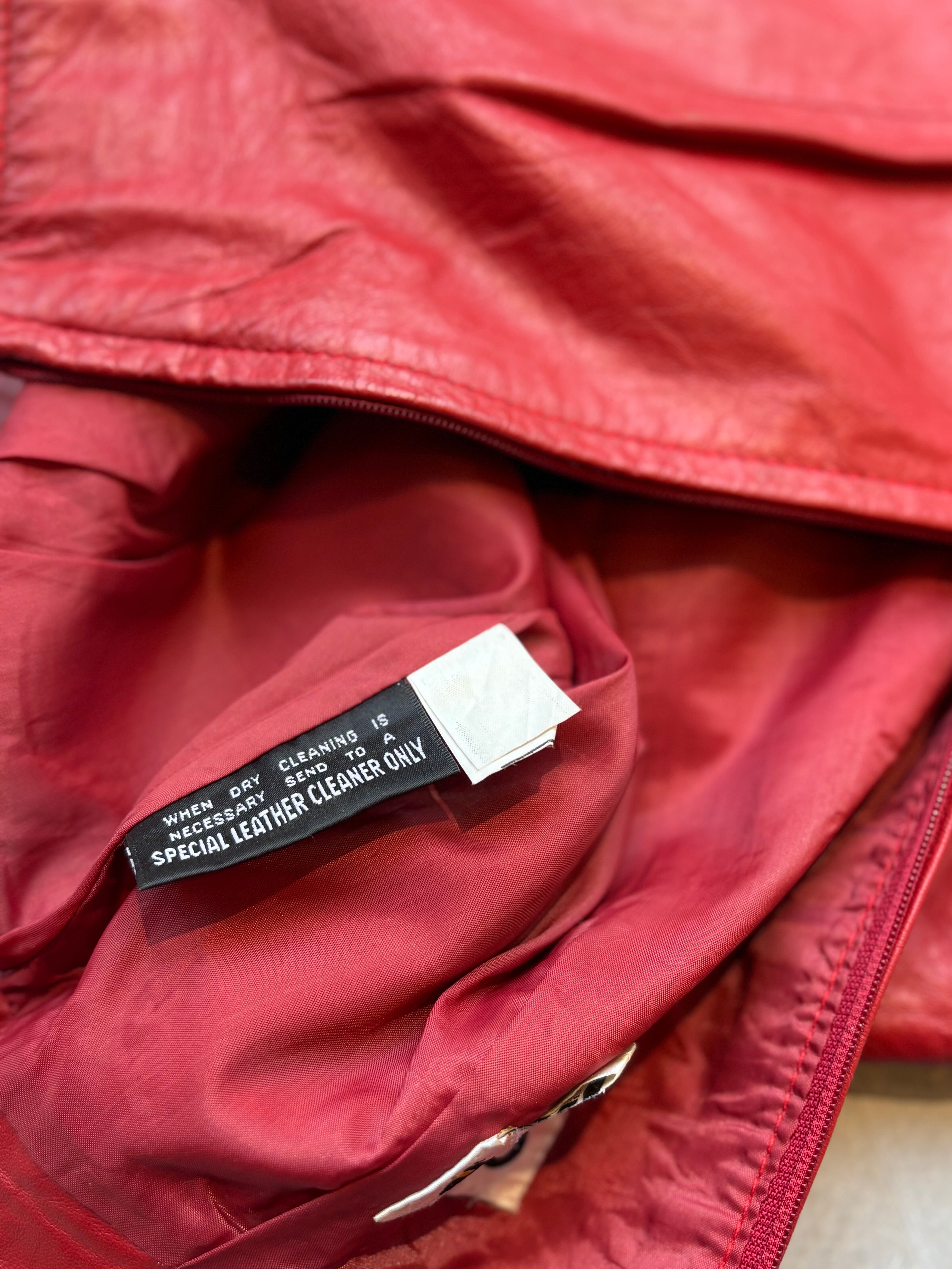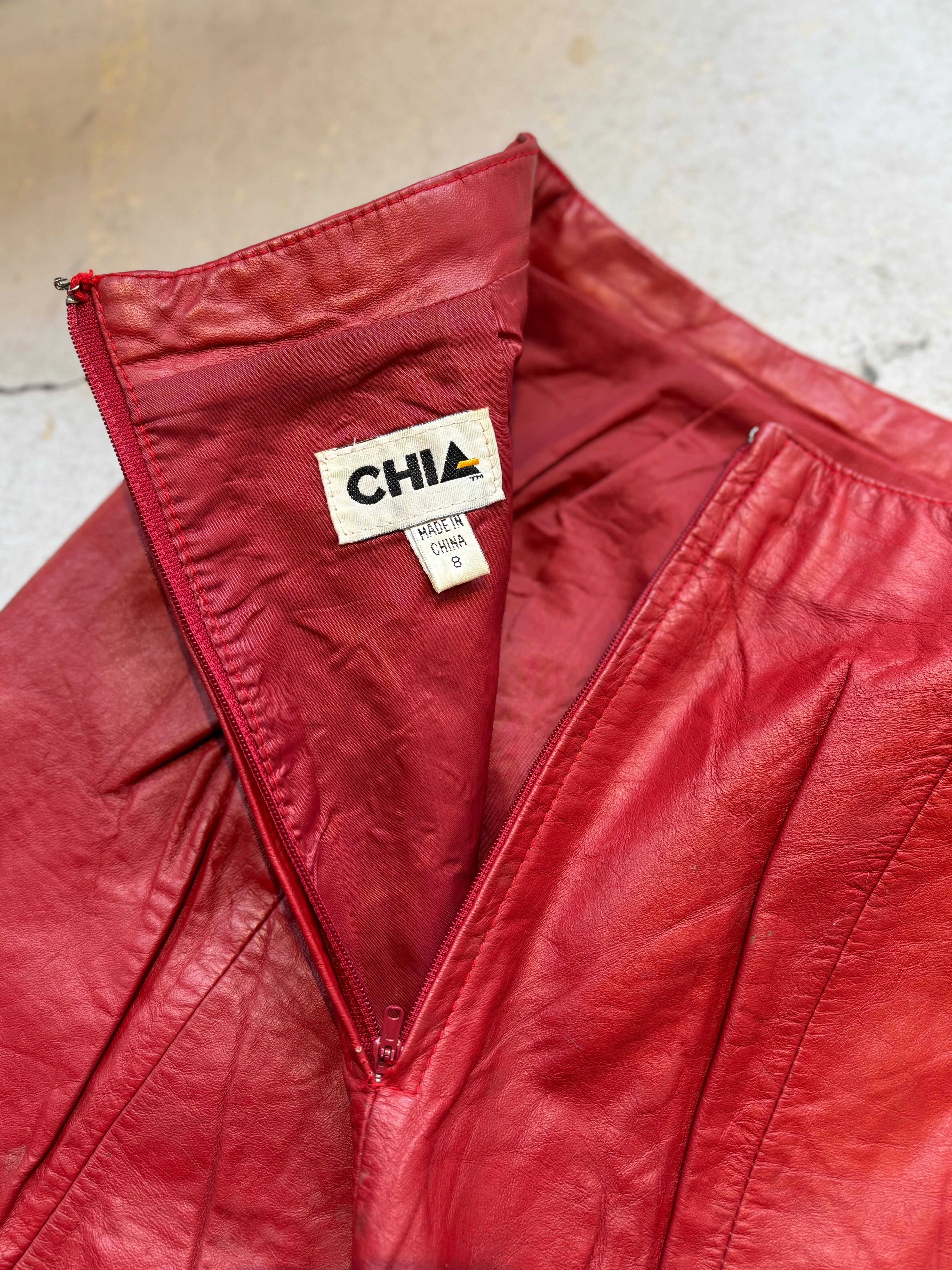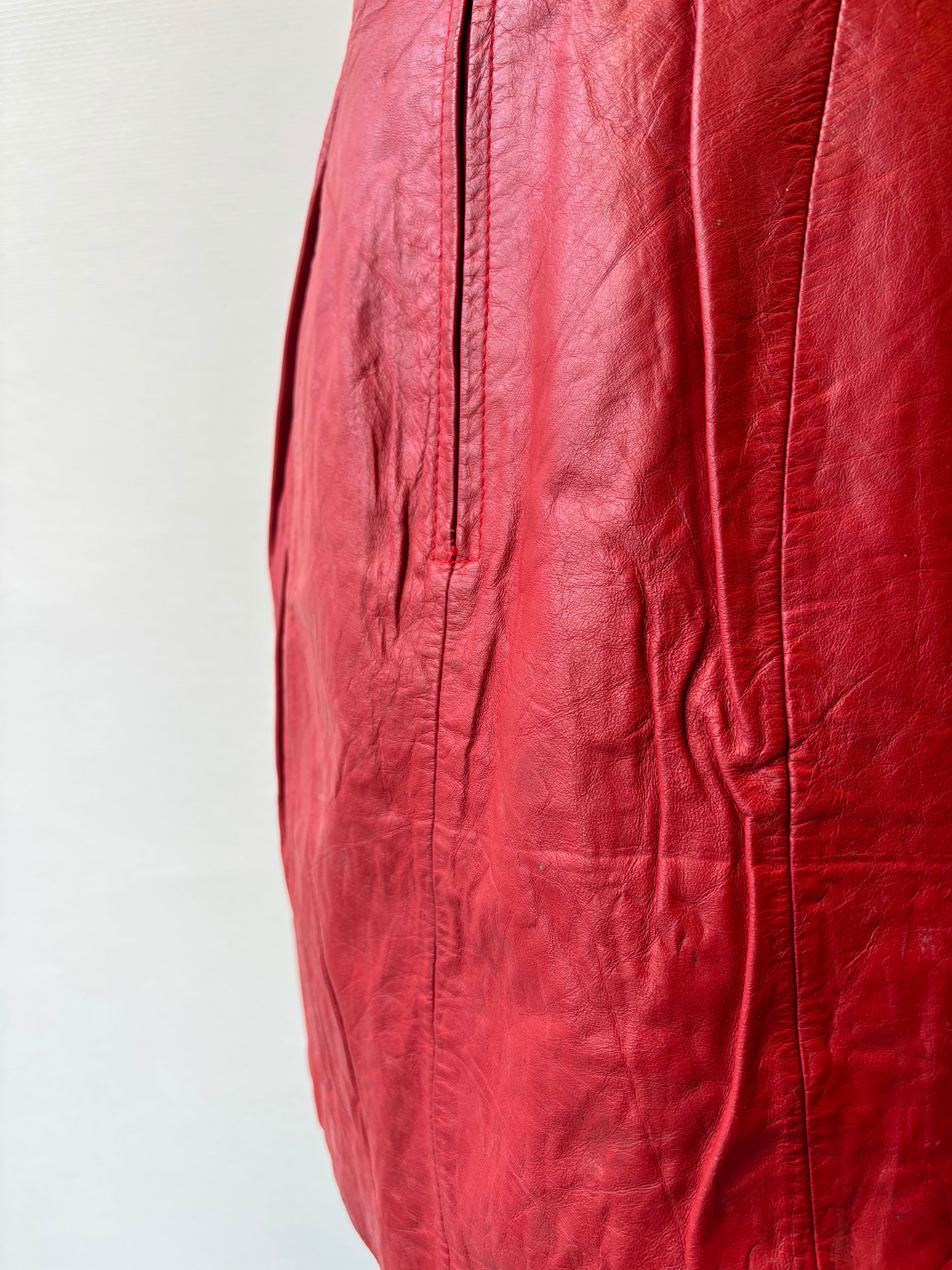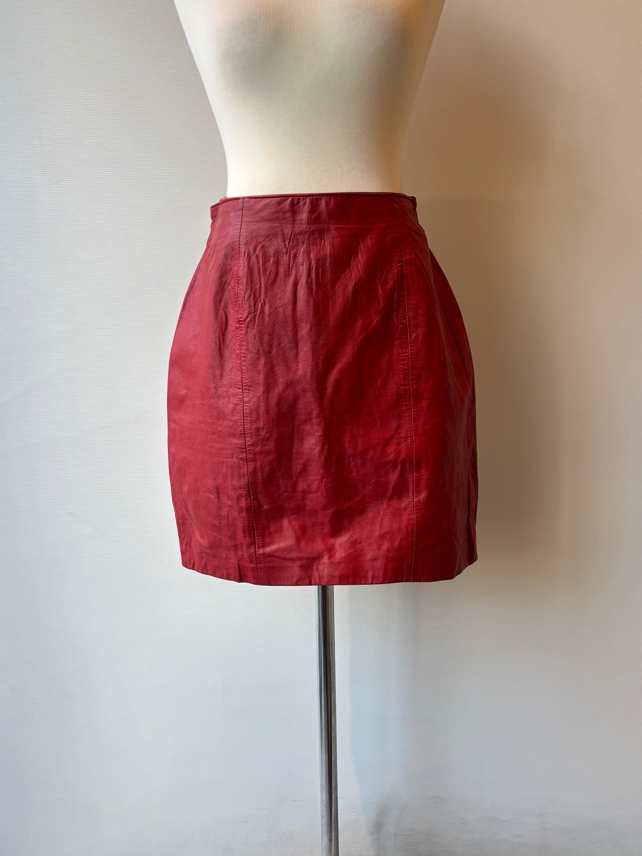 鮮やかなレッドカラーが目を引く、レザーのミニスカート。
