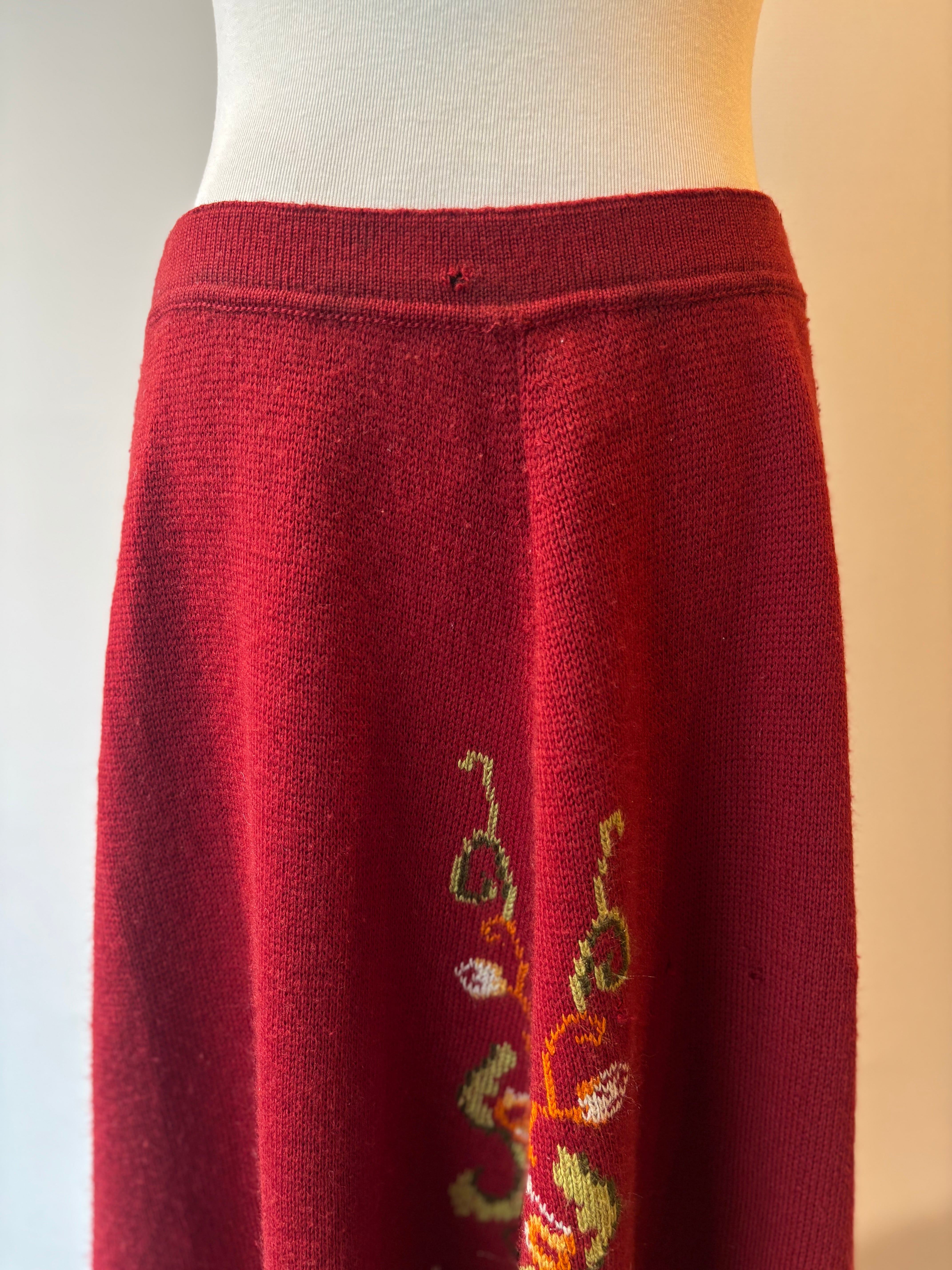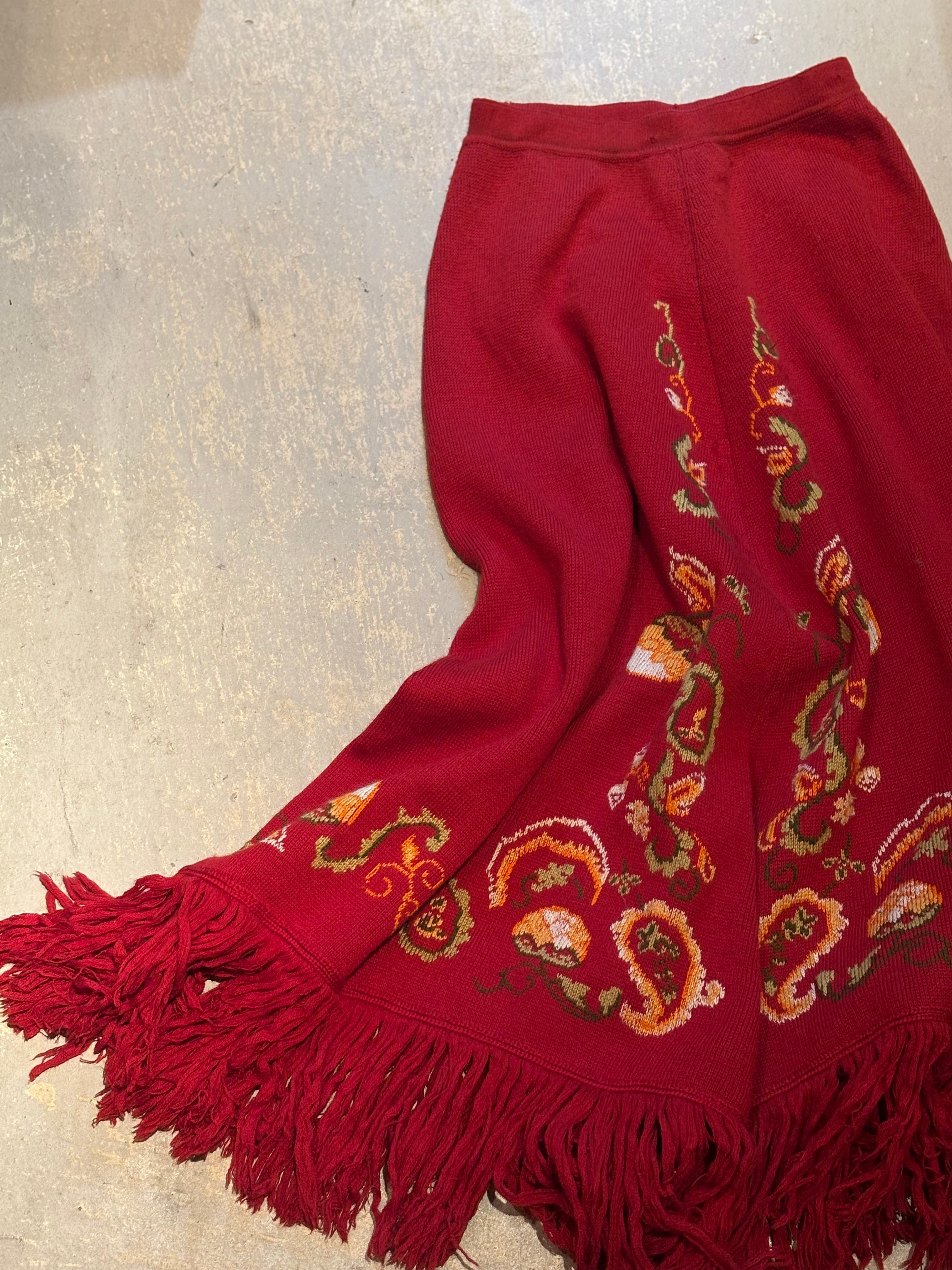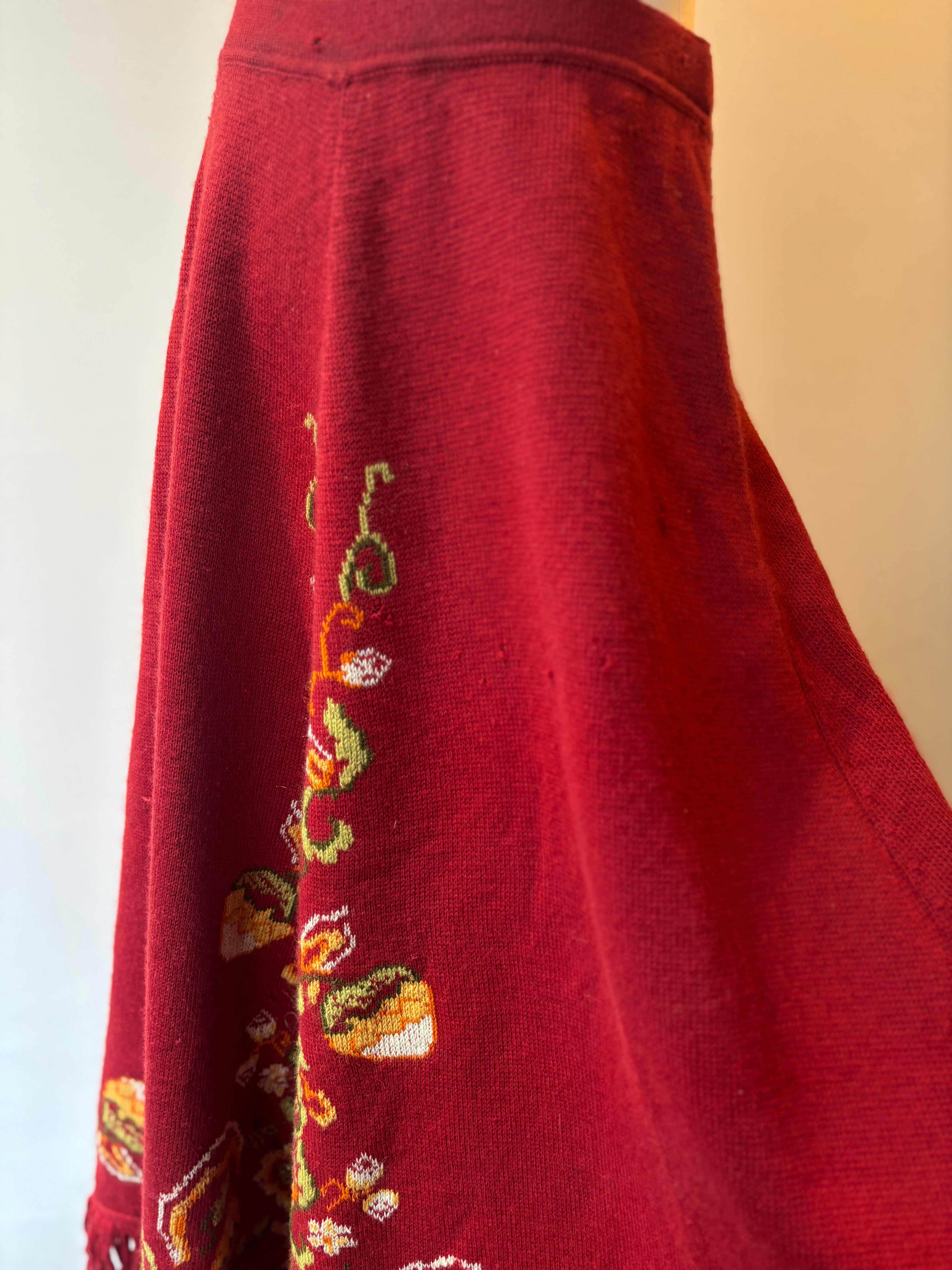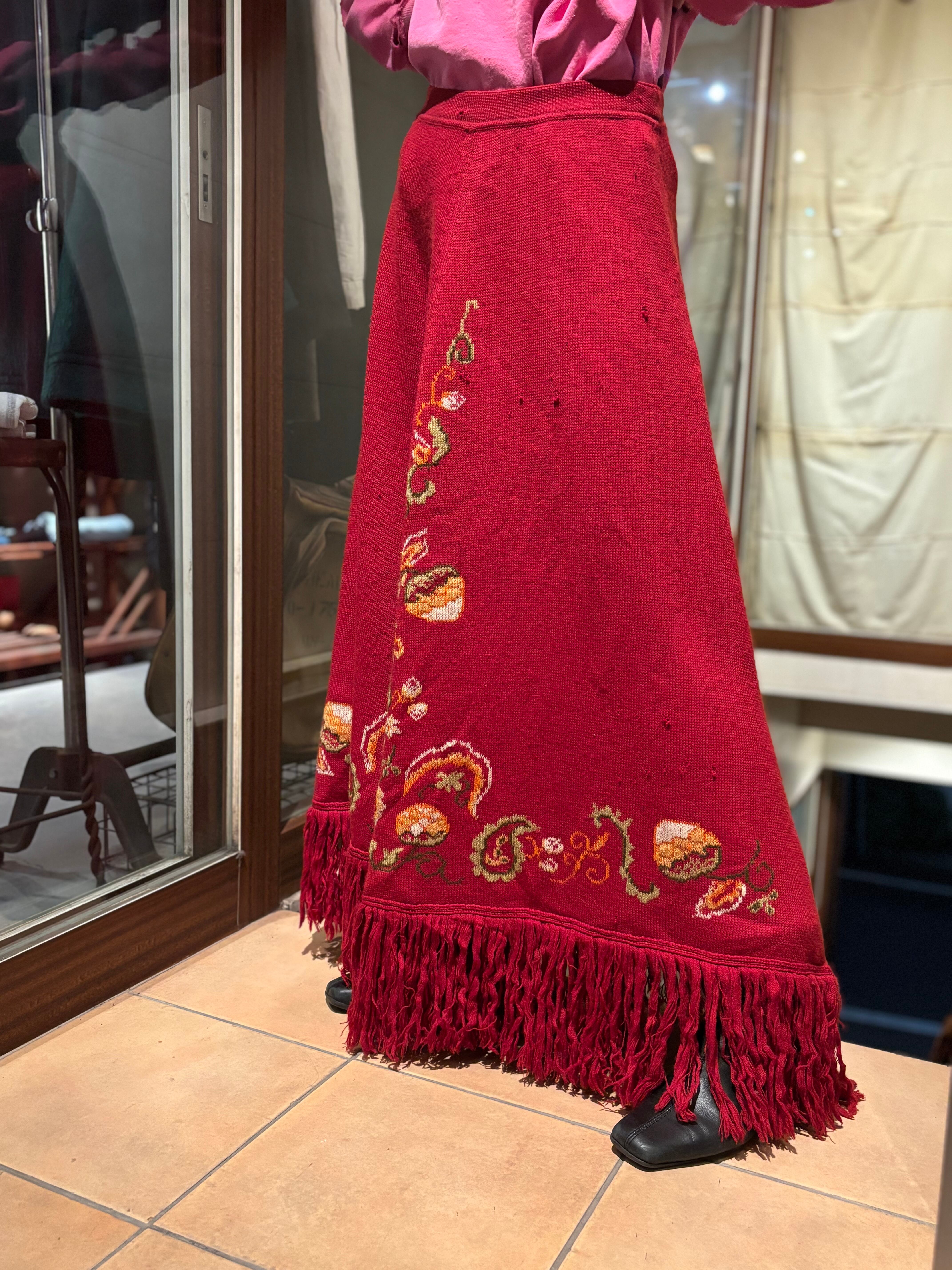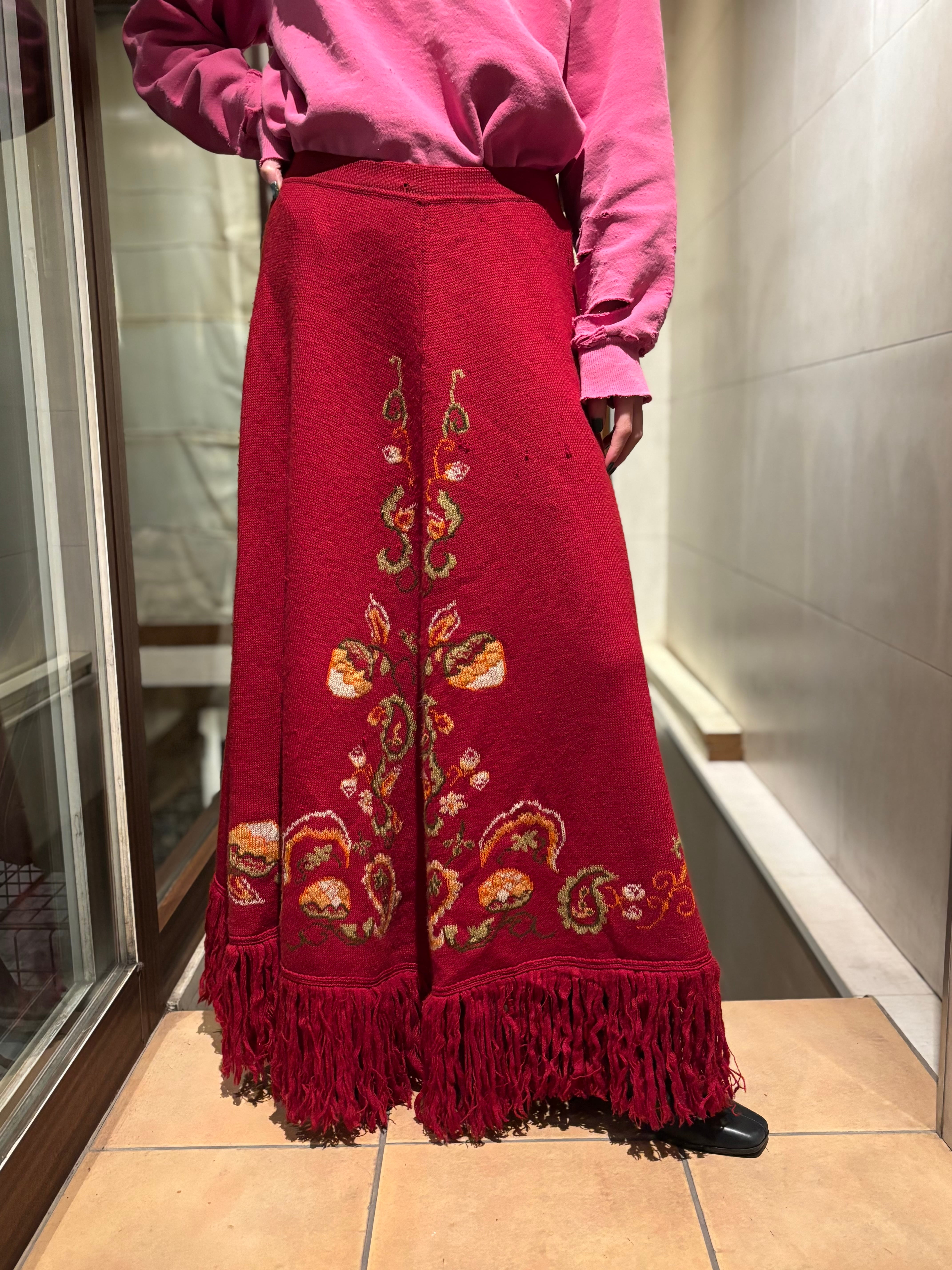 タペストリー柄が存在感のある、Aラインのニットスカート。