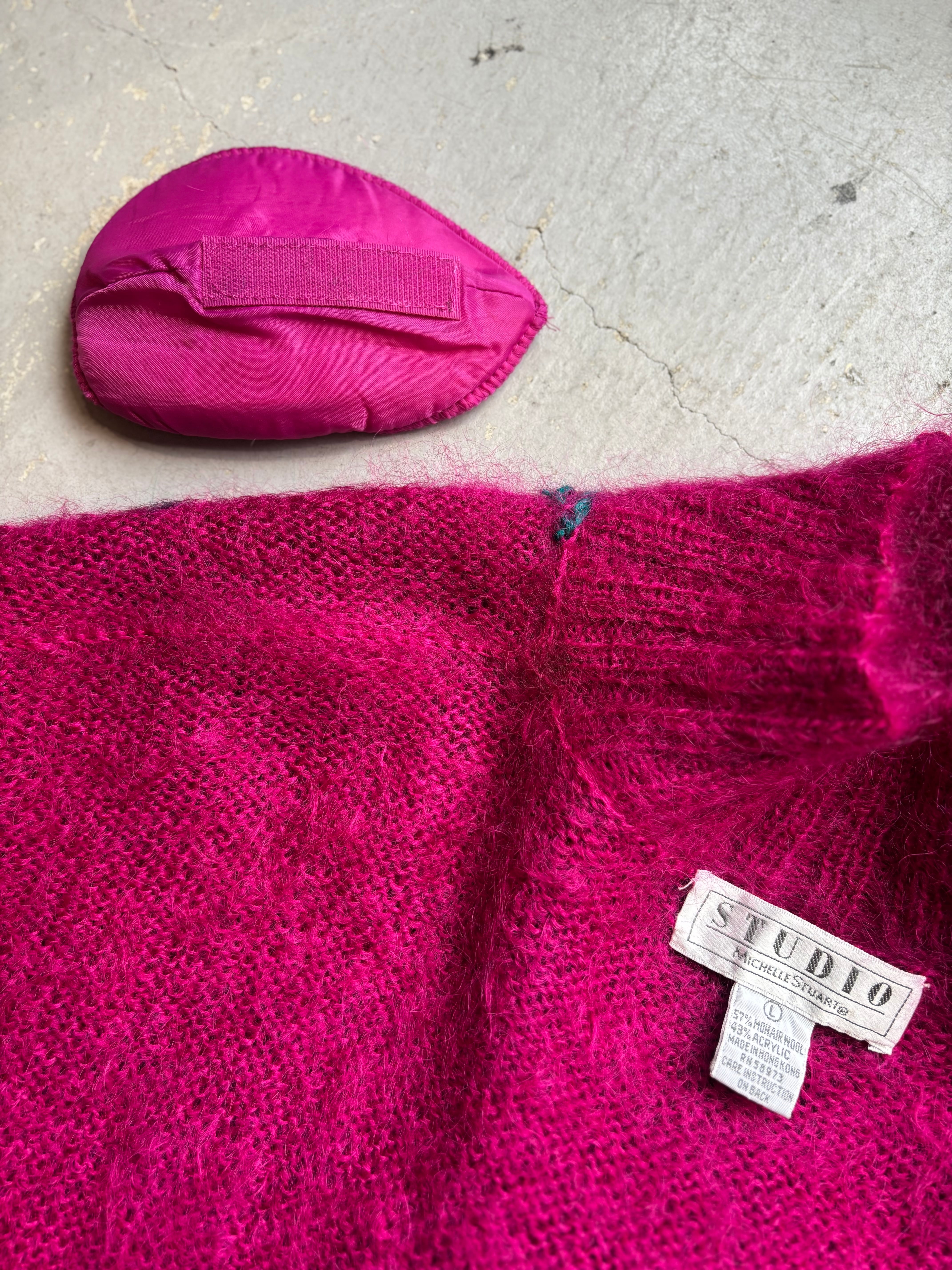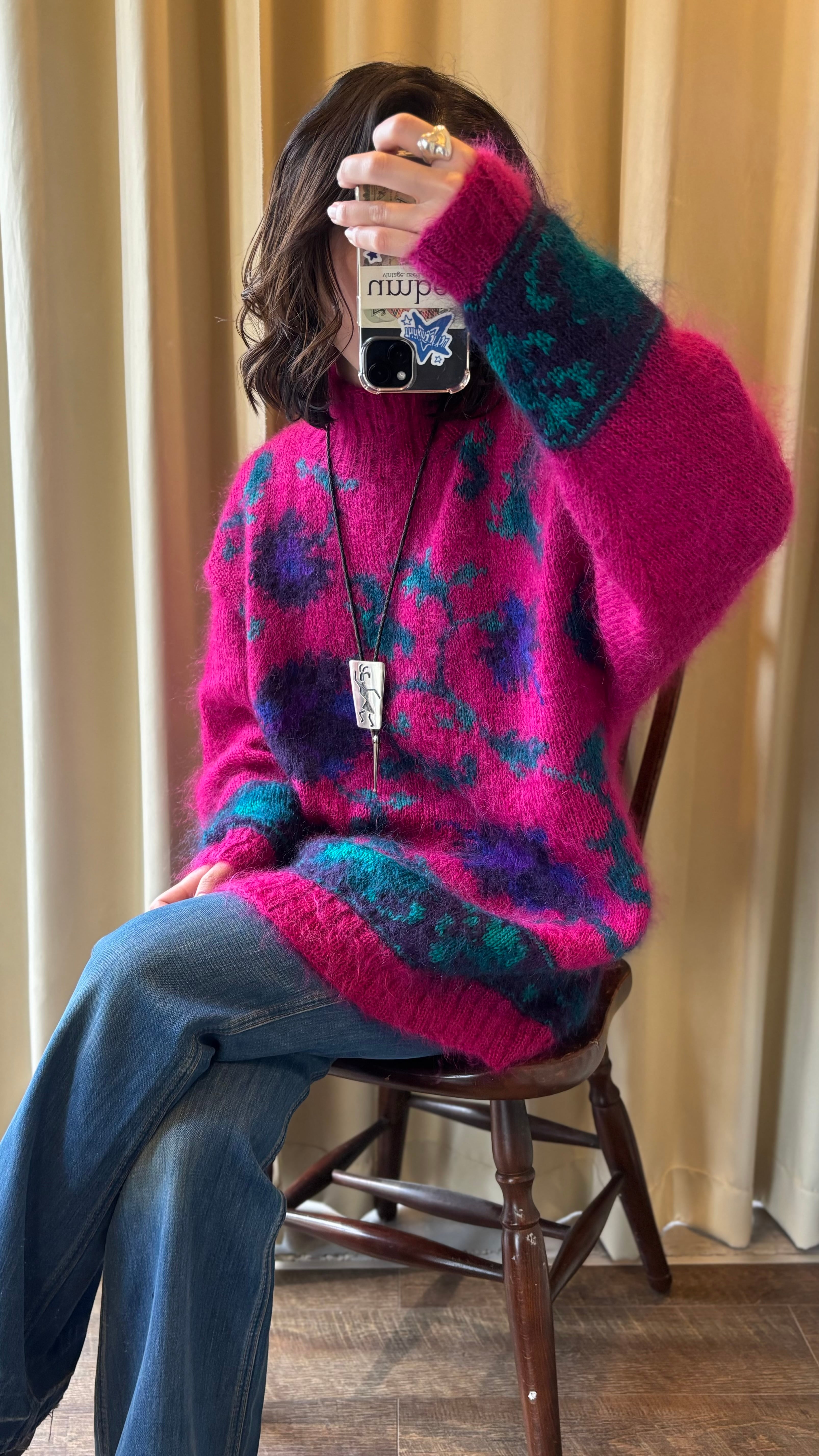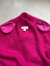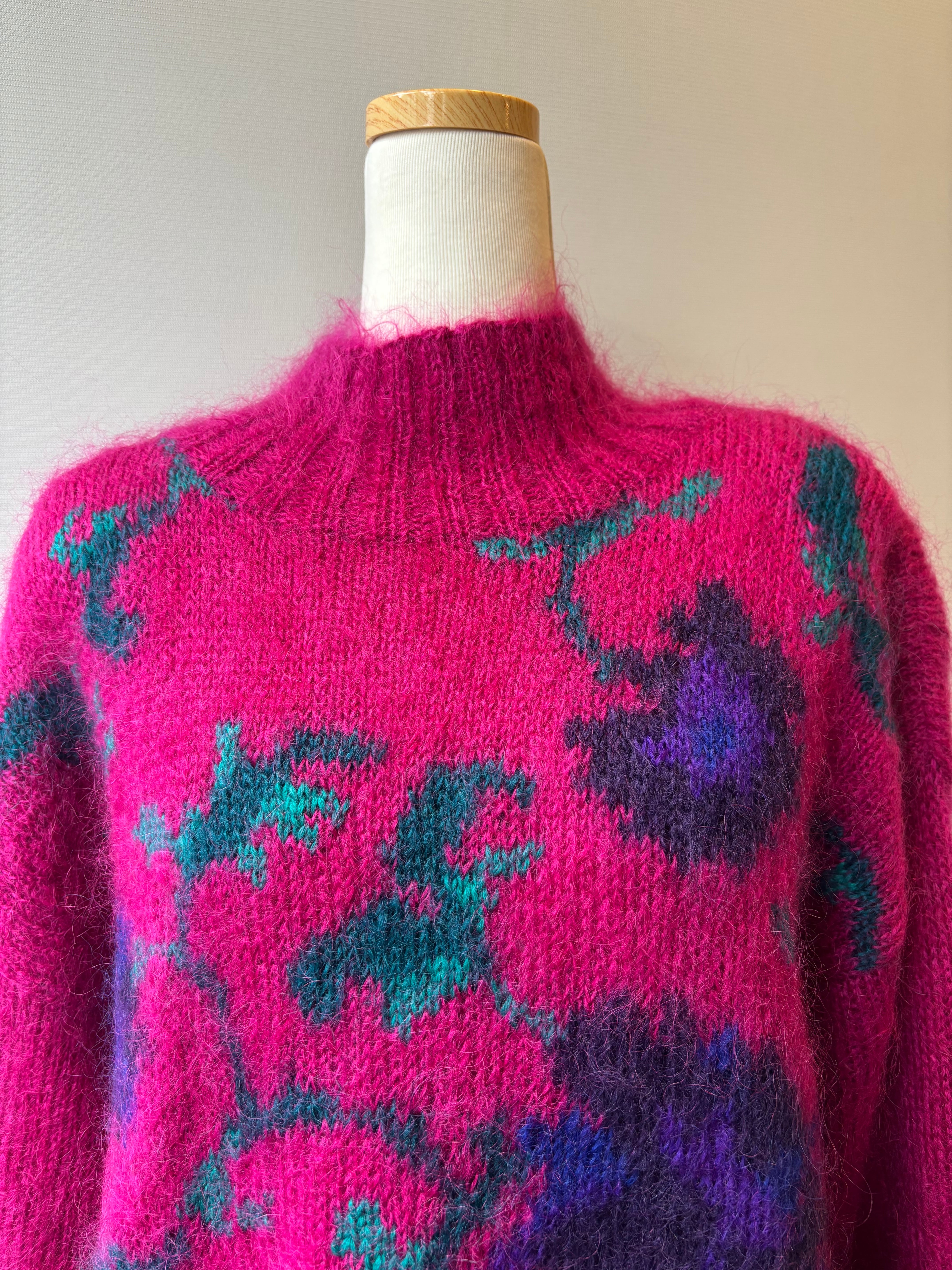 ビビッドピンクをベースに、パープルとブルーのフラワー柄が映えるニット。