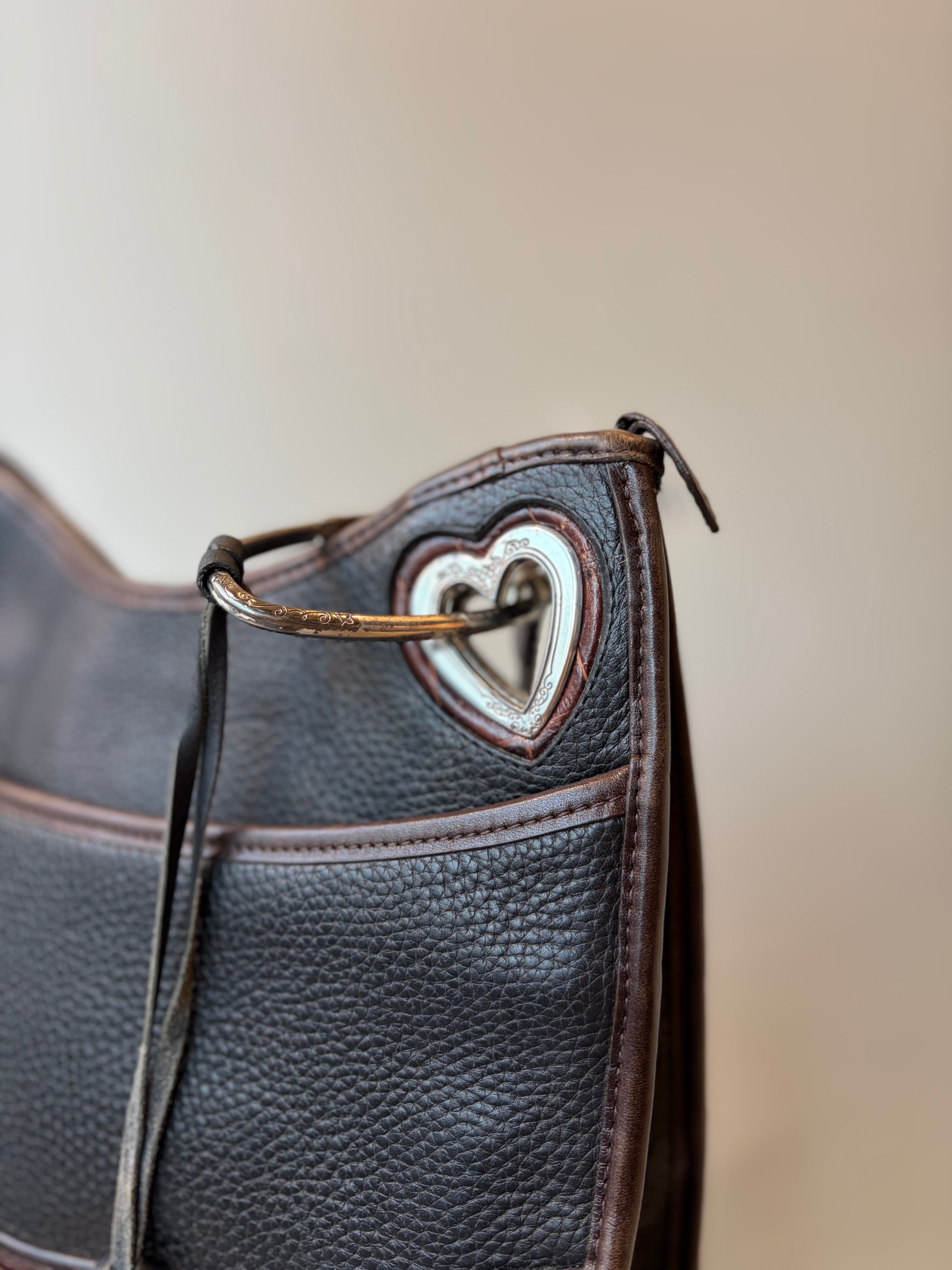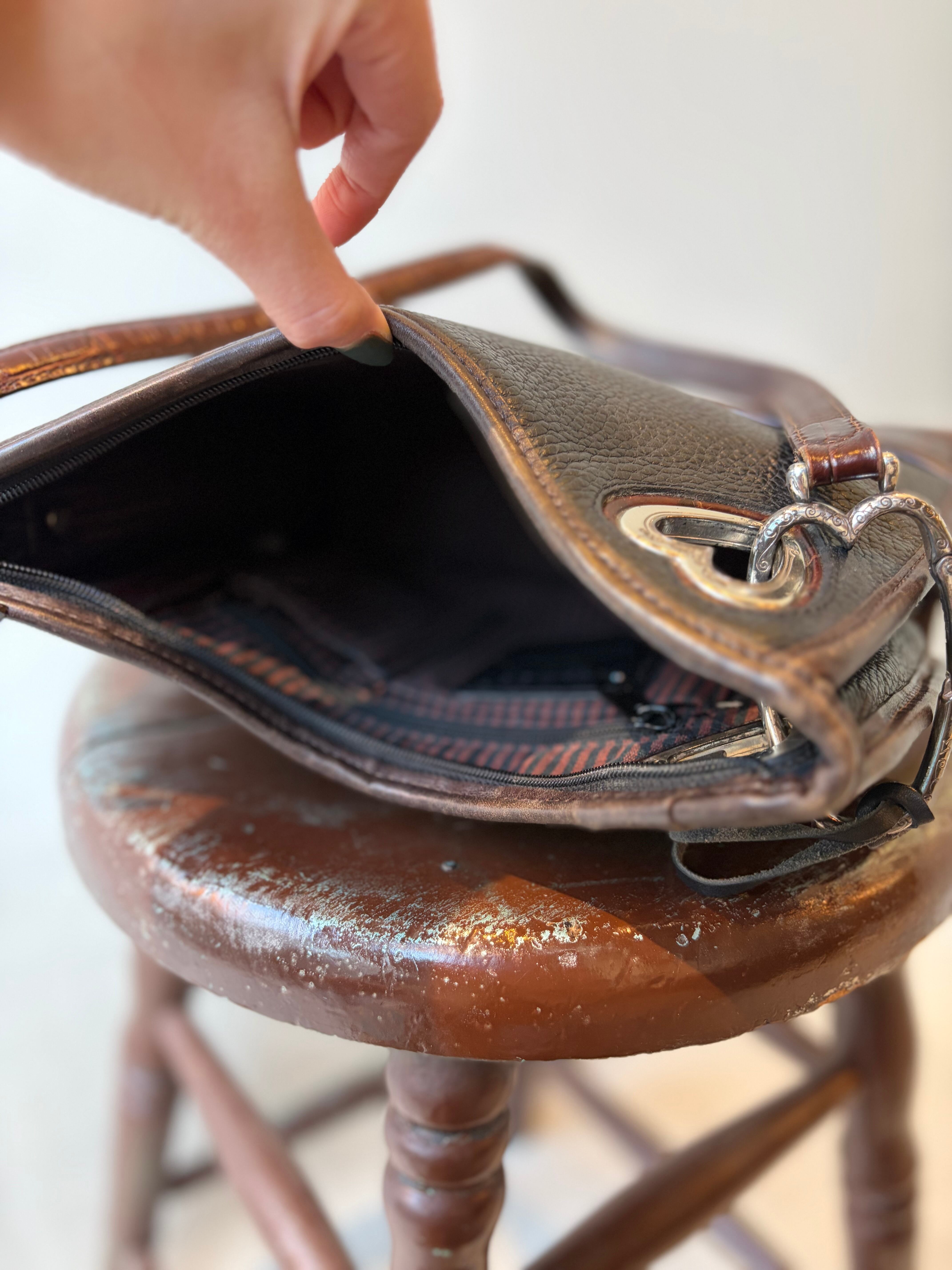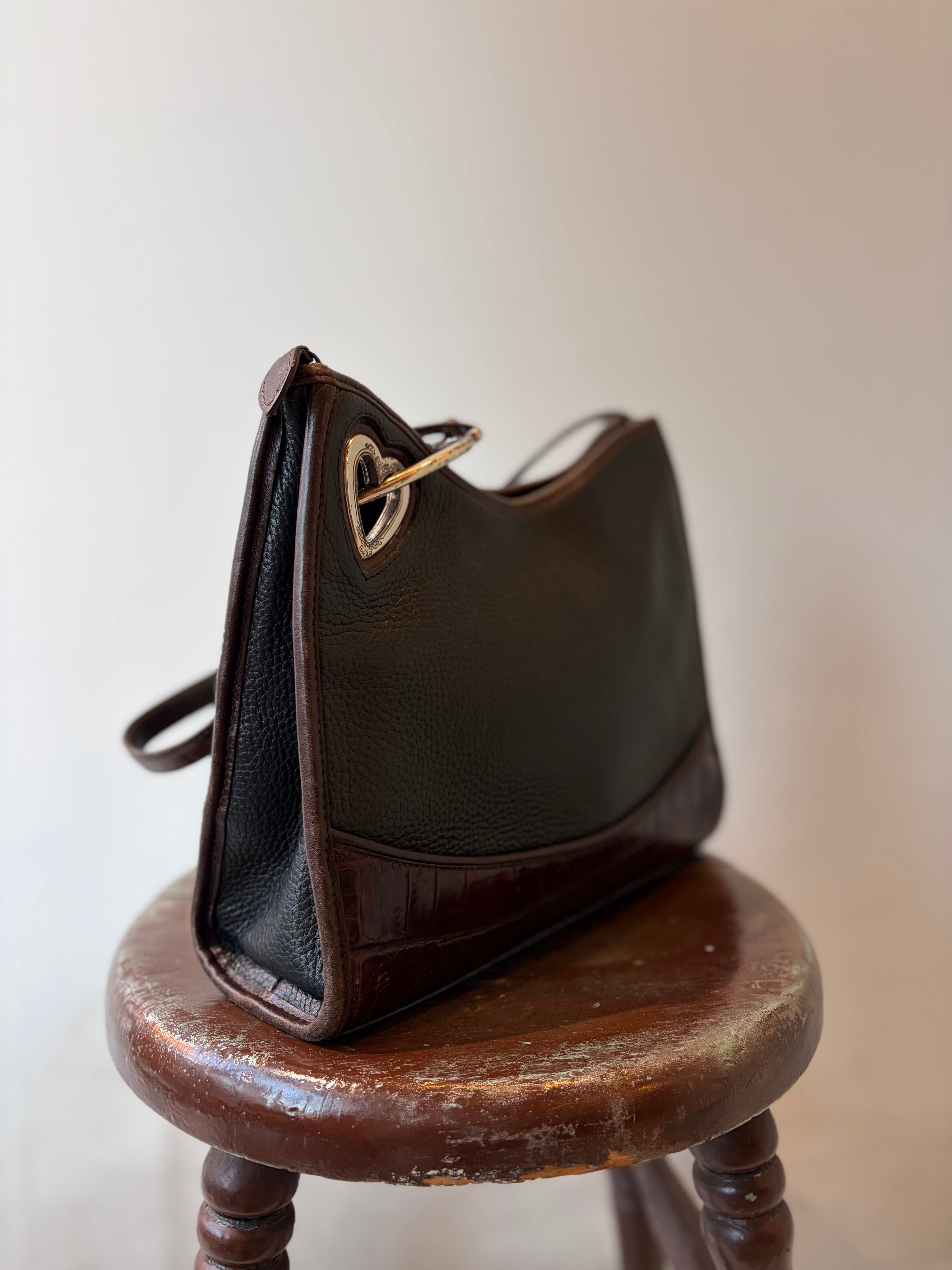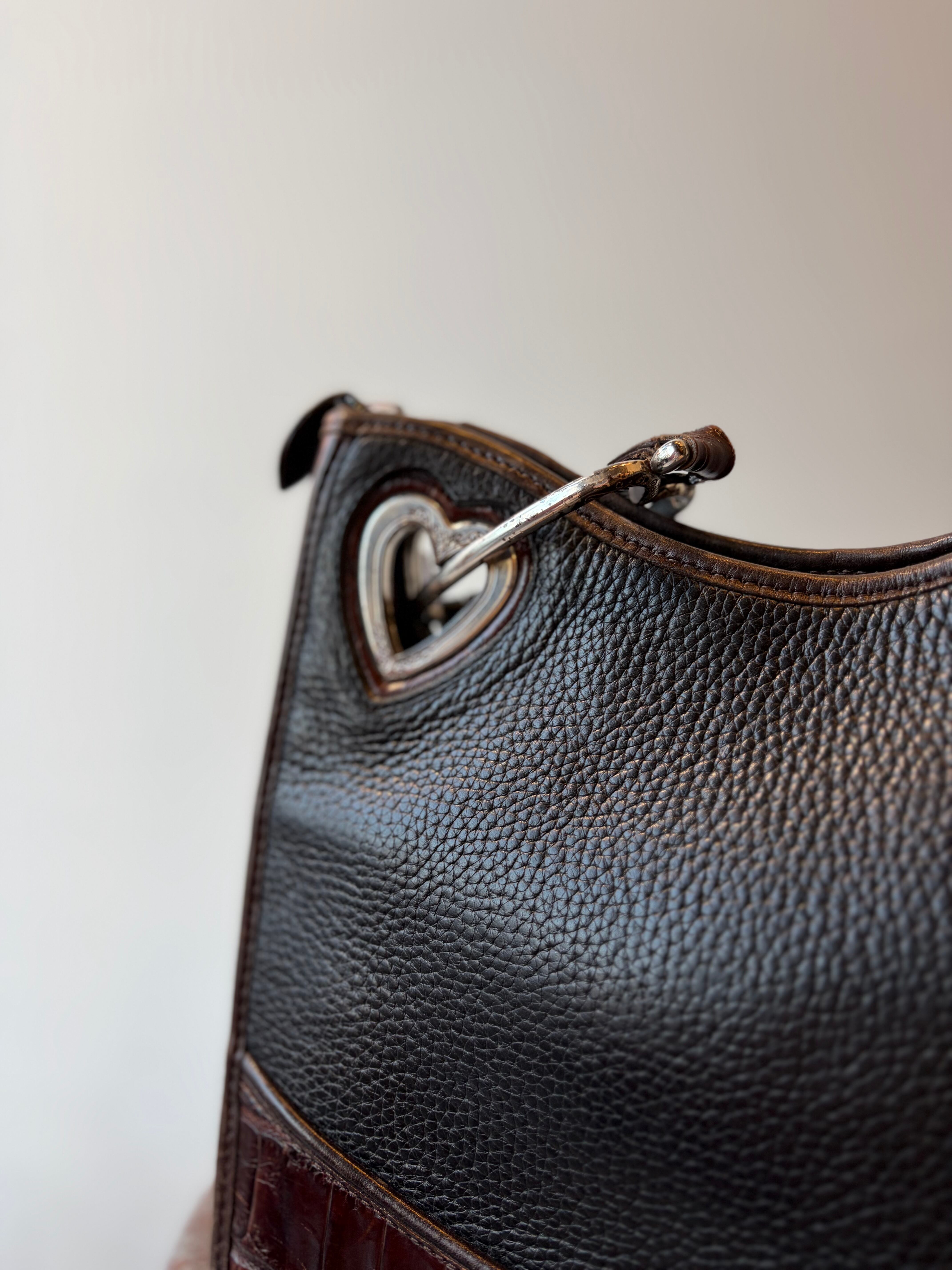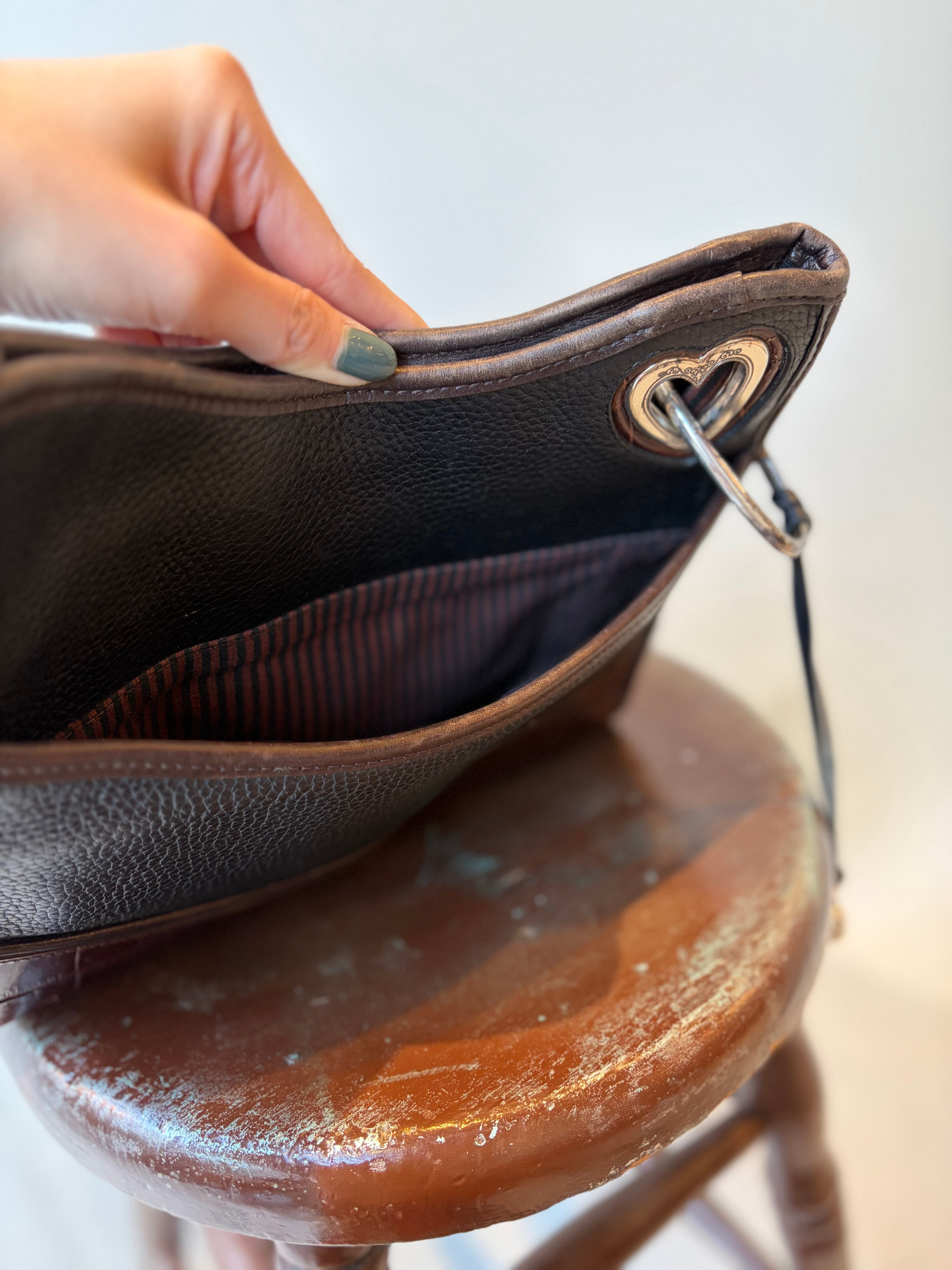 ハート型が3箇所に付いた愛らしいレザーバッグ。