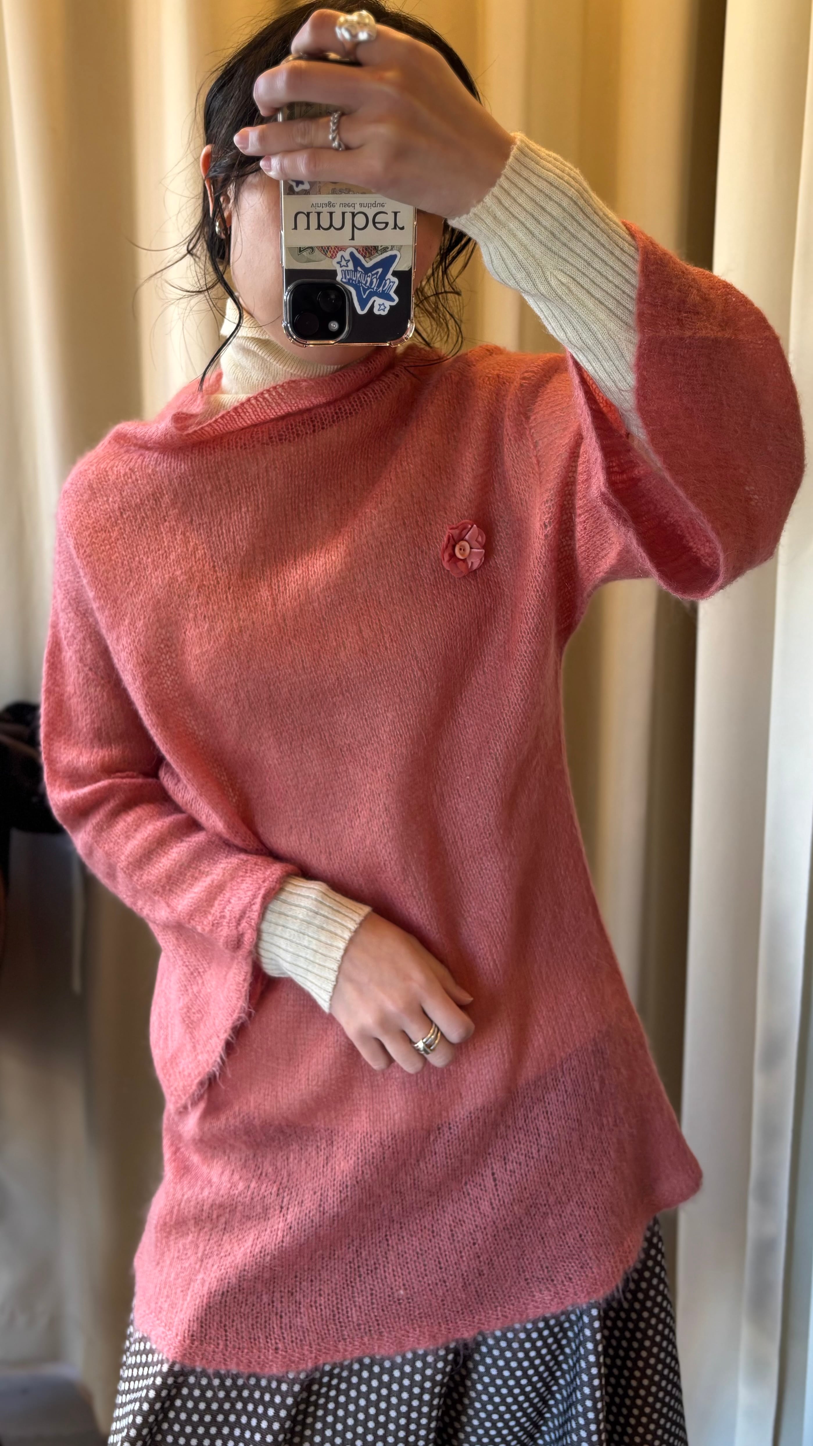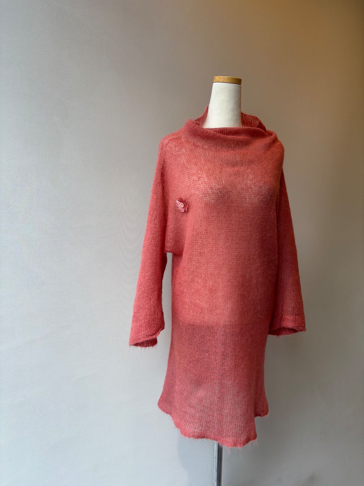 春らしいパールピンクが目を引くニットチュニック。