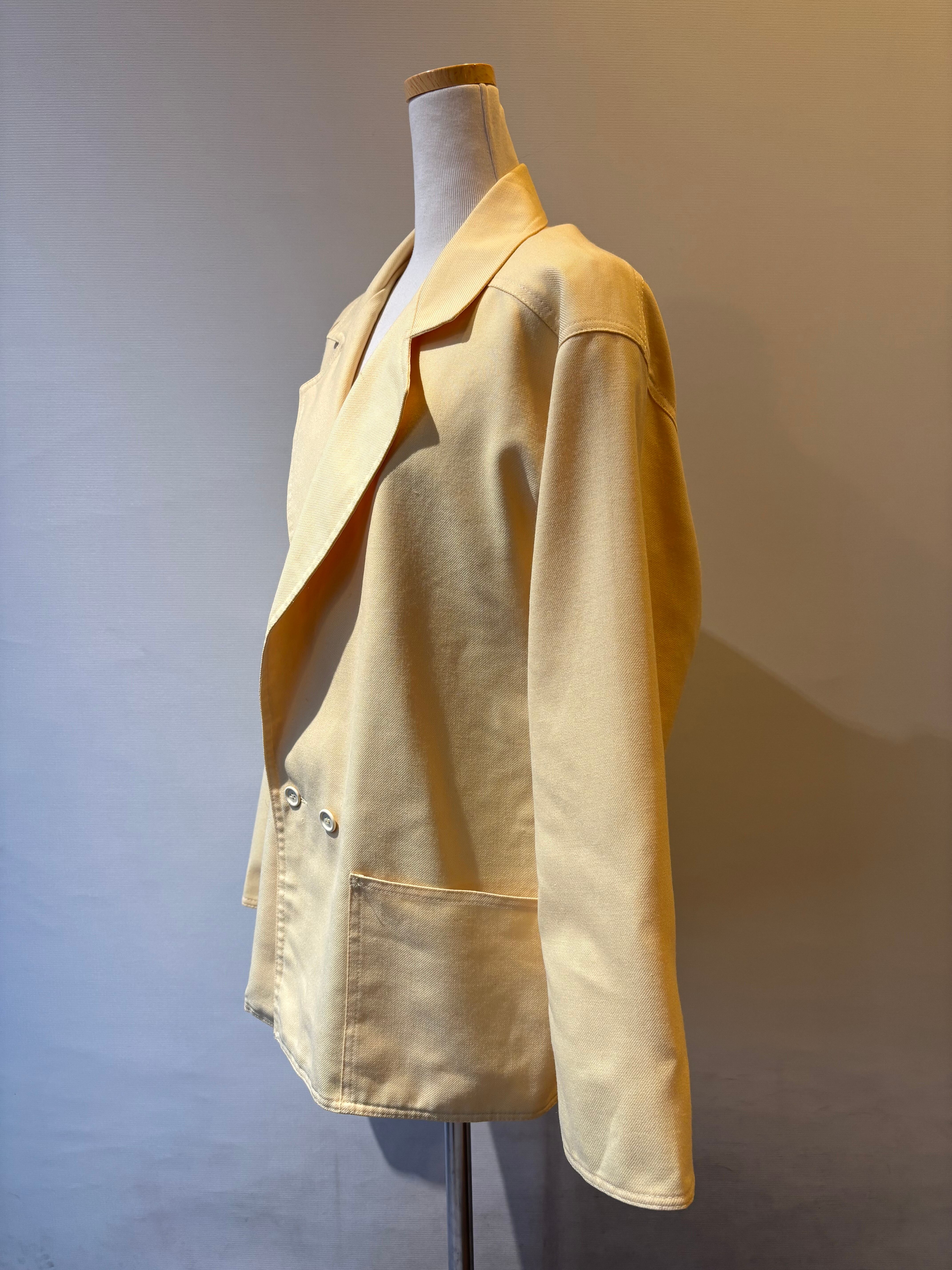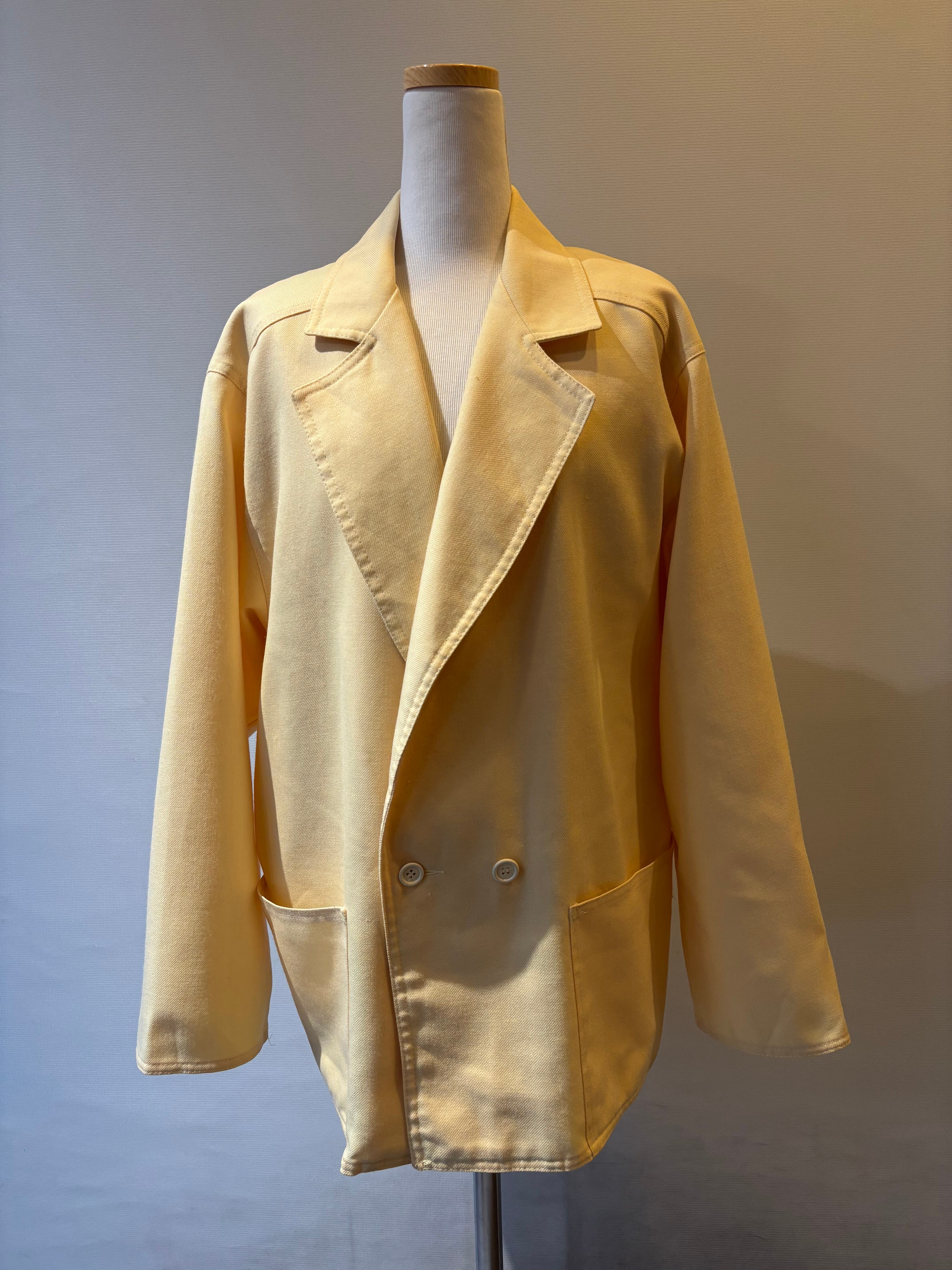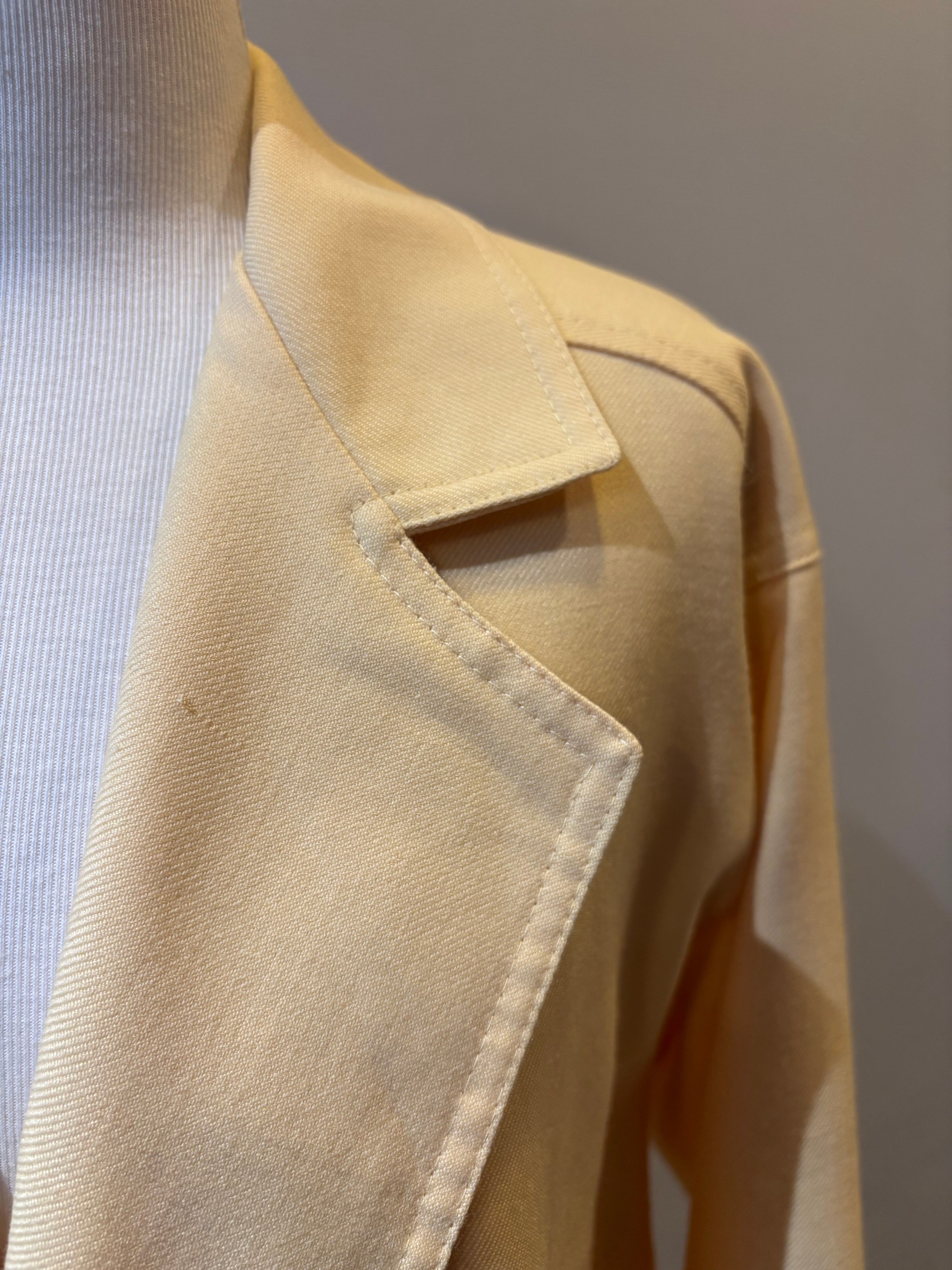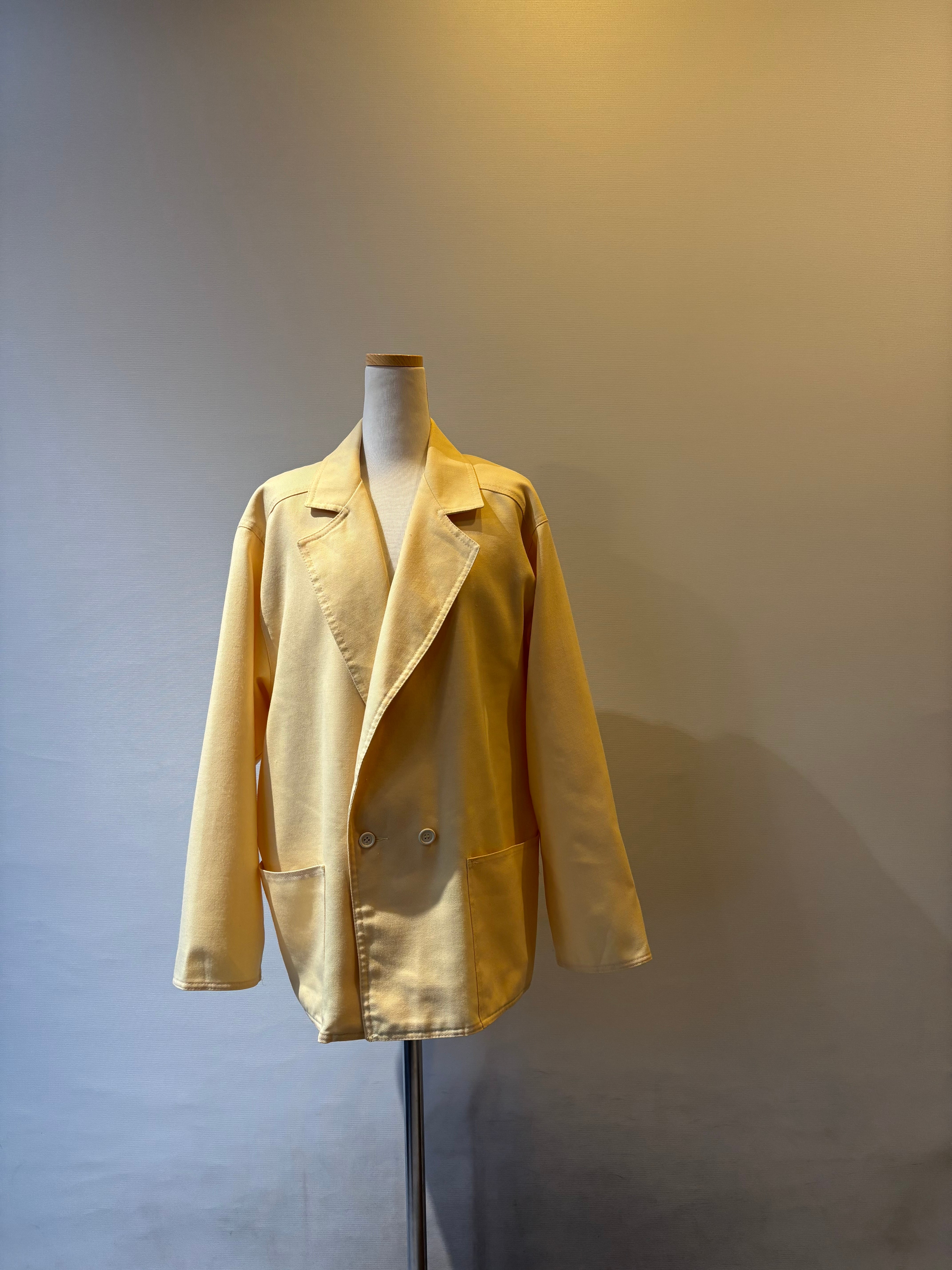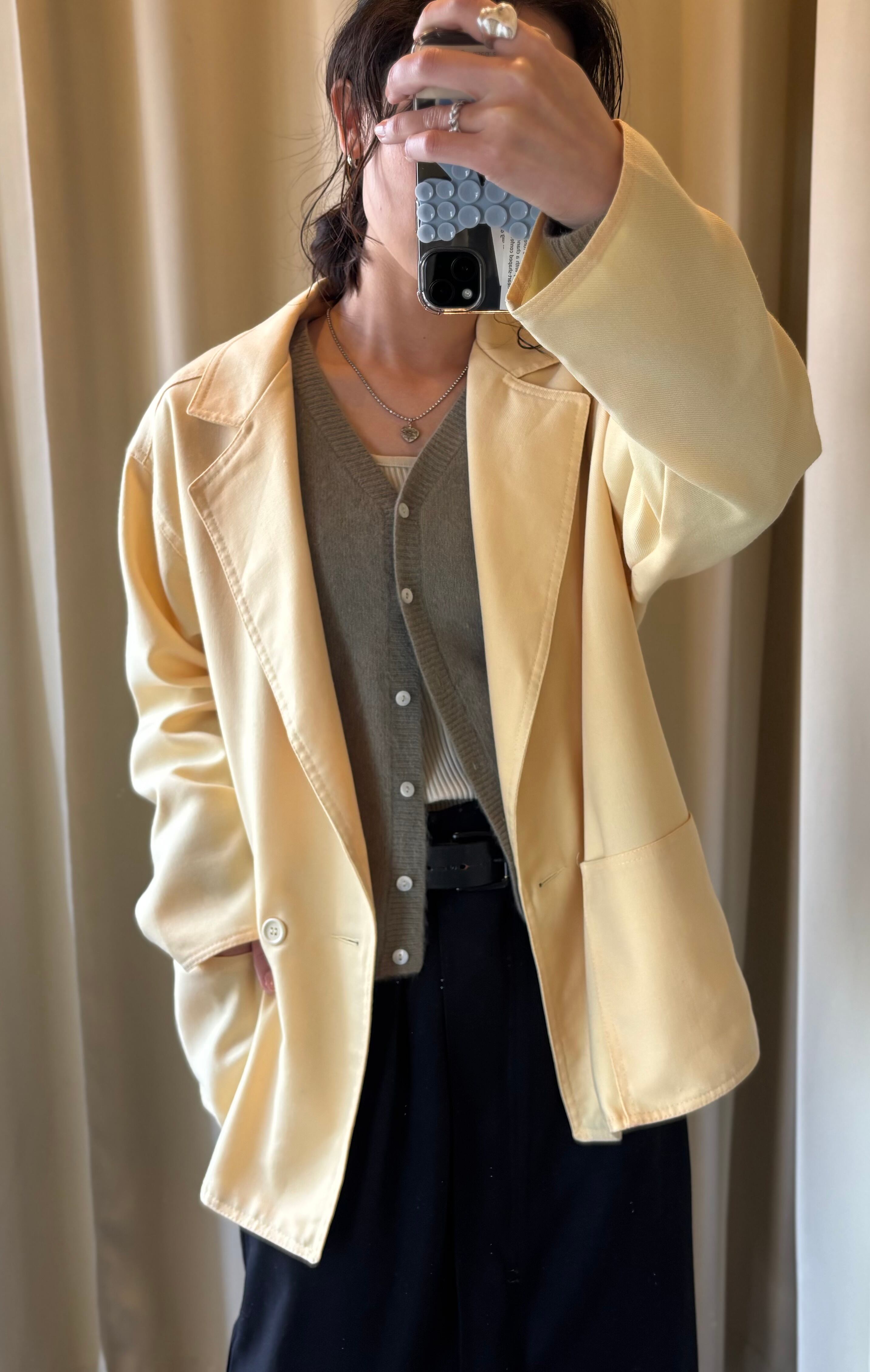 淡いペールイエローが春らしく、軽く羽織るだけでスタイリングが決まる一着。