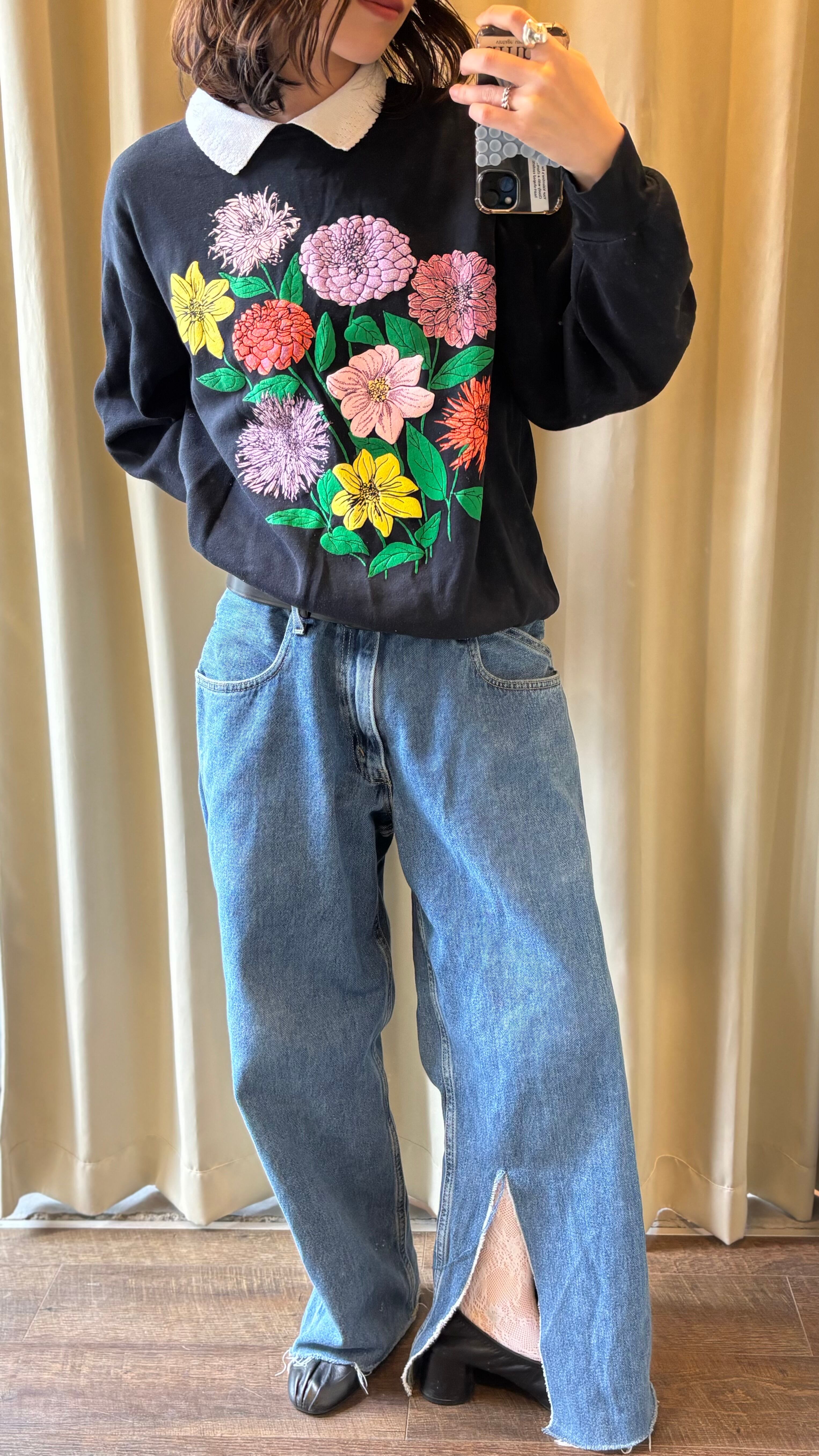 甘くなりがちなフラワープリントも、ブラックボディにより程よく引き締まった印象に。