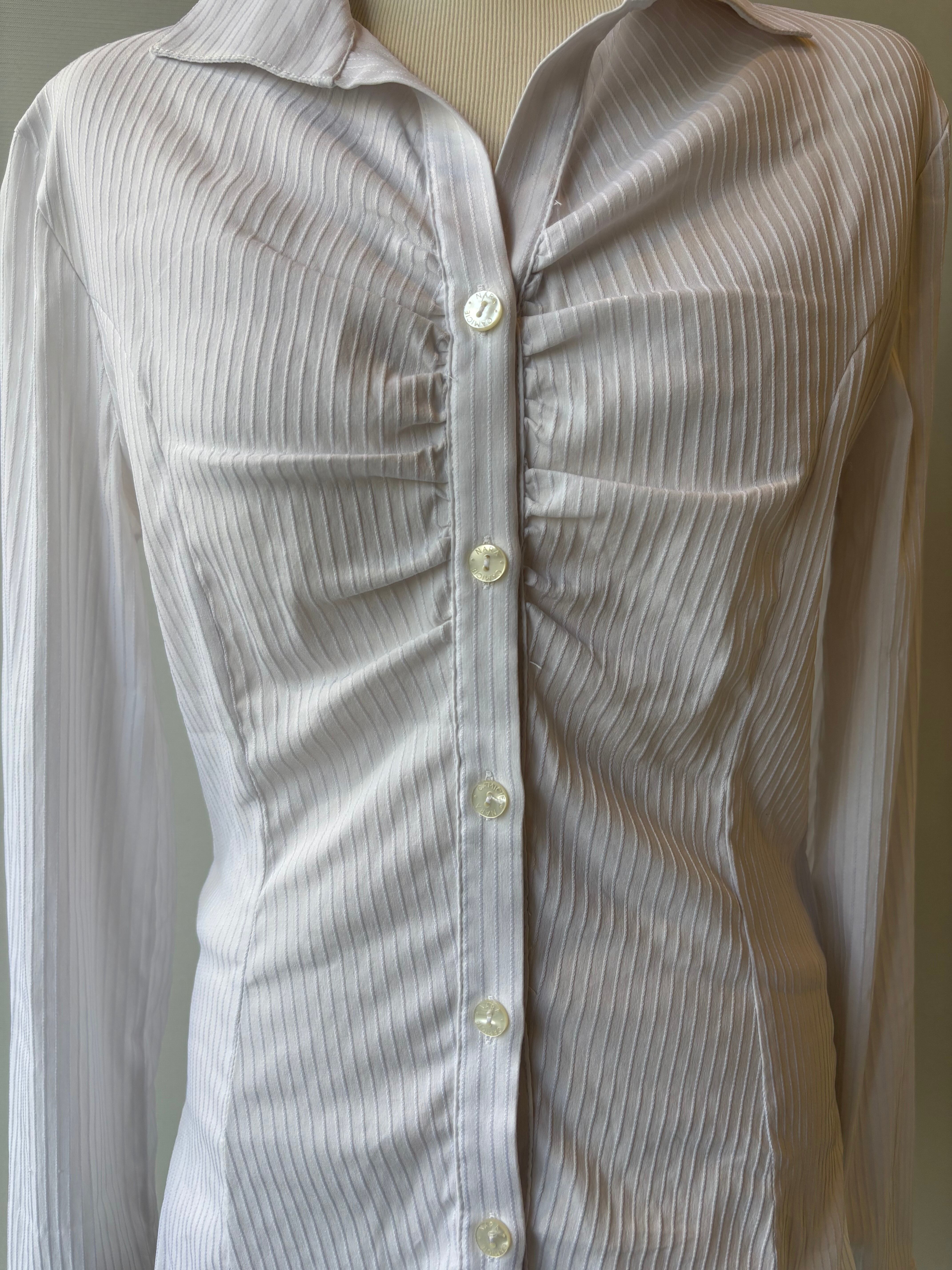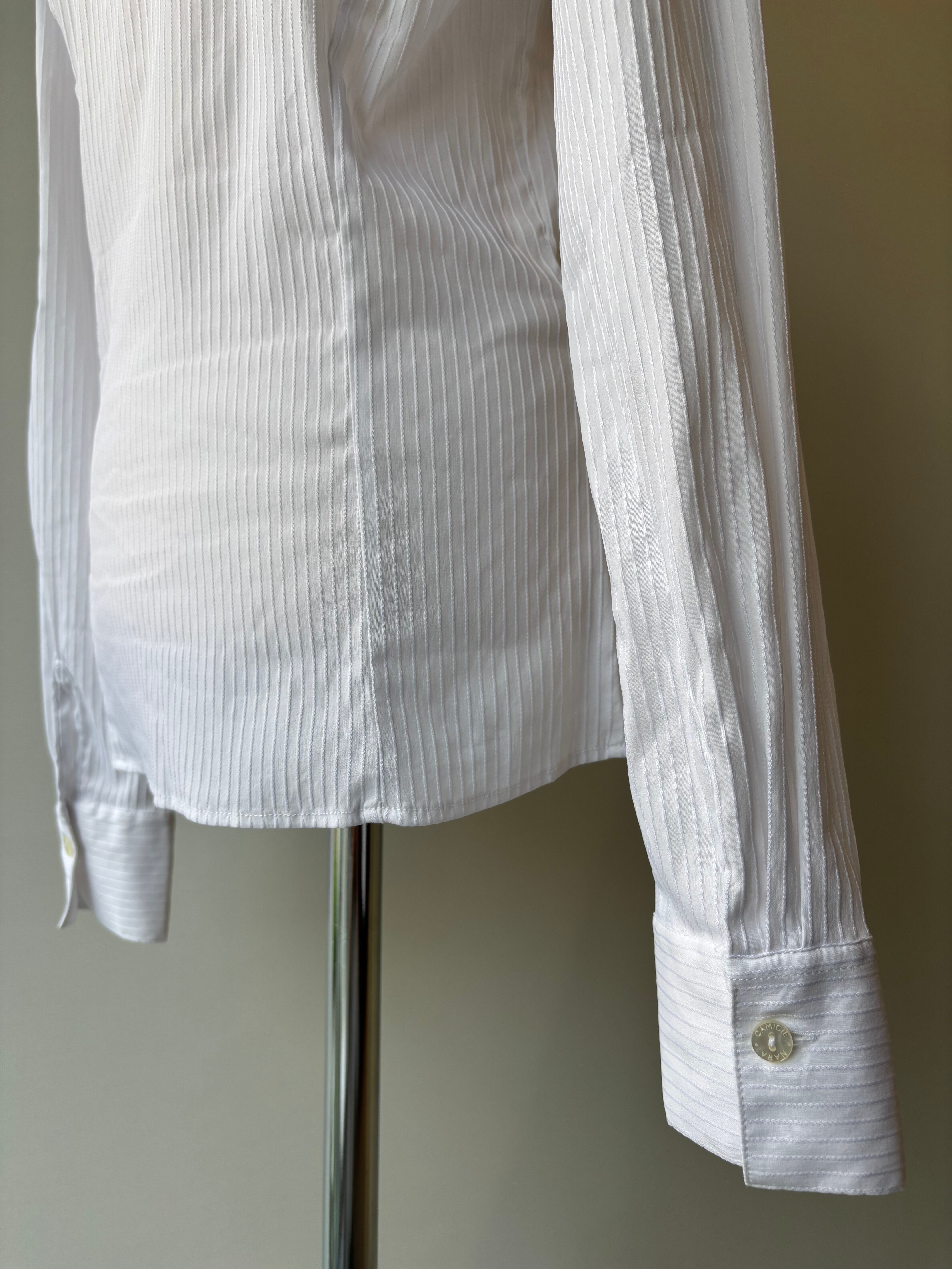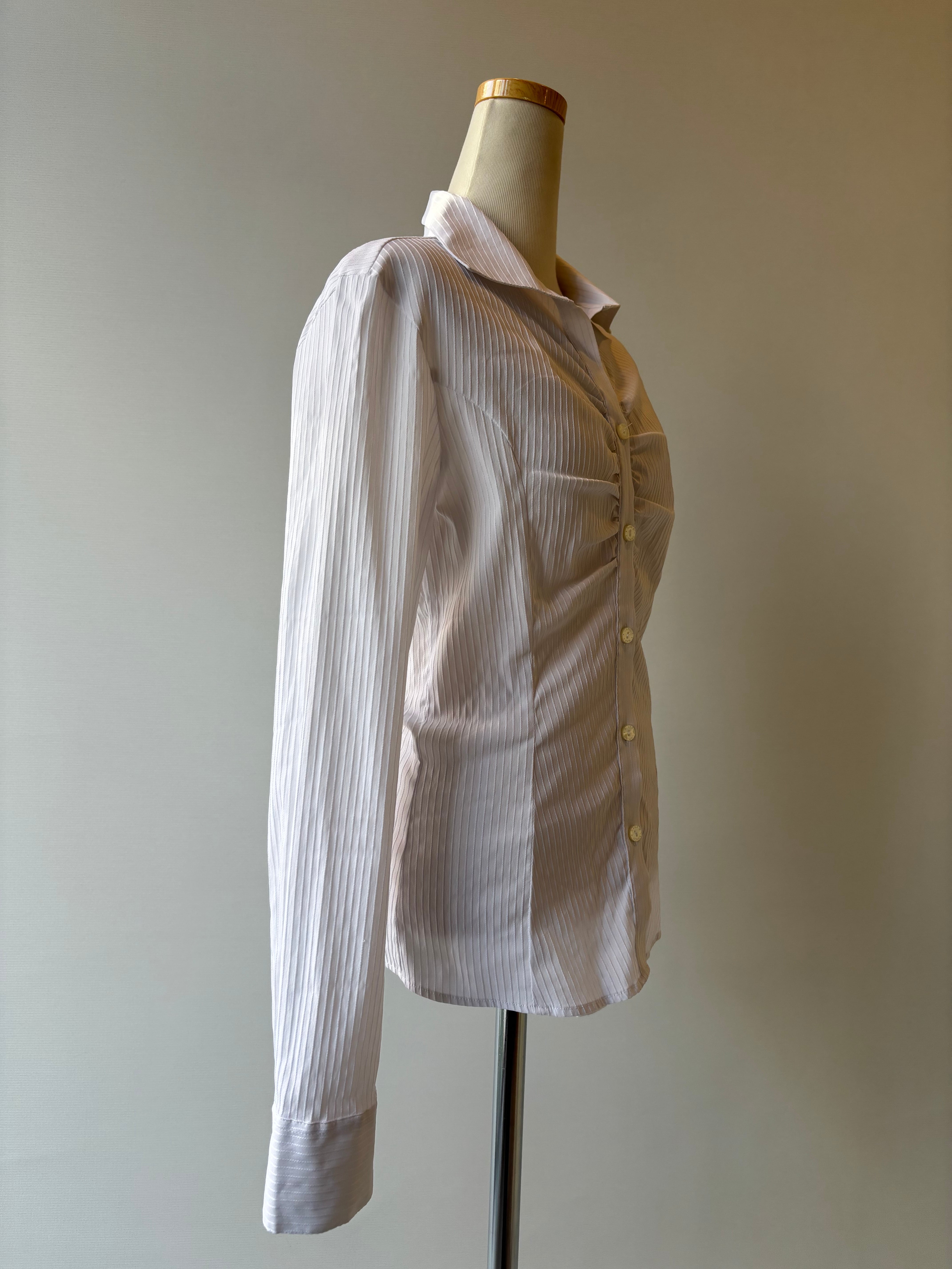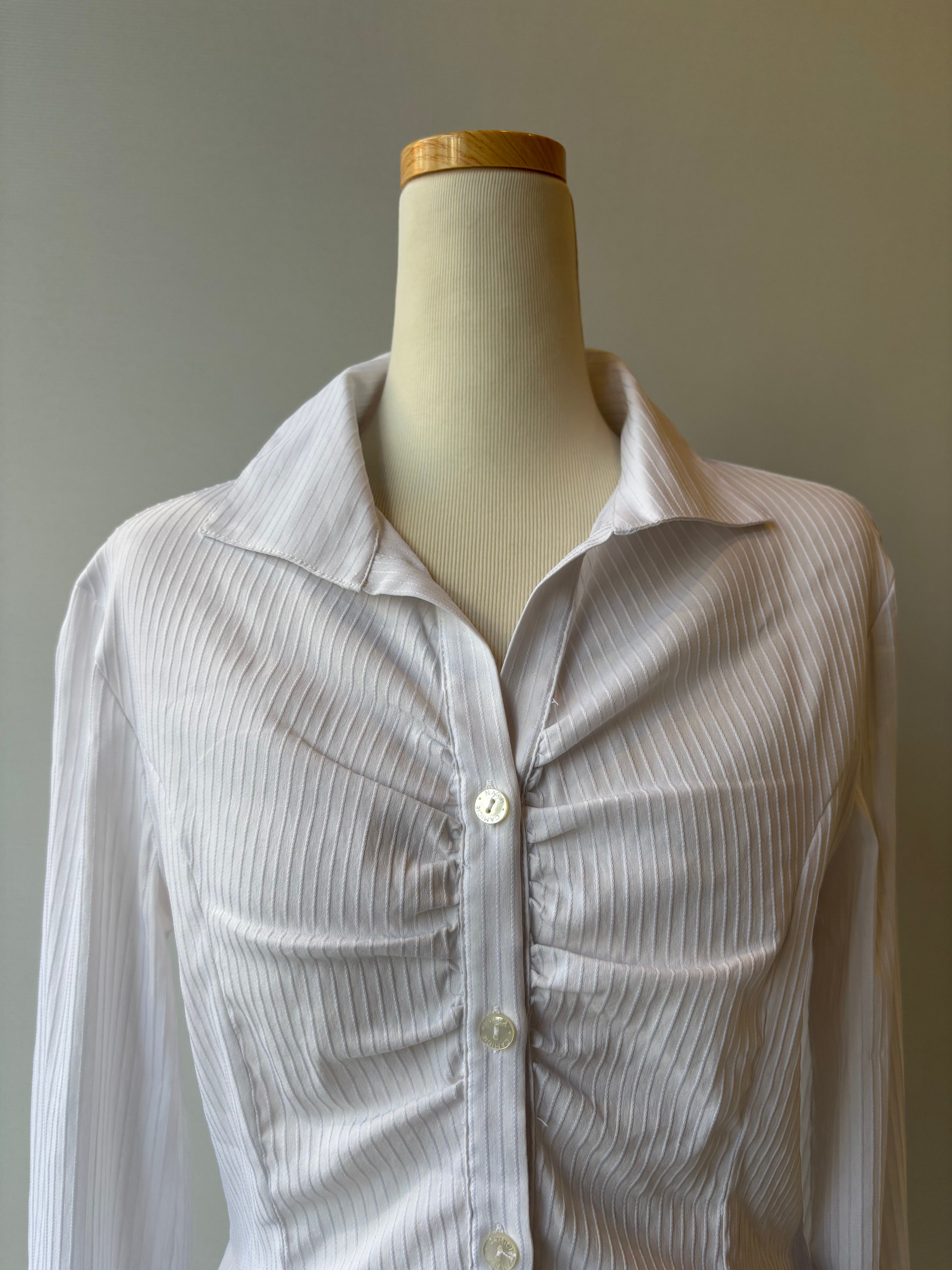 女性らしいシルエットに加え、首元のスキッパーデザインがカジュアルなデニムパンツともバランスよく合わせられる一枚です。