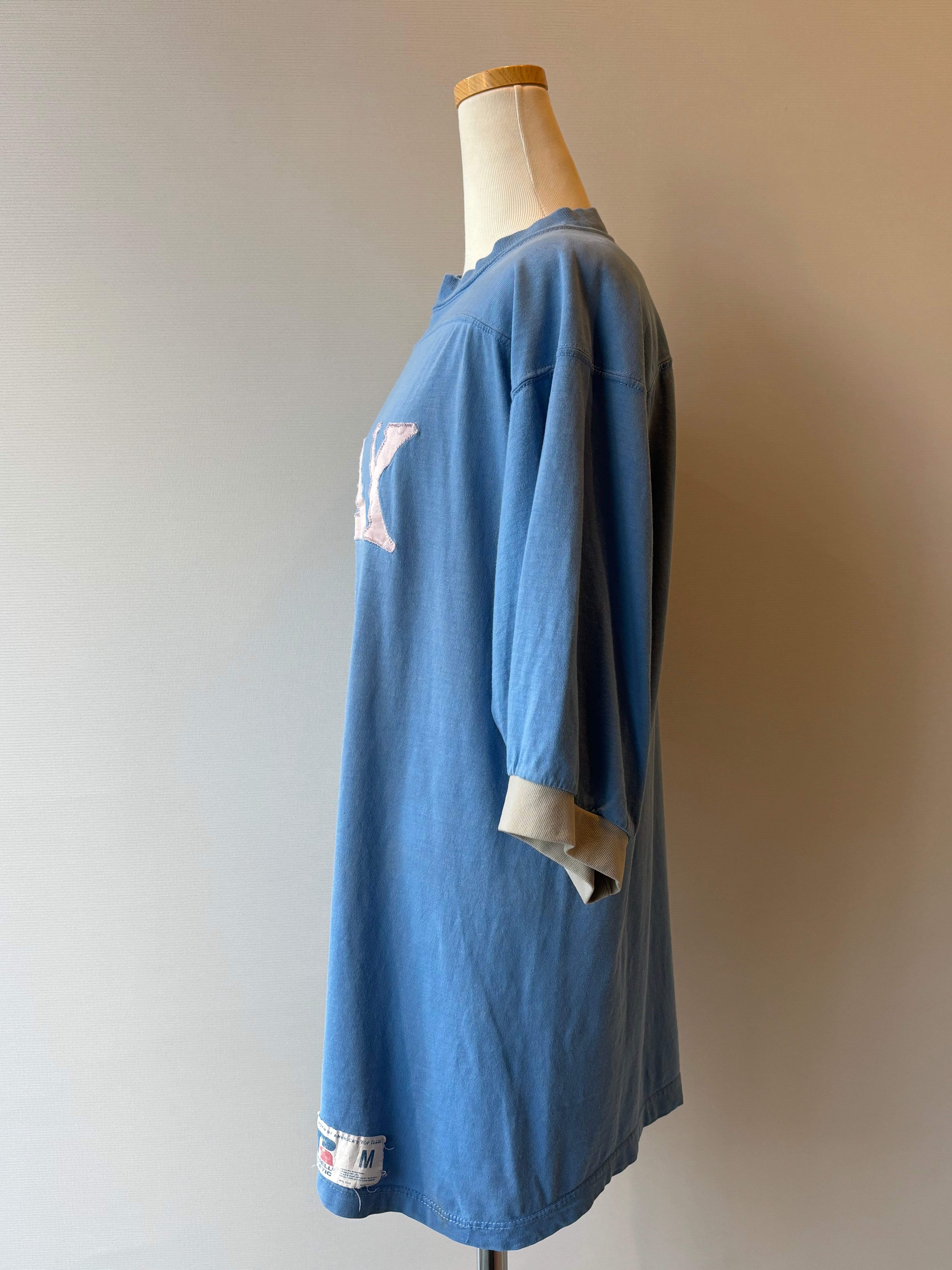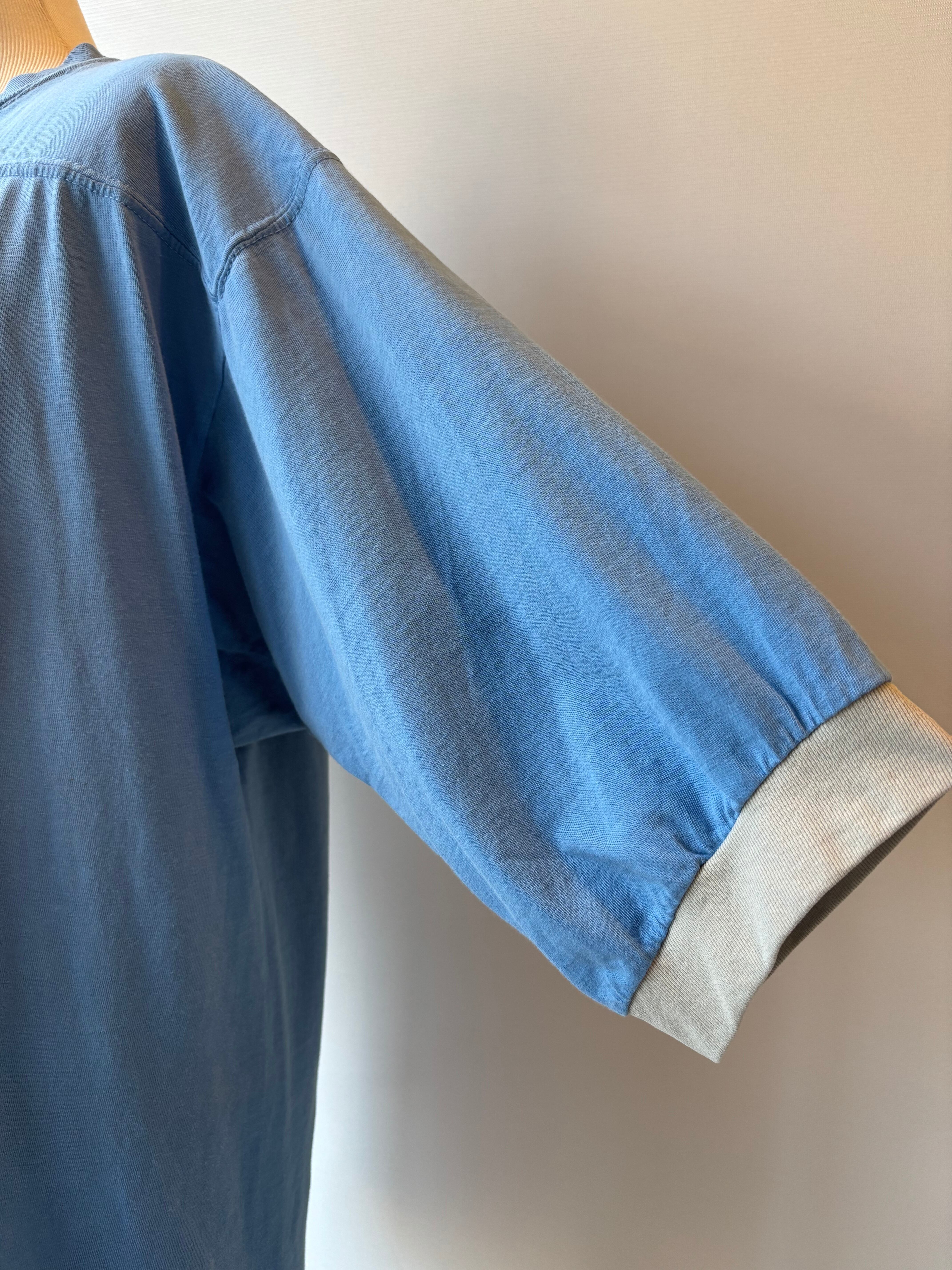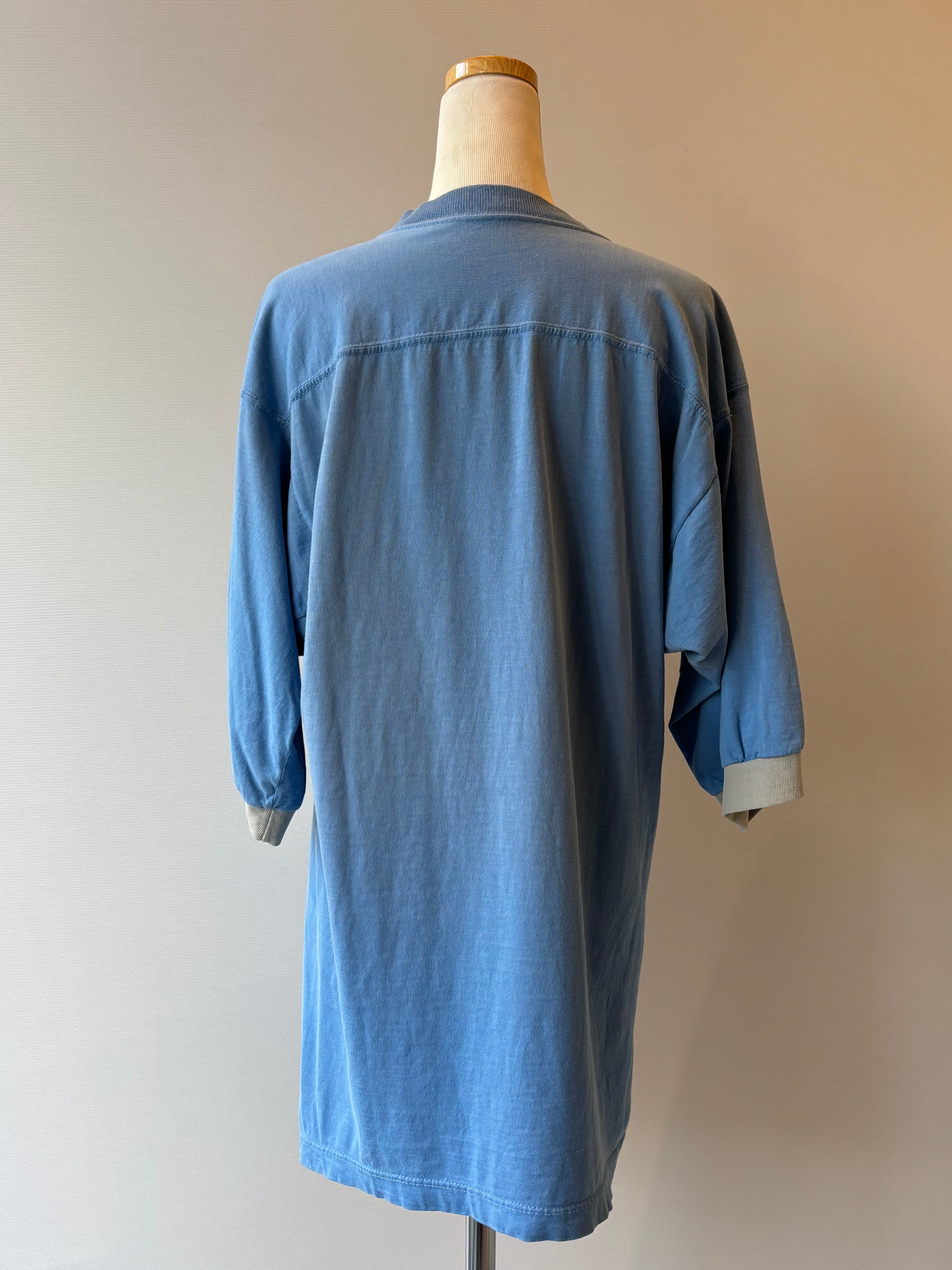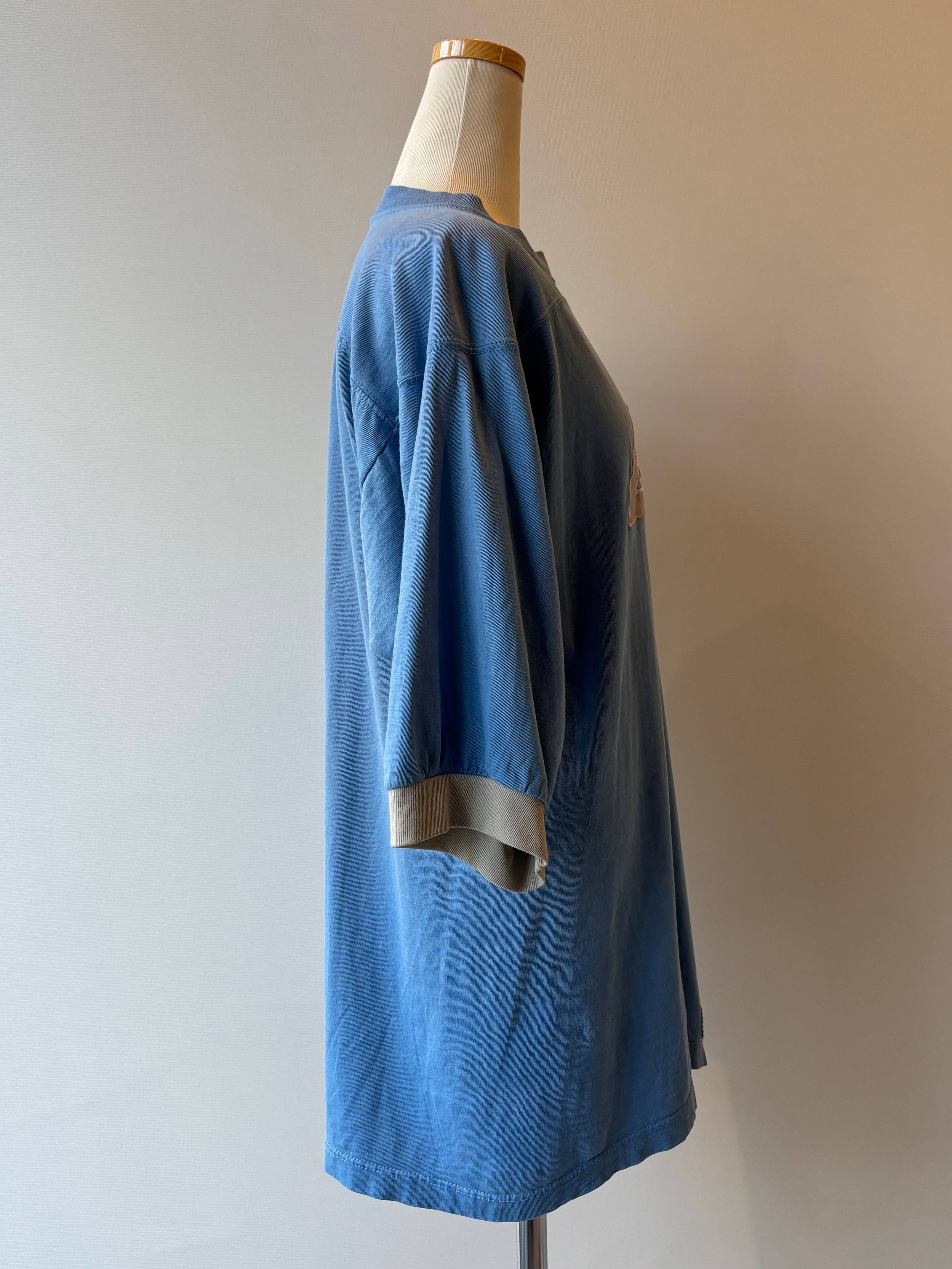 くすみブルーのボディにライトグレーのリブ、アップリケがアクセントになったフットボールTシャツ。