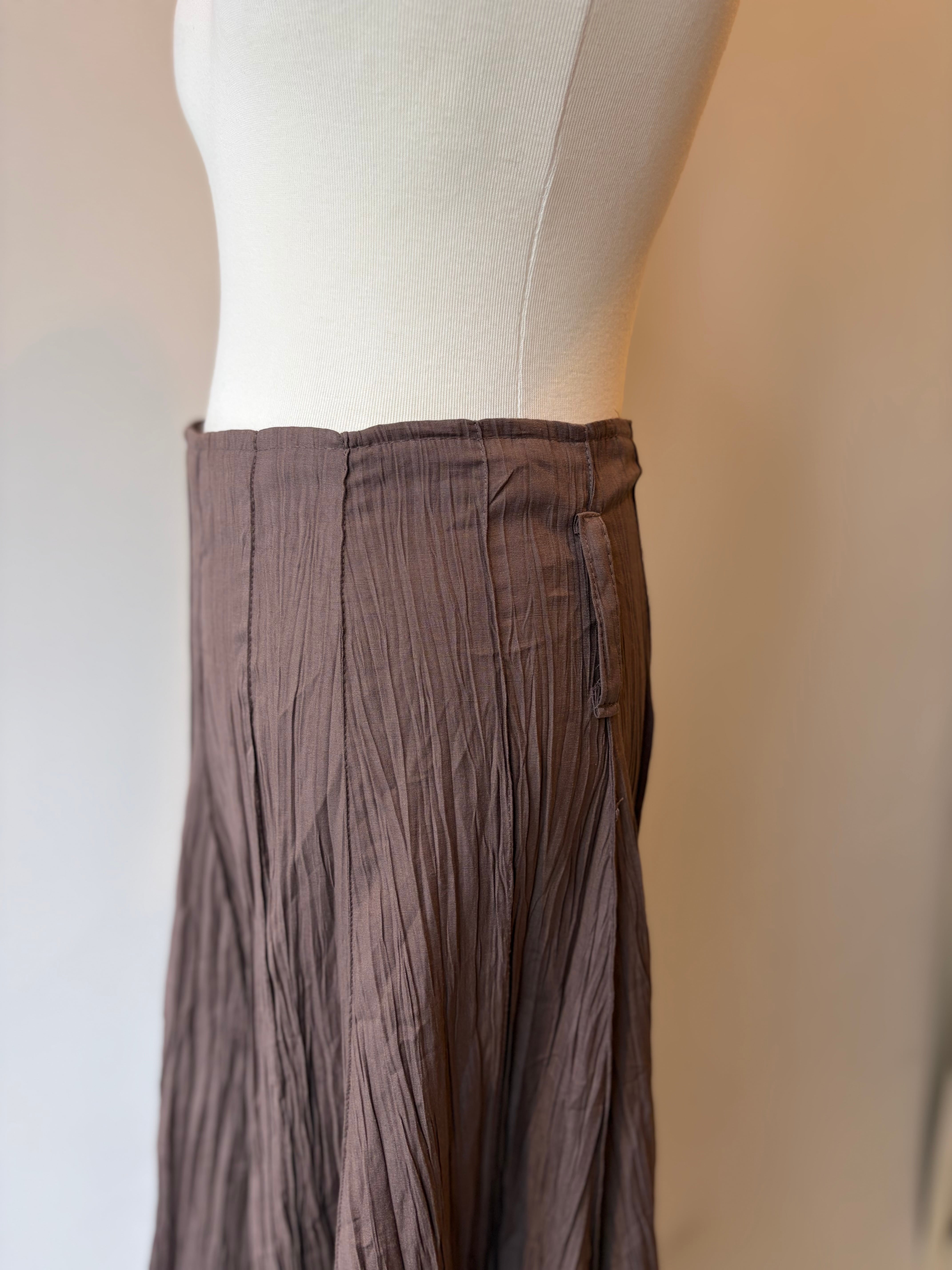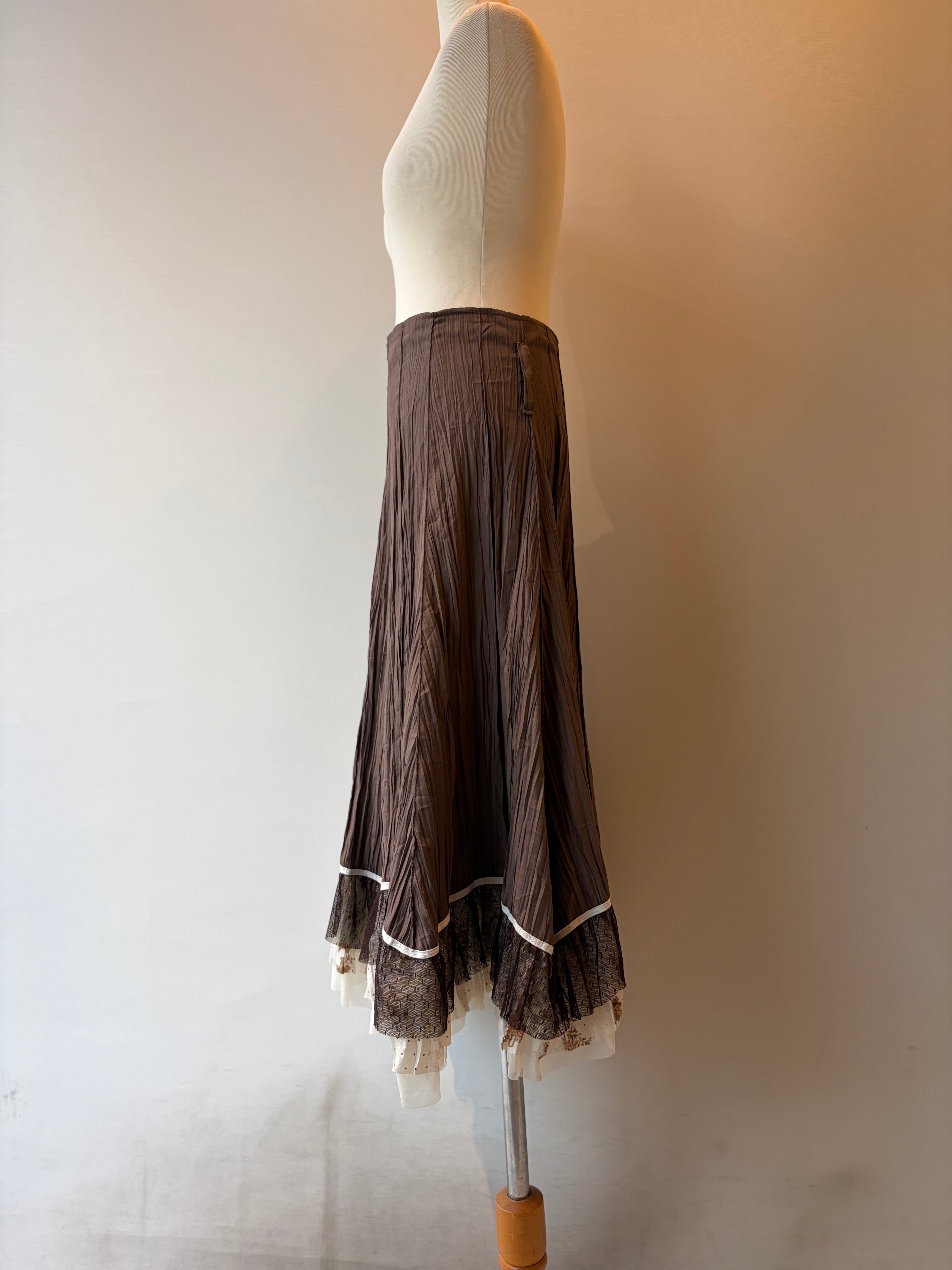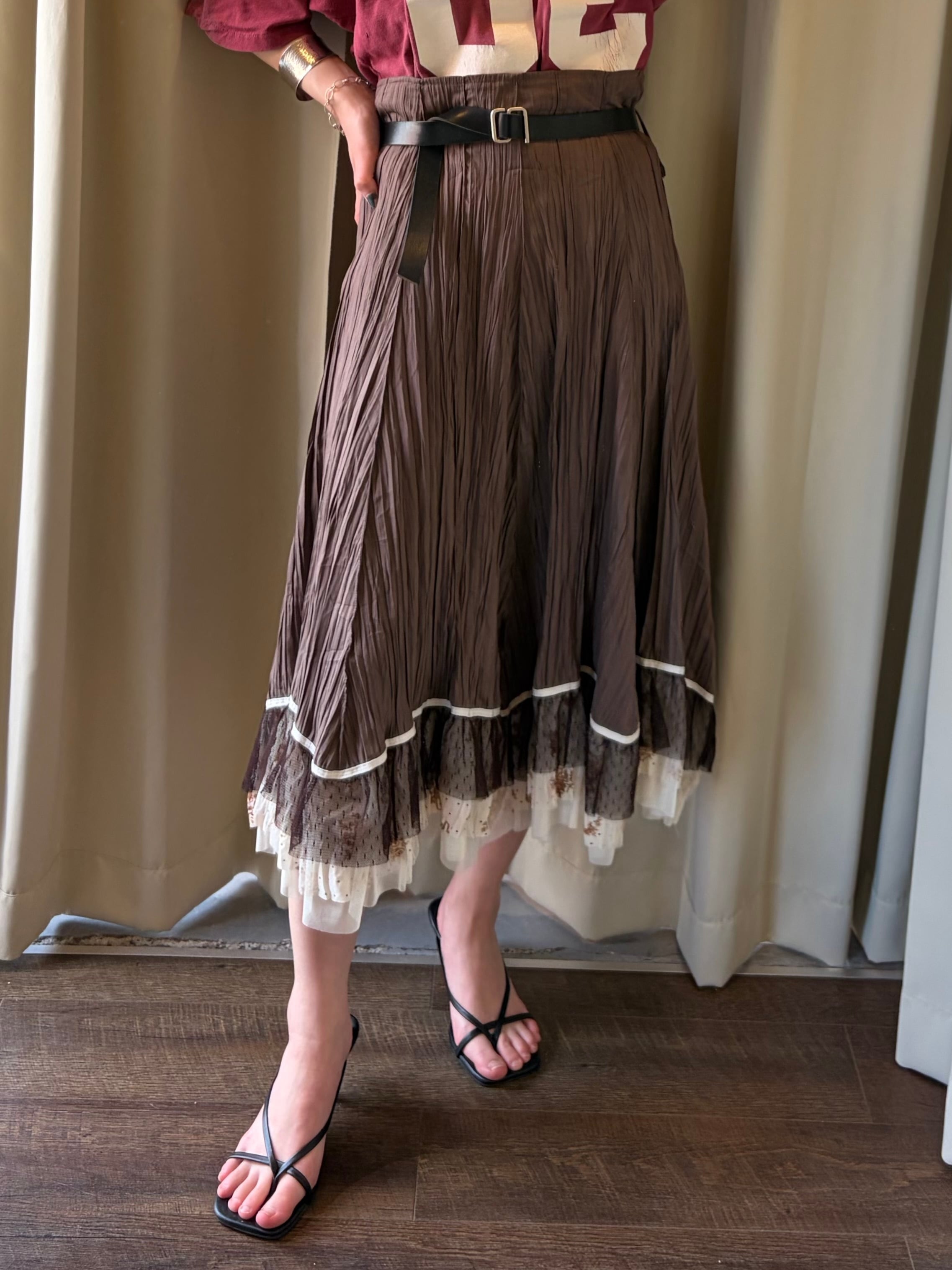シワ加工が施され、裾にチュールフリルがレイヤードされたデザイン。
