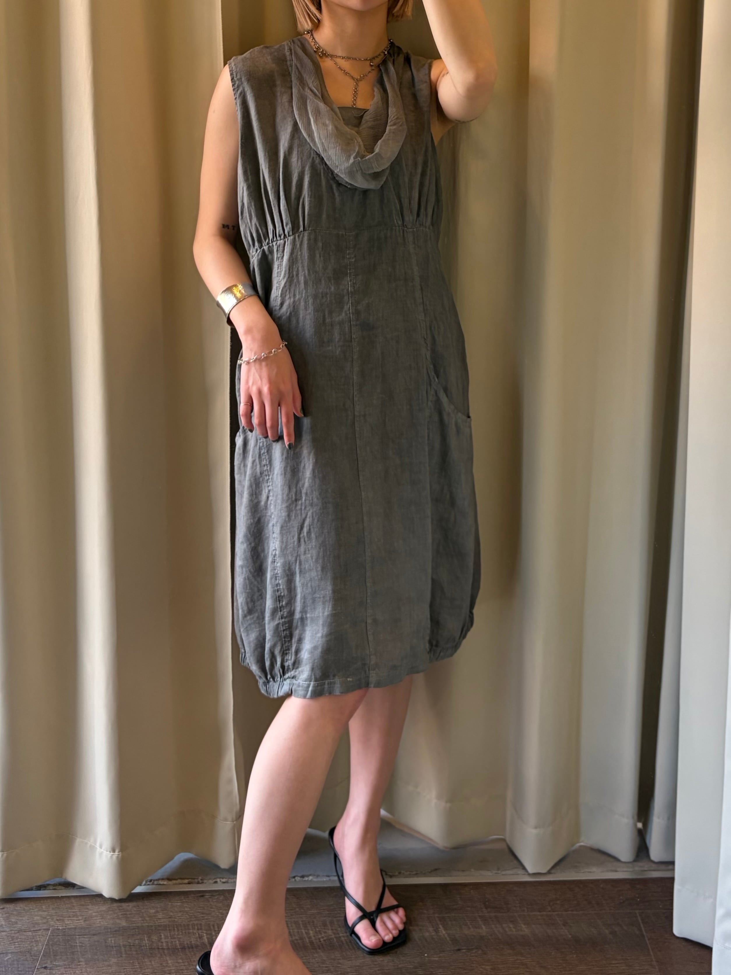 リネン地で仕立てられた、炭黒のワンピース。