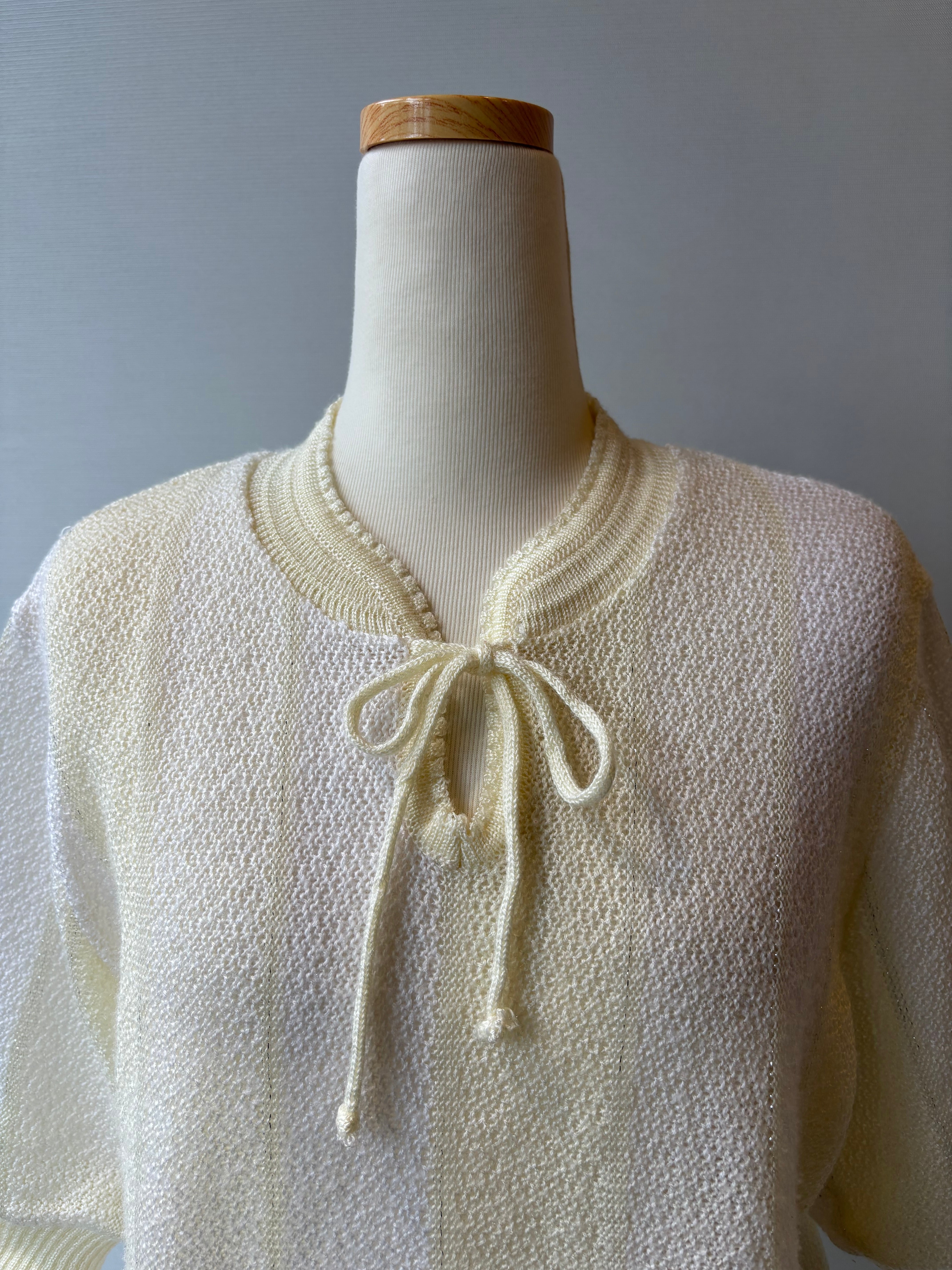 イエロー×ホワイトの太ストライプが目を惹く、首元リボンデザインの半袖ニット。